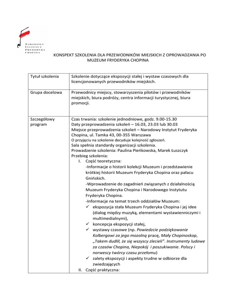KONSPEKT SZKOLENIA DLA PRZEWODNIKÓW MIEJSKICH Z OPROWADZANIA PO MUZEUM FRYDERYKA CHOPINA Tytuł szkolenia Szkolenie dotyczące ekspozycji stałej i wystaw czasowych dla licencjonowanych przewodników miejskich. Grupa docelowa Przewodnicy miejscy, stowarzyszenia pilotów i przewodników miejskich, biura podróży, centra informacji turystycznej, biura promocji. Szczegółowy program Czas trwania: szkolenie jednodniowe, godz. 9.00-15.30 Daty przeprowadzenia szkoleń – 16.03, 23.03 lub 30.03 Miejsce przeprowadzenia szkoleń – Narodowy Instytut Fryderyka Chopina, ul. Tamka 43, 00-355 Warszawa O przyjęciu na szkolenie decyduje kolejność zgłoszeń. Sala spełnia standardy organizacji szkolenia. Prowadzenie szkolenia: Paulina Pieńkowska, Marek Łuszczyk Przebieg szkolenia: I. Część teoretyczna: -Informacje o historii kolekcji Muzeum i przedstawienie krótkiej historii Muzeum Fryderyka Chopina oraz pałacu Gnińskich. -Wprowadzenie do zagadnień związanych z działalnością Muzeum Fryderyka Chopina i Narodowego Instytutu Fryderyka Chopina. -Informacje na temat trzech oddziałów Muzeum: ekspozycja stała Muzeum Fryderyka Chopina i jej idee (dialog między muzyką, elementami wystawienniczymi i multimedialnymi), koncepcja ekspozycji stałej, wystawy czasowe (np. Powiedzcie podziękowanie Kolbergowi za jego mozolną pracę, Mały Chopinoskop, „Takem dudlił, że się wszyscy zlecieli”. Instrumenty ludowe za czasów Chopina, Niepokój i poszukiwanie. Polscy i norwescy twórcy czasu przełomu) zalety ekspozycji i aspekty trudne w odbiorze dla zwiedzających II. Część praktyczna: Cel szkolenia Sposób prowadzenia szkolenia Materiały szkoleniowe Zakończenie szkolenia Oprowadzanie po Muzeum - szczegółowa charakterystyka wszystkich części ekspozycji ze szczególnym uwzględnieniem wątków związanych z muzyką Fryderyka Chopina, jego działalnością pianistyczną i pedagogiczną, zwrócenie uwagi na szczególnie ważne obiekty prezentowane na ekspozycji stałej. III. Pytania i dyskusja IV. Przerwa kawowa, poczęstunek V. Test/Powtórzenie wiadomości VI. Oprowadzanie tematyczne po wystawie stałej Muzeum Fryderyka Chopina VII. Wydanie certyfikatów Poznanie ekspozycji stałej Muzeum Fryderyka Chopina i zdobycie informacji o działalności Muzeum Fryderyka Chopina i Narodowego Instytutu Fryderyka Chopina. Wykład, ćwiczenia. Pomoce – prezentacja multimedialna. Weryfikacja nabytych informacji – test końcowy. 1. materiały na temat dziedzictwa chopinowskiego informacje o kolekcji i ekspozycji stałej 2. biografia i twórczość Fryderyka Chopina (strona internetowa www.chopin.nifc.pl) 3. prezentacja multimedialna z materiałami z części teoretycznej szkolenia Na zakończenie szkolenia każdy uczestnik otrzyma zaświadczenie o odbyciu szkolenia, który uprawnia do bezpłatnych wejść z grupą zwiedzających.