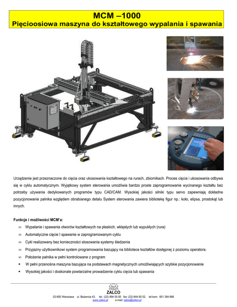 MCM –1000 Pięcioosiowa maszyna do kształtowego wypalania i spawania Urządzenie jest przeznaczone do cięcia oraz ukosowania kształtowego na rurach, zbiornikach. Proces cięcia i ukosowania odbywa się w cyklu automatycznym. Wyjątkowy system sterowania umożliwia bardzo proste zaprogramowanie wycinanego kształtu bez potrzeby używania dedykowanych programów typu CAD/CAM. Wysokiej jakości silniki typu servo zapewniają dokładne pozycjonowanie palnika względem obrabianego detalu System sterowania zawiera bibliotekę figur np.: koło, elipsa, prostokąt lub innych. Funkcje i możliwości MCM’a: • Wypalanie i spawania otworów kształtowych na płaskich, wklęsłych lub wypukłych (rura) • Automatyczne cięcie I spawanie w zaprogramowanym cyklu • Cykl realizowany bez konieczności stosowania systemy śledzenia • Przyjazny użytkownikowi system programowania bazujący na bibliotece kształtów dostępnej z poziomu operatora. • Położenie palnika w pełni kontrolowane z program W pełni przenośna maszyna bazująca na podstawach magnetycznych umożliwiających szybkie pozycjonowanie Wysokiej jakości i doskonale powtarzalne prowadzenie cyklu cięcia lub spawania ZALCO 02-892 Warszawa ul. Bażancia 43, tel.: (22) 894 55 00 fax: (22) 644 65 52, tel.kom. 601 384 666 www.zalco.pl e-mail: [email protected] DANE TECHNICZNE MCM-1000 Zasialnie 230V 50-60 Hz, Zapotrzebowanie mocy Minimalna zewnętrzna średnica rury Standardowy zakres roboczy* 3000 W 3500 mm 1000 x 1000 mm *) na zamówienie dostępne inne wymiary Zakres uchylania palnika ±45° Maksymalna szybkość ruchu palnika 2.0 m/min Waga ok 520 kg Wymiary: D x S x W 2595 x 2025 x 2050 mm Ilość kontrolowanych osi 5 Ręczny panel sterowania standard Cięcie: • Acetylenowo-tlenowe • Plazma standard opcja Spawanie SAW/GMAW/FCAW/MCAW na życzenie ZALCO 02-892 Warszawa ul. Bażancia 43, tel.: (22) 894 55 00 fax: (22) 644 65 52, tel.kom. 601 384 666 www.zalco.pl e-mail: [email protected]