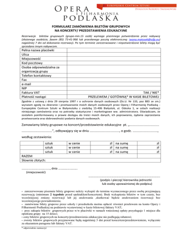 FORMULARZ ZAMÓWIENIA BILETÓW GRUPOWYCH NA KONCERTY/ PRZEDSTAWIENIA EDUKACYJNE Rezerwacja biletów grupowych (grupa-min.15 osób) wymaga pisemnego potwierdzenia przez nabywcę (złożonego osobiście, faxem (85) 73-41-966 lub przesłanego pocztą elektroniczną: [email protected]) najpóźniej 7 dni od dokonania rezerwacji. Po tym terminie zarezerwowane i niepotwierdzone bilety mogą być sprzedane innym nabywcom. Pełna nazwa placówki Ulica Miejscowość Kod pocztowy Osoba odpowiedzialna za organizację grupy Telefon kontaktowy Fax e-mail NIP Faktura VAT Płatność nastąpi TAK / NIE* PRZELEWEM / GOTÓWKĄ* W KASIE BILETOWEJ Zgodnie z ustawą z dnia 29 sierpnia 1997 r o ochronie danych osobowych (Dz.U. Nr 133, poz 883 ze zm.) wyrażam zgodę na zbieranie i przetwarzanie moich danych osobowych przez Operę i Filharmonię Podlaską Europejskie Centrum Sztuki w Białymstoku z siedzibą 15-406 Białystok, ul. Odeska 1, w celach realizacji niniejszego zamówienia oraz na potrzeby statystyczne i marketingowe ww. administratora. Oświadczam, że zostałem poinformowany o prawie dostępu do treści moich danych, ich poprawiania, żądania zaprzestania przetwarzania oraz dobrowolności podania danych osobowych. Zamawiamy bilety grupowe na koncert/przedstawienie edukacyjne pt. „................................ .................................”, odbywający się w dniu ................................, o godz. ..........................., według zestawienia: sztuk sztuk sztuk w cenie w cenie w cenie zł na sumę zł na sumę zł na sumę zł zł zł RAZEM Słownie złotych: …………………………......, dnia ……………………. (miejscowość) …………………………………………………………………………. (podpis i pieczęć kierownika jednostki lub osoby upoważnionej do podpisu) - zarezerwowane pisemnie bilety grupowe należy wykupić do terminu wyznaczonego przez osobę przyjmującą rezerwację (minimum 2 tygodnie przed spektaklem/koncertem). Brak wykupienia biletów w tym czasie, bez wcześniejszej zmiany rezerwacji lub jej anulowania ,skutkować będzie anulowaniem rezerwacji bez wcześniejszego powiadomienia; - zamówione bilety grupowe przez szkoły i przedszkola można opłacić również przelewem na konto Opery i Filharmonii Podlaskiej na podstawie wystawionej w kasie biletowej faktury VAT; - przy zakupie biletów grupowych przez w/w placówki w ramach wniesionej opłaty przysługuje 1 miejsce dla opiekuna grupy na 15 dzieci; - ceny biletów grupowych na koncerty/przedstawienia edukacyjne nie podlegają rabatowi; - zwroty biletów grupowych przyjmowane będą najpóźniej 3 dni przed koncertem/przedstawieniem, wyłącznie za okazaniem paragonu lub faktury VAT. * odpowiednie zaznaczyć
