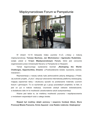 Międzynarodowe Forum w Pampelunie W dniach 13-15 listopada trójka uczniów II LO, z klasy z maturą międzynarodową: Tomasz Bachosz, Jan Michniewicz i Agnieszka Rudzińska, wzięła udział w 13-tym Międzynarodowym Forum, które jest corocznie organizowane przez Uniwersytet Navarry w Pampelunie w Hiszpanii. Temat tegorocznego wydarzenia brzmiał „Reshaping the World: Challenges, Opportunities, Dreams” („Przekształcanie świata: wyzwania, szanse, marzenia”). Reprezentacja z naszej szkoły była jednocześnie jedyną delegacją z Polski. Jej autorski projekt, „A plus”, dotyczył utworzenia internetowej platformy edukacyjnej, mającej zapewniać łatwy i skuteczny sposób na powtarzanie materiału uczniom liceum i gimnazjum. To co wyróżniało go z grupy pozostałych projektów, to fakt, iż jest on już w trakcie realizacji. Uczniowie zdobyli ciekawe doświadczenie, a dodatkowo dało im to możliwość udoskonalenia sztuki autoprezentacji. Ważne jest także to, że mieliśmy możliwość poznania i współpracowania z mnóstwem wspaniałych ludzi z całego świata. Wyjazd był możliwy dzięki pomocy i wsparciu fundacji Altum, Biura Promocji Miasta Poznania, firmie Aquanet oraz Radzie rodziców. Dziękujemy!