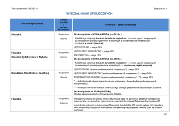 Załącznik nr 1 Rok akademicki 2013/2014 WYDZIAŁ NAUK SPOŁECZNYCH Kierunek/specjalność Filozofia Forma studiów i poziom kształcenia Stacjonarne I stopnia Kryterium – zakres kwalifikacji Dla kandydatów z NOWĄ MATURĄ (od 2010 r.) Kwalifikacja obejmuje konkurs świadectw dojrzałości — brane są pod uwagę wyniki ze wskazanych poniżej egzaminów maturalnych z przedmiotów obowiązkowych — uzyskane w części pisemnej: JĘZYK POLSKI – waga 50% Filozofia Ośrodek Dydaktyczny w Rybniku Stacjonarne I stopnia JĘZYK OBCY NOWOŻYTNY – waga 40% MATEMATYKA – waga 10% Dla kandydatów z NOWĄ MATURĄ (do 2009 r.) Kwalifikacja obejmuje konkurs świadectw dojrzałości — brane są pod uwagę wyniki ze wskazanych poniżej egzaminów maturalnych — uzyskane w części pisemnej: JĘZYK POLSKI (poziom podstawowy lub rozszerzony*) – waga 50% Doradztwo filozoficzne i coaching Stacjonarne I stopnia JĘZYK OBCY NOWOŻYTNY (poziom podstawowy lub rozszerzony*) – waga 30% PRZEDMIOT DO WYBORU (poziom podstawowy lub rozszerzony*, **) – waga 20% * - Jeśli Kandydat zdawał egzamin na obu poziomach – brany będzie pod uwagę wynik korzystniejszy; ** - Kandydat nie może wskazać dwa razy tego samego przedmiotu na tym samym poziomie. Dla kandydatów ze STARĄ MATURĄ Według zasad przyjętych w Uniwersytecie Śląskim Filozofia Stacjonarne II stopnia Przyjęcia na studia do granicy limitu odbywać się będą na podstawie złożenia wymaganych dokumentów, po uprzednim zgłoszeniu w systemie Internetowej Rejestracji Kandydatów UŚ. Jeżeli liczba zgłoszeń w Internetowej Rejestracji Kandydatów UŚ będzie wyższa niż zakładany limit, kwalifikacja wszystkich kandydatów odbędzie się na podstawie średniej ocen ze studiów wyższych. 100 Załącznik nr 1 Rok akademicki 2013/2014 Filozofia Niestacjonarne I stopnia Filozofia Niestacjonarne Ośrodek Dydaktyczny w Rybniku I stopnia Doradztwo filozoficzne i coaching Niestacjonarne I stopnia Filozofia Niestacjonarne II stopnia Praca socjalna Stacjonarne I stopnia Socjologia Stacjonarne I stopnia Przyjęcia na studia do granicy limitu odbywać się będą na podstawie złożenia wymaganych dokumentów, po uprzednim zgłoszeniu w systemie Internetowej Rejestracji Kandydatów UŚ. Przyjęcia na studia do granicy limitu odbywać się będą na podstawie złożenia wymaganych dokumentów, po uprzednim zgłoszeniu w systemie Internetowej Rejestracji Kandydatów UŚ. W przypadku przekroczenia limitu: kwalifikacja obejmuje konkurs świadectw dojrzałości na zasadach jak na studia stacjonarne I stopnia Doradztwo filozoficzne i coaching. Przyjęcia na studia do granicy limitu odbywać się będą na podstawie złożenia wymaganych dokumentów, po uprzednim zgłoszeniu w systemie Internetowej Rejestracji Kandydatów UŚ. Jeżeli liczba zgłoszeń w Internetowej Rejestracji Kandydatów UŚ będzie wyższa niż zakładany limit, kwalifikacja wszystkich kandydatów odbędzie się na podstawie średniej ocen ze studiów wyższych. Dla kandydatów z NOWĄ MATURĄ od 2010 Kwalifikacja obejmuje konkurs świadectw dojrzałości — brane są pod uwagę wyniki ze wskazanych poniżej egzaminów maturalnych z przedmiotów obowiązkowych, uzyskane w części pisemnej. Język polski Język obcy Matematyka waga = 50% waga = 40% waga = 10% Dla kandydatów z NOWĄ MATURĄ 2005-2009 Kwalifikacja obejmuje konkurs świadectw dojrzałości — brane są pod uwagę wyniki ze wskazanych poniżej egzaminów maturalnych — uzyskane w części pisemnej. Język polski Język obcy Przedmiot do wyboru*) poziom podstawowy albo rozszerzony** poziom podstawowy albo rozszerzony** poziom podstawowy albo rozszerzony** waga = 35% waga = 30% waga = 35% 101 Załącznik nr 1 Rok akademicki 2013/2014 Socjologia Ośrodek Dydaktyczny w Rybniku Stacjonarne I stopnia *) Nie można wskazać dwa razy tego samego przedmiotu na tym samym poziomie; **) Oceny z poziomu podstawowego zostaną pomnożone przez współczynnik 0,5. Jeśli na świadectwie dojrzałości widnieje wynik egzaminu maturalnego złożonego na poziomie podstawowym i rozszerzonym, przyjmuje się korzystniejszy dla kandydata wariant. Dla kandydatów ze STARĄ MATURĄ Według zasad przyjętych w Uniwersytecie Śląskim. Socjologia specjalności: Stacjonarne II stopnia Przyjęcia na studia do granicy limitu odbywać się będą na podstawie złożenia wymaganych dokumentów, po uprzednim zgłoszeniu w systemie Internetowej Rejestracji Kandydatów UŚ. socjologia (program ogólny) studia miejskie Jeżeli liczba zgłoszeń w Internetowej Rejestracji Kandydatów UŚ będzie wyższa niż zakładany limit, kwalifikacja wszystkich kandydatów odbędzie się na podstawie średniej ocen ze studiów wyższych. komunikacja społeczna organizowanie społeczności lokalnej zarządzanie pracą socjalną i ekonomia społeczna Praca socjalna Niestacjonarne I stopnia Przyjęcia na studia do granicy limitu odbywać się będą na podstawie złożenia wymaganych dokumentów, po uprzednim zgłoszeniu w systemie Internetowej Rejestracji Kandydatów UŚ. Jeżeli liczba zgłoszeń w Internetowej Rejestracji Kandydatów UŚ będzie wyższa niż zakładany limit, kwalifikacja wszystkich kandydatów odbędzie się na podstawie konkursu świadectw dojrzałości — brane są pod uwagę wyniki ze wskazanych poniżej egzaminów maturalnych z przedmiotów obowiązkowych, uzyskane w części pisemnej. Dla kandydatów z NOWĄ MATURĄ od 2010 102 Załącznik nr 1 Rok akademicki 2013/2014 Socjologia Niestacjonarne Język polski Język obcy Matematyka I stopnia waga = 50% waga = 40% waga = 10% Dla kandydatów z NOWĄ MATURĄ 2005-2009 Kwalifikacja obejmuje konkurs świadectw dojrzałości — brane są pod uwagę wyniki ze wskazanych poniżej egzaminów maturalnych — uzyskane w części pisemnej. Socjologia Ośrodek Dydaktyczny w Rybniku Niestacjonarne I stopnia Język polski Język obcy Przedmiot do wyboru*) poziom podstawowy albo rozszerzony** poziom pods