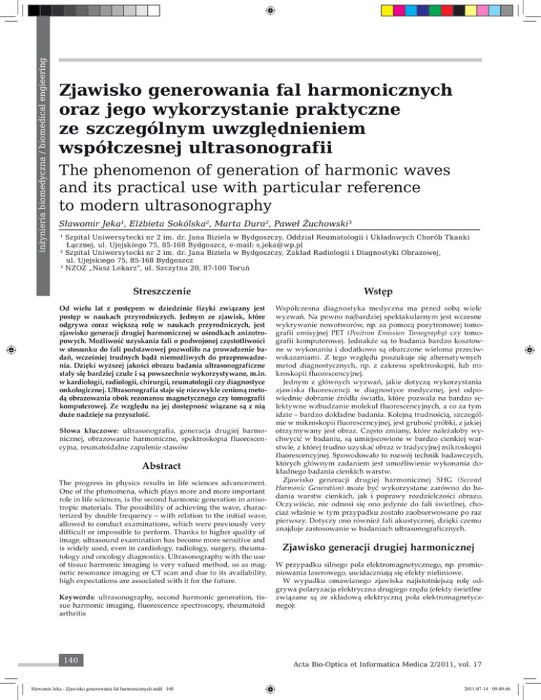 inżynieria biomedyczna / biomedical engieering Zjawisko generowania fal harmonicznych oraz jego wykorzystanie praktyczne ze szczególnym uwzględnieniem współczesnej ultrasonografii The phenomenon of generation of harmonic waves and its practical use with particular reference to modern ultrasonography Sławomir Jeka¹, Elżbieta Sokólska², Marta Dura², Paweł Żuchowski³ ¹ Szpital Uniwersytecki nr 2 im. dr. Jana Biziela w Bydgoszczy, Oddział Reumatologii i Układowych Chorób Tkanki Łącznej, ul. Ujejskiego 75, 85-168 Bydgoszcz, e-mail: [email protected] ² Szpital Uniwersytecki nr 2 im. dr. Jana Biziela w Bydgoszczy, Zakład Radiologii i Diagnostyki Obrazowej, ul. Ujejskiego 75, 85-168 Bydgoszcz ³ NZOZ „Nasz Lekarz”, ul. Szczytna 20, 87-100 Toruń Streszczenie Wstęp Od wielu lat z postępem w dziedzinie fizyki związany jest postęp w naukach przyrodniczych. Jednym ze zjawisk, które odgrywa coraz większą rolę w naukach przyrodniczych, jest zjawisko generacji drugiej harmonicznej w ośrodkach anizotropowych. Możliwość uzyskania fali o podwojonej częstotliwości w stosunku do fali podstawowej pozwoliło na prowadzenie badań, wcześniej trudnych bądź niemożliwych do przeprowadzenia. Dzięki wyższej jakości obrazu badania ultrasonograficzne stały się bardziej czułe i są powszechnie wykorzystywane, m.in. w kardiologii, radiologii, chirurgii, reumatologii czy diagnostyce onkologicznej. Ultrasonografia staje się niezwykle cenioną metodą obrazowania obok rezonansu magnetycznego czy tomografii komputerowej. Ze względu na jej dostępność wiązane są z nią duże nadzieje na przyszłość. Współczesna diagnostyka medyczna ma przed sobą wiele wyzwań. Na pewno najbardziej spektakularnym jest wczesne wykrywanie nowotworów, np. za pomocą pozytronowej tomografii emisyjnej PET (Positron Emission Tomography) czy tomografii komputerowej. Jednakże są to badania bardzo kosztowne w wykonaniu i dodatkowo są obarczone wieloma przeciwwskazaniami. Z tego względu poszukuje się alternatywnych metod diagnostycznych, np. z zakresu spektroskopii, lub mikroskopii fluorescencyjnej. Jednym z głównych wyzwań, jakie dotyczą wykorzystania zjawiska fluorescencji w diagnostyce medycznej, jest odpowiednie dobranie źródła światła, które pozwala na bardzo selektywne wzbudzanie molekuł fluorescencyjnych, a co za tym idzie – bardzo dokładne badania. Kolejną trudnością, szczególnie w mikroskopii fluorescencyjnej, jest grubość próbki, z jakiej otrzymywany jest obraz. Często zmiany, które należałoby wychwycić w badaniu, są umiejscowione w bardzo cienkiej warstwie, z której trudno uzyskać obraz w tradycyjnej mikroskopii fluorescencyjnej. Spowodowało to rozwój technik badawczych, których głównym zadaniem jest umożliwienie wykonania dokładnego badania cienkich warstw. Zjawisko generacji drugiej harmonicznej SHG (Second Harmonic Generation) może być wykorzystane zarówno do badania warstw cienkich, jak i poprawy rozdzielczości obrazu. Oczywiście, nie odnosi się ono jedynie do fali świetlnej, chociaż właśnie w tym przypadku zostało zaobserwowane po raz pierwszy. Dotyczy ono również fali akustycznej, dzięki czemu znajduje zastosowanie w badaniach ultrasonograficznych. Słowa kluczowe: ultrasonografia, generacja drugiej harmonicznej, obrazowanie harmoniczne, spektroskopia fluorescencyjna, reumatoidalne zapalenie stawów Abstract The progress in physics results in life sciences advancement. One of the phenomena, which plays more and more important role in life sciences, is the second harmonic generation in anisotropic materials. The possibility of achieving the wave, characterized by double frequency – with relation to the initial wave, allowed to conduct examinations, which were previously very difficult or impossible to perform. Thanks to higher quality of image, ultrasound examination has become more sensitive and is widely used, even in cardiology, radiology, surgery, rheumatology and oncology diagnostics. Ultrasonography with the use of tissue harmonic imaging is very valued method, so as magnetic resonance imaging or CT scan and due to its availability, high expectations are associated with it for the future. Keywords: ultrasonography, second harmonic generation, tissue harmonic imaging, fluorescence spectroscopy, rheumatoid arthritis 140 Sławomir Jeka - Zjawisko generowania fal harmonicznych.indd 140 Zjawisko generacji drugiej harmonicznej W przypadku silnego pola elektromagnetycznego, np. promieniowania laserowego, uwidaczniają się efekty nieliniowe. W wypadku omawianego zjawiska najistotniejszą rolę odgrywa polaryzacja elektryczna drugiego rzędu (efekty świetlne związane są ze składową elektryczną pola elektromagnetycznego): Acta Bio-Optica et Informatica Medica 2/2011, vol. 17 2011-07-14 09:49:46 (1) gdzie: E j (r,t) – pole elektryczne funkcji położenia w ośrodku i czasie, E (0) – statyczne i jednorodne pole elektryczne, ᵏ x ᵉij – tensor trzeciej rangi opisujący nieliniową podatność ᵏ elektryczną drugiego rzędu. Tensor x ᵉij ma różne od zera składowe jedynie w ciałach nieᵏ mających środka symetrii – w ośrodkach nieliniowych. Polaryzację drugiego rzędu można rozdzielić na następujące składowe [1]: ᵉ E⁰E⁰ Pi⁽²⁾(0) = 1/2 xijᵏ j ᵏ (2) ᵉ E⁰E⁰ Pi⁽²⁾(2ω, 2k) = 1/2 xijᵏ j ᵏ (3) Równanie (2) opisuje polaryzację stałą niezależną od czasu, a równanie (3) polaryzację zmieniającą się w czasie z częstotliwością 2ω. W wyniku zjawiska opisanego za pomocą równania (3) powstaje w ośrodku niesymetrycznym fala o podwojonej częstotliwości, w porównaniu z falą emitowaną przez źródło światła [1]. Zjawisko generowania drugiej harmonicznej zostało odkryte w 1961 r. przez Frankena i jego współpracowników [1]. W pierwszym wykonanym eksperymencie światło lasera rubinowego o długości fali 694 nm zostało przepuszczone przez płytkę kwarcow