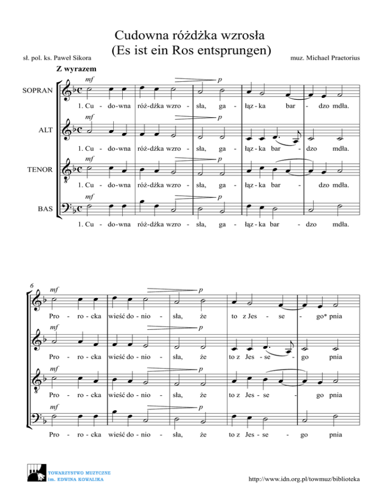 sł. pol. ks. Paweł Sikora mf ° ˙ SOPRAN & b c Cudowna różdżka wzrosła (Es ist ein Ros entsprungen) muz. Michael Praetorius Z wyrazem œ œ œ œ ˙ ˙ 1. Cu - do - wna róż - dżka wzro - sła, mf ALT TENOR & bc ˙ œ œ œ œ ˙ ga - œ œ œ œ ˙ ˙ ˙ œ œ mf &b ˙ Pro &b ˙ ‹ Pro - ? ˙ ¢ b - œ œ - œ œ ˙ ro - cka wieść do - nio œ œ ˙ ro - cka wieść do - nio œ œ mf Pro ro - cka wieść do - nio œ œ mf œ œ ˙ œ œ ˙ ro - cka wieść do - nio - ˙ p sła, że ˙ ˙ ga łąz - ka bar - - - - sła, ˙ ˙ że p ˙ sła, że ˙ p sła, że ˙ dzo mdła. - dzo łąz - ka bar - łąz - ka bar - dzo to z Jes - œ se œ œ œ™ to z Jes - se - - œ œ ˙ to z Jes - se ˙ pnia œ œ ˙ go pnia ˙ - mdła. go* pnia - go to z Jes - se ˙ œ œ ˙ j œ ˙ œ œ œ œ mdła. dzo mdła. ˙ œ ˙ ˙ œ œ ˙ œ œ ˙ p ˙ - œ œ œ œ p ˙ bar œ œ ˙ j œ œ œ™ œ ˙ - do - wna róż - dżka wzro - sła, œ œ œ œ ˙ 1. Cu - do - wna róż - dżka wzro - sła, - ˙ œ łąz - ka p ˙ œ ˙ - - mf Pro ga ga p & bc ˙ ‹ 1. Cu 6 ˙ 1. Cu - do - wna róż - dżka wzro - sła, mf ? c˙ BAS ¢ b ° mf˙ &b p go ˙ pnia http://www.idn.org.pl/towmuz/biblioteka ° &b Œ 2 11 &b Œ p œ œ œ œ œ œ œ za - kwit - nął ? ¢ bŒ ° œ &b 14 œ œ p za - kwit - nął za - kwit - nął ˙ os - trej zi œ os - trej &b œ ‹ os ? ¢ bœ œ œ œ p œ &b œ œ cud - ny p za - kwit - nął &b Œ ‹ œ œ - trej œ os - trej ˙ zi ˙ zi ˙ - - - ˙ my, #˙ my, ˙ - my, ˙ kwiat Œ œ œ œ nœ kwiat œ œ ˙ Œ ˙ Œ cud - ny cud - ny œ œ cud - ny œ œ œ po - środ - ku œ œ œ œ œ œ œ œ œ œ po - środ - ku kwiat po - środ - ku kwiat po - środ - ku p ˙ œ gdy cie œ U œ ˙ œ U œ ˙ p ˙ zi my, Œ ˙ œ ˙ cie œ p œ œ gdy cie - gdy ˙ p ˙ gdy œ cie œ - œ - - mność œ œ mność ˙ mność ˙ mność kry - ła kry - ła świat. świat. œ U œ ˙ œ U œ ˙ kry - ła kry - ła świat. świat. http://www.idn.org.pl/towmuz/biblioteka 3 2. Ten kwiatek, co zachwyca, Izajasz wieścił rad, a Maria go, Dziewica, wydała na ten świat. Powiła dziecię swe, jak zrządził Bóg przedwieczny, gdy świat spoczywał w śnie. 3. Kwiatuszek ten na ziemi przecudną szerzy woń i promieniami swemi rozprasza nocną toń. Prawdziwy Człowiek-Bóg w cierpieniach dopomaga, ratuje z śmierci trwóg. * Oryginalnie w 1 zwrotce występuje zwrot "z Izajego pnia", który jest pomyłką poety. "Chodzi o różdżkę z pnia Jessego, o której jest mowa w proroctwie Izajasza — "Izajego"". por. Iz 11,1; Rz 15,12 [za: Piotr Wilczek, "Erazm Otwinowski pisarz ariański", s. 127] http://www.idn.org.pl/towmuz/biblioteka