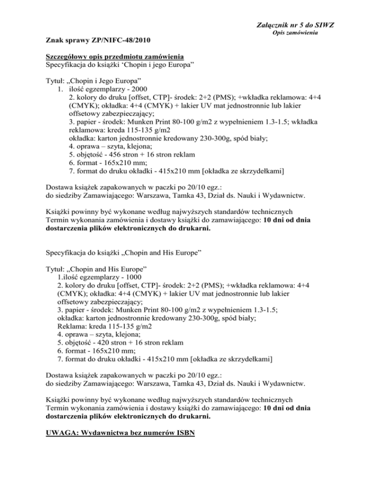 Załącznik nr 5 do SIWZ Opis zamówienia Znak sprawy ZP/NIFC-48/2010 Szczegółowy opis przedmiotu zamówienia Specyfikacja do książki ‘Chopin i jego Europa” Tytuł: „Chopin i Jego Europa” 1. ilość egzemplarzy - 2000 2. kolory do druku [offset, CTP]- środek: 2+2 (PMS); +wkładka reklamowa: 4+4 (CMYK); okładka: 4+4 (CMYK) + lakier UV mat jednostronnie lub lakier offsetowy zabezpieczający; 3. papier - środek: Munken Print 80-100 g/m2 z wypełnieniem 1.3-1.5; wkładka reklamowa: kreda 115-135 g/m2 okładka: karton jednostronnie kredowany 230-300g, spód biały; 4. oprawa – szyta, klejona; 5. objętość - 456 stron + 16 stron reklam 6. format - 165x210 mm; 7. format do druku okładki - 415x210 mm [okładka ze skrzydełkami] Dostawa książek zapakowanych w paczki po 20/10 egz.: do siedziby Zamawiającego: Warszawa, Tamka 43, Dział ds. Nauki i Wydawnictw. Książki powinny być wykonane według najwyższych standardów technicznych Termin wykonania zamówienia i dostawy książki do zamawiającego: 10 dni od dnia dostarczenia plików elektronicznych do drukarni. Specyfikacja do książki „Chopin and His Europe” Tytuł: „Chopin and His Europe” 1.ilość egzemplarzy - 1000 2. kolory do druku [offset, CTP]- środek: 2+2 (PMS); +wkładka reklamowa: 4+4 (CMYK); okładka: 4+4 (CMYK) + lakier UV mat jednostronnie lub lakier offsetowy zabezpieczający; 3. papier - środek: Munken Print 80-100 g/m2 z wypełnieniem 1.3-1.5; okładka: karton jednostronnie kredowany 230-300g, spód biały; Reklama: kreda 115-135 g/m2 4. oprawa – szyta, klejona; 5. objętość - 420 stron + 16 stron reklam 6. format - 165x210 mm; 7. format do druku okładki - 415x210 mm [okładka ze skrzydełkami] Dostawa książek zapakowanych w paczki po 20/10 egz.: do siedziby Zamawiającego: Warszawa, Tamka 43, Dział ds. Nauki i Wydawnictw. Książki powinny być wykonane według najwyższych standardów technicznych Termin wykonania zamówienia i dostawy książki do zamawiającego: 10 dni od dnia dostarczenia plików elektronicznych do drukarni. UWAGA: Wydawnictwa bez numerów ISBN