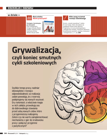 EDUKACJA I ROZWÓJ w dziale ► Baza wiedzy Warto przeczytać! Strategize. Symulacyjna gra decyzyjna Piotr Prokopowicz, Grzegorz Żmuda, Marek Janigacz, Marianna Król, Katarzyna Orlicka Wolters Kluwer 2014 Grywalizacja, czyli koniec smutnych cykli szkoleniowych Szybkie tempo pracy, nadmiar obowiązków i rosnąca odpowiedzialność za realizację zadań powodują, że z rezerwą podejmujemy się nowych wyzwań. Gry natomiast, a właściwie magia w nich zaklęta, prowokują nas do dobrowolnego stawiania przed sobą nowych celów, które z przyjemnością realizujemy. Zatem czy nie warto zaimplementować mechanizmy z gier do środowiska pracy i połączyć przyjemne z pożytecznym? 94 Personelplus | listopad2014 Kilka uwag na temat rozwoju zawodowego Termin „rozwój zawodowy” należy do tych pojęć, które doczekały się wyjątkowo dużej liczby definicji. Przyjmijmy, że są to przedsięwzięcia „wzbogacania wiedzy, rozwijania zdolności, kształtowania wartości, postaw, motywacji i umiejętności (…)”. | s. 100 Obok bardzo miłej i czasem kolorowej nakładki, jaką jest fabuła, grywalizacja daje możliwość kontroli procesu uczenia. Dzięki platformom on-line, na których zwykle umieszczamy grywalizację, możemy uzyskać poziom wglądu w szczegółowe zachowania użytkowników na nieosiągalnym w innych projektach rozwojowych poziomie. Arkadiusz Siechowicz, Daniel Pazura, czytaj w tekście poniżej. Arkadiusz Siechowicz, Daniel Pazura K Kluczem do sprawności organizacyjnej jest wzrost kompetencji pracowników. Nieustannie poszukujemy rozwiązań w zakresie zwiększenia efektywności szkoleń i innych działań rozwojowych. Choć na rynku polskim widać znaczną poprawę w profesjonalizacji szkoleń, nadal wiele projektów rozwojowych nie spełnia kryteriów udanej inwestycji. Ponadto in lacja zdobytej wiedzy przebiega ekspresowo. Sytuacja stale wymaga od nas przypominania i utrwalania zdobytych umiejętności, co rodzi kolejne powtarzalne koszty. Co więcej, tradycyjna forma szkoleniowa wymaga ośmiogodzinnego uczestnictwa, gdzie wiedza jest przekazywana w sposób statyczny, stacjonarny – czyli mało atrakcyjny dla uczestnika. Dobry program grywalizacyjny zaczyna się od początku Planując proces rozwojowy, warto nie tylko zadbać o zakres merytoryczny, lecz również zwrócić uwagę na pomysł i formę budowania zaangażowania pracownika. Gry poprzez swoje mechanizmy oraz kulturę zabawy pozwalają wypracować nawyki i zmienić nasze postawy. Dzięki rzetelnej analizie można odkryć preferencje uczestników i opracować najlepszy sposób uczenia się. Warto zacząć wdrażać grywalizację już na samym początku przygody – koniecznie w fazie badania potrzeb. Takie podejście pozwala zaadaptować się pracownikom znacznie szybciej do nowej, innowacyjnej formy rozwoju osobistego i dzięki temu otworzyć się na nowe doznania. Nie mówiąc już o tym, że wzbudzimy ich ciekawość i zainteresowanie przed wydarzeniem. Grywalizacja wspiera motywację i daje poczucie kontroli nad własnym procesem kształcenia. Wykorzystanie platformy informatycznej listopad2014 | Personelplus 95 EDUKACJA I ROZWÓJ Nowoczesne formy rozwoju Marlena Wieteska dyrektor ds. rozwoju biznesu w Gamfi. Posiada doświadczenie w bankowości, również na stanowiskach menedżerskich. Obecnie rozwija rozwiązania zwiększające zaangażowanie klienta wewnętrznego i zewnętrznego, wykorzystując grywalizację. Wdrażając grywalizację w organizacji, warto zastosować się do paru prostych, ale zwiększających szansę sukcesu, zasad. Przede wszystkim należy dobrze zdefiniować cele biznesowe, od których zależy odpowiedni dobór narzędzi, rodzaj zadań czy nagród. Istotne jest również dogłębne poznanie grupy, dla której projektujemy grywalizację. Nie chodzi tylko o demografię, ale również o nawyki i motywację. Zmiana nawyków jest procesem wymagającym bardzo jasnego określenia, z jakim zachowaniem mamy do czynienia, w jaki sposób chcemy je zmienić, aby osiągnąć określony cel i w jaki sposób będziemy za to nagradzać, zgodnie z pętlą nawyku Charlesa Duhigga*. Grywalizacja w cudowny sposób wzmacnia właściwe zachowania. Dla przykładu: oczekując samodoskonalenia wśród pracowników, planujemy zadania czy nagrody w taki sposób, aby zachęcać do korzystania z narzędzia przez 15 minut każdego dnia. Znajomość motywacji grupy odbiorców daje nam również możliwość odpowiedniego doboru nagród. Dla jednych cenna może być nagroda rzeczowa, dla innych – ekstremalne doznania, a jeszcze innych ucieszy prestiż. Pamiętajmy jeszcze o całym szeregu motywacji nierzeczowych (trofea, rankingi), które również powinniśmy dostosować do organizacji. Po wdrożeniu warto pozostać czujnym – testować, mierzyć, wnioskować i wprowadzać zmiany. Grywalizacja nie jest narzędziem, które robi się raz i już – raczej ciągle dostosowuje się do wymogów organizacji.■ * Ch. Duhigg, Siła Nawyku, Warszawa 2013. pozwala uczyć się w dogodnym dla nas miejscu i czasie. Użytkownik posiada kontrolę nad tempem nauki i swobodnie nawiguje podczas całego procesu. Ponadto zasady są znane: realizujesz zadanie – zdobywasz punkty – awansujesz na wyższe poziomy – masz jasny obraz i satysfakcję z rozwoju. Sylwetka uczestnika Na co dzień spotykamy się z małą aktywnością i niskim poziomem zaangażowania pracowników we własny rozwój i korzystania z dostępnych możliwości w tym obszarze. Choć wiedza jest na wyciągnięcie ręki, wydaje się to przysparzać więcej problemów niż korzyści. Rosnące tempo pracy wymaga od nas selekcji informacji i porcjowania jej w przystępnych dawkach. Metabolizm informacyjny wspomaga grywalizacja. Bogaty zasób wiedzy pozwala dzielić na porcje i wykorzystywać tylko te, które są potrzebne użytkownikowi na danym etapie rozwoju. Grywalizacja wpływa jednocześnie na poziom 96 Personelplus | listopad2014 reaktywności pracow