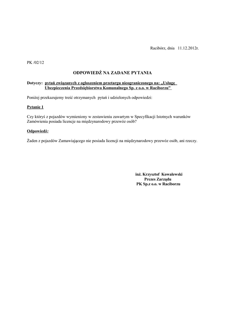 Racibórz, dnia 11.12.2012r. PK /02/12 ODPOWIEDŹ NA ZADANE PYTANIA Dotyczy: pytań związanych z ogłoszeniem przetargu nieograniczonego na: „Usługę Ubezpieczenia Przedsiębiorstwa Komunalnego Sp. z o.o. w Raciborzu” Poniżej przekazujemy treść otrzymanych pytań i udzielonych odpowiedzi: Pytanie 1 Czy któryś z pojazdów wymieniony w zestawieniu zawartym w Specyfikacji Istotnych warunków Zamówienia posiada licencje na międzynarodowy przewóz osób? Odpowiedź: Żaden z pojazdów Zamawiającego nie posiada licencji na międzynarodowy przewóz osób, ani rzeczy. inż. Krzysztof Kowalewski Prezes Zarządu PK Sp.z o.o. w Raciborzu PK /02/12 Racibórz, dnia 11.12.2012r. ODPOWIEDŹ NA ZADANE PYTANIA Dotyczy: pytań związanych z ogłoszeniem przetargu nieograniczonego na „Usługę Ubezpieczenia Przedsiębiorstwa Komunalnego Sp. z o.o. w Raciborzu” Poniżej przekazujemy treść otrzymanych pytań i udzielonych odpowiedzi: Pytanie 1 Czy możliwe jest wprowadzenie w ubezpieczeniu mienia od pożaru i innych zdarzeń losowych franczyzy redukcyjnej w wysokości 1000,00zł? Odpowiedź: Zamawiający zgadza się na wprowadzenie w ubezpieczeniu mienia od pożaru i innych zdarzeń losowych franczyzy redukcyjnej w wysokości 1000,00zł? Pytanie 2 Prosimy potwierdzenie, że w 1997 roku w skutek powodzi zaistniała szkoda. Proszę o określenia co było przyczyną szkody, co było przedmiotem szkody. W jakiej wysokości wypłacone zostało odszkodowanie. Prosimy o określenie, jakie zostały poczynione działania ażeby zapobiec szkodzie w przyszłości? Odpowiedź: W 1997 roku Przedsiębiorstwo Komunalne Sp. z o.o. znalazło się w strefie powodzi. Od tego czasu miejsce ubezpieczenia nie zostało więcej dotknięte powodzią? Żadne odszkodowanie nie zostało wypłacone gdyż Przedsiębiorstwo nie było ubezpieczone. Od 1997 roku otrzymana pomoc finansowa z Banku Światowego pozwoliła rozbudować i zmodernizować system ostrzegania i alarmowania ludności, a w Raciborzu przystąpiono do odbudowy i modernizacji zniszczonych wałów i urządzeń wodnych które obecnie są podwyższone i zbudowane według najnowszej technologii. Wyremontowano przepompownie, kanalizację burzową i wyloty do rzeki Odry. Nowoczesny system monitoringu zabezpiecza miasto przed zalaniem przez wody opadowe lub cofkę z rejonu Miedoni. "Program dla Odry 2006" oprócz budowy zbiornika Racibórz Dolny zakłada modernizację i rozbudowę istniejącego systemu ochrony przeciwpowodziowej. Zbiornik Racibórz może zapewnić bezpieczne przeprowadzenie fali powodziowej przez Racibórz. Pytanie 3 Czy Zamawiający przewiduje możliwość wyłączenie ryzyka powodzi zarówno w ubezpieczeniu mienia od ognia i innych zdarzeń losowych - OG, jak i w ubezpieczeniu pojazdów od ognia i powodzi; Bądź czy Zamawiający przewiduje możliwość wprowadzenia limitu wspólnego – dla OG, jak i w ubezpieczeniu pojazdów od ognia i powodzi – wysokości 200 000,00zł Odpowiedź: W przypadku ubezpieczenia mienia od ognia i innych zdarzeń losowych - OG jak i w ubezpieczeniu pojazdów od ognia i powodzi, Zamawiający dopuszcza limit wspólny 200.000,00zł. Pytanie 4 Czy Zamawiający posiada instrukcję postępowania na wypadek zagrożenia powodziowego/powodzi? Odpowiedź: Zamawiający posiada instrukcję postępowania instrukcję postępowania na wypadek zagrożenia powodziowego i na wypadek powodzi. Pytanie 5 Czy Zamawiający przewiduje możliwość zastąpienia treści klauzuli automatycznego pokrycia poniższą klauzulą: KLAUZULA AUTOMATYCZNEGO UBEZPIECZENIA NOWEGO MIENIA (Automatyczne ubezpieczenie nowych inwestycji, klauzula inwestycyjna) 1. Z zachowaniem pozostałych, nie zmienionych niniejszą klauzulą postanowień ogólnych warunków ubezpieczenia i innych postanowień umowy ubezpieczenia, ustala się że: a) nowo nabyte środki trwałe spełniające warunki objęcia ubezpieczeniem zgodnie z umową ubezpieczenia, b) wzrost wartości przedmiotu ubezpieczenia stanowiącego środki trwałe – wskutek dokonanych inwestycji, zostają objęte automatyczną ochroną ubezpieczeniową w zakresie i na zasadach określonych w umowie ubezpieczenia, od chwili objęcia ich w posiadanie przez Ubezpieczonego a w przypadku wzrostu środków trwałych w skutek dokonanych inwestycji od chwili ukończenia prac modernizacyjnych (inwestycji). Automatyczna ochrona ubezpieczeniowa odnosi się wyłącznie do miejsc ubezpieczenia wskazanych w umowie ubezpieczenia. Objęcie w posiadanie nowych środków trwałych przez Ubezpieczonego lub wzrost wartości środków trwałych powinno być potwierdzone dokumentem np. fakturą zakupu lub protokołem zdawczo – odbiorczym. Ochroną ubezpieczeniową nie jest objęte mienie podczas załadunku, transportu, rozładunku oraz prac budowlano-montażowych (w tym prób i testów). 2. Ubezpieczający lub Ubezpieczony zobowiązany jest zgłosić zwiększenie sumy ubezpieczenia w terminie do 20 dni po zakończeniu każdego półrocza okresu ubezpieczenia / okresu ubezpieczenia*. 3. Odpowiedzialność Zakładu Ubezpieczeń w stosunku do automatycznie ubezpieczonego na mocy niniejszej klauzuli mienia ograniczona jest do wysokości: ξ 20% wartości łącznej sumy ubezpieczenia 4. Nowo nabyte środki trwałe oraz inwestycje, których łączna suma ubezpieczenia przekracza przyjęty w klauzuli limit, mogą być ubezpieczone na zasadach określonych w ogólnych warunkach ubezpieczenia. 5. Dopłata składki wynikającej z rozszerzenia ochrony ubezpieczeniowej następuje na następujących zasadach: Ubezpieczający jest zobowiązany zapłacić składkę za okres świadczonej ochrony ubezpieczeniowej w terminie 30 dni po zakończeniu każdego półrocza okresu ubezpieczenia/ okresu ubezpieczenia*. Składka będzie naliczona od wzrostu sumy ubezpieczenia w danym okresie (półrocznym, rocznym) i 50% wysokości stawki rocznej. 6. W przypadku, gdy w okresie ubezpieczenia suma ubezpieczenia mienia ulegnie zmniejszeniu wskutek jeg