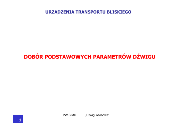 URZĄDZENIA TRANSPORTU BLISKIEGO DOBÓR PODSTAWOWYCH PARAMETRÓW DŹWIGU PW SIMR 1 „Dźwigi osobowe” URZĄDZENIA TRANSPORTU BLISKIEGO Cel stosowania dźwigów w budynkach Główny cel – sprawne transportowanie ludzi pomiędzy piętrami. W budynkach średnich i wysokich kluczowym zagadnieniem jest ilość ludzi do przetransportowania w określonym czasie. W budynkach niskich większą rolę odgrywją specjalne warunki transportu (np. transport osób na noszach). PW SIMR 2 „Dźwigi osobowe” URZĄDZENIA TRANSPORTU BLISKIEGO Podstawowe parametry dźwigu: - udźwig (liczba osób), udźwig jest podawany w [kg], a liczba osób jest mniejszą z dwóch wartości: - udźwig [kg] / 75 [kg/1 osoba] - na podstawie normy dobrana do powierzchni kabiny. - nominalna prędkość jazdy kabiny [m/s], PW SIMR 3 „Dźwigi osobowe” URZĄDZENIA TRANSPORTU BLISKIEGO Dobór podstawowych parametrów dźwigu(ów) Dobór podstawowych parametrów dźwigu(ów) zależy od: - rodzaju obiektu (budynek mieszkalny, biurowiec, centrum handlowe, szpital, szkoła itp.), - wielkości budynku (ilości kondygnacji), - ilości osób, które będą mieszkały, pracowały, odwiedzały dany budynek, - cech charakterystycznych ruchu pasażerskiego w danym obiekcie, - uwarunkowań prawnych, PW SIMR 4 „Dźwigi osobowe” URZĄDZENIA TRANSPORTU BLISKIEGO Dobór podstawowych parametrów dźwigu(ów) W przypadku dźwigów wydajność wyznaczona tylko z udźwigu i prędkości jazdy jest mało użyteczna. Dźwigi nie są urządzeniami, które pracują w ruchu ciągłym, jednokierunkowym. Pasażerowie przychodzą w pewnych okresach czasu na przystanki i chcą jechać na różne, wybrane przez siebie przystanki. PW SIMR 5 „Dźwigi osobowe” URZĄDZENIA TRANSPORTU BLISKIEGO Charakterystyka pracy dźwigów - kabina dźwigu często zmienia kierunek jazdy, - kabina często zatrzymuje się na przystankach, często występuje postój kabiny na przystanku (brak ruchu ciągłego), - duża zależność od liczby przystanków, - różne cechy ruchu pasażerskiego w budynkach, PW SIMR 6 „Dźwigi osobowe” URZĄDZENIA TRANSPORTU BLISKIEGO Oczekiwania pasażerów w stosunku do transportu dźwigowego - krótki czas oczekiwania na przystanku na przyjazd kabiny, - krótki czas jazdy kabiną do przystanku docelowego, - komfortowe (w miarę) warunki podróżowania, - możliwość przewożenia bagażu osobistego, PW SIMR 7 „Dźwigi osobowe” URZĄDZENIA TRANSPORTU BLISKIEGO Charakterystyczne modele ruchu pasażerskiego w budynkach 1. Poranne zapełnianie budynku (biurowce), 2. Poranne opuszczanie budynku (budynki mieszkalne), 3. Ruch mieszany np. w hotelach, PW SIMR 8 „Dźwigi osobowe” URZĄDZENIA TRANSPORTU BLISKIEGO Najbardziej krytyczny ruch pasażerski Poranne zapełnianie budynku (biurowce), ponieważ: - krótki czas trwania szczytu, - rozwożenie pojedynczych osób po różnych przystankach, - prawie wszyscy chcą jechać dźwigiem – ludzie nie chcą chodzić po schodach w kierunku do góry, - dużo osób jest z podręcznym bagażem (torebka, aktówka, plecak), PW SIMR 9 „Dźwigi osobowe” URZĄDZENIA TRANSPORTU BLISKIEGO Przewidywany cykl pracy dźwigu dla porannego szczytu w kierunku do góry - wchodzenie pasażerów do kabiny na przystanku podstawowym, - rozwożenie pojedynczych osób po różnych przystankach, - powrót na przystanek podstawowy po następnych pasażerów (bez zatrzymywania się po drodze na przystankach), PW SIMR 10 „Dźwigi osobowe” URZĄDZENIA TRANSPORTU BLISKIEGO Praca dźwigu podczas szczytu porannego - praca cykliczna, - cykle są losowe (pasażerowie przychodzą losowo, a wybór docelowych przystanków zależy od pasażerów), - można analizować tylko metodami statystycznymi, PW SIMR 11 „Dźwigi osobowe” URZĄDZENIA TRANSPORTU BLISKIEGO Czas trwania cyklu – czas jazdy okrężnej kabiny Zależy głównie od: - liczby przystanków S, na których będzie się kabina zatrzymywała, - położenia najwyższego przystanku H (przystanku nawrotu), do którego będzie kabina dojeżdżała w danym cyklu, - odległości pomiędzy przystankami, - nominalnej prędkości jazdy kabiny v, - liczby pasażerów, która może wejść do kabiny P, sprawności pasażerów, - rodzaju napędu (przebieg fazy przyśpieszania, hamowania), - czasu otwierania i zamykania drzwi (typ i szerokość drzwi), - innych czynników (czas postoju kabiny z otwartymi drzwiami, otwieranie drzwi na dojeździe). PW SIMR 12 „Dźwigi osobowe” URZĄDZENIA TRANSPORTU BLISKIEGO Średnia liczba pasażerów, która wchodzi do kabiny na przystanku podstawowym - jest mniejsza od maksymalnej liczby osób wynikającej z udźwigu, - pasażerowie nie chcą podróżować w maksymalnie zatłoczonej kabinie, - średnio zajmują więcej miejsca, niż jest przewidywane w normie (mają podręczne bagaże), - w niektórych obiektach podróżują prawie pojedynczo (hotele), Do obliczeń czasu trwania jazdy okrężnej kabiny przyjmuje się, że liczba pasażerów wynosi 80% maksymalnej liczby pasażerów. Dla niektórych obiektów można przyjmować inną wartość, jeśli jest bardziej odpowiednia. PW SIMR 13 „Dźwigi osobowe” URZĄDZENIA TRANSPORTU BLISKIEGO Liczba przystanków S, na których będzie się zatrzymywała kabina w czasie jednego cyklu jazdy okrężnej Jest to prawdopodobna liczba przystanków, na których będą wychodzić pasażerowie, którzy weszli do kabiny na przystanku podstawowym. Założenia do wyznaczenia liczby przystanków S: - dźwig posiada N+1 przystanków; N przystanków jest ponad przystankiem podstawowym. - na wszystkich kondygnacjach (przystankach) jest jednakowa liczba osób, Definicje: - przystanek podstawowy - przystanek i-ty PW SIMR 14 „Dźwigi osobowe” URZĄDZENIA TRANSPORTU BLISKIEGO Liczba przystanków S, na których będzie się zatrzymywała kabina w czasie jednego cyklu jazdy okrężnej Prawdopodobna liczba przystanków S, na których będzie się zatrzymywała kabina Ponieważ i-tych przystank