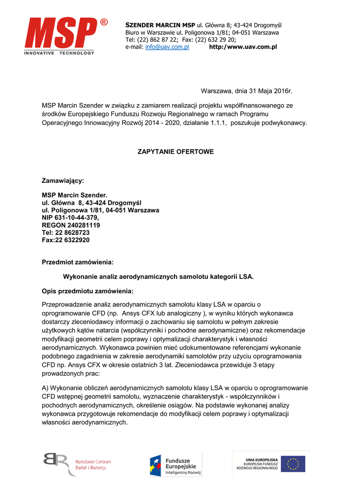 SZENDER MARCIN MSP ul. Główna 8; 43-424 Drogomyśl Biuro w Warszawie ul. Poligonowa 1/81; 04-051 Warszawa Tel: (22) 862 87 22; Fax: (22) 632 29 20; e-mail: [email protected] http:/www.uav.com.pl Warszawa, dnia 31 Maja 2016r. MSP Marcin Szender w związku z zamiarem realizacji projektu współfinansowanego ze środków Europejskiego Funduszu Rozwoju Regionalnego w ramach Programu Operacyjnego Innowacyjny Rozwój 2014 - 2020, działanie 1.1.1, poszukuje podwykonawcy. ZAPYTANIE OFERTOWE Zamawiający: MSP Marcin Szender. ul. Główna 8, 43-424 Drogomyśl ul. Poligonowa 1/81, 04-051 Warszawa NIP 631-10-44-379, REGON 240281119 Tel: 22 8628723 Fax:22 6322920 Przedmiot zamówienia: Wykonanie analiz aerodynamicznych samolotu kategorii LSA. Opis przedmiotu zamówienia: Przeprowadzenie analiz aerodynamicznych samolotu klasy LSA w oparciu o oprogramowanie CFD (np. Ansys CFX lub analogiczny ), w wyniku których wykonawca dostarczy zleceniodawcy informacji o zachowaniu się samolotu w pełnym zakresie użytkowych kątów natarcia (współczynniki i pochodne aerodynamiczne) oraz rekomendacje modyfikacji geometrii celem poprawy i optymalizacji charakterystyk i własności aerodynamicznych. Wykonawca powinien mieć udokumentowane referencjami wykonanie podobnego zagadnienia w zakresie aerodynamiki samolotów przy użyciu oprogramowania CFD np. Ansys CFX w okresie ostatnich 3 lat. Zleceniodawca przewiduje 3 etapy prowadzonych prac: A) Wykonanie obliczeń aerodynamicznych samolotu klasy LSA w oparciu o oprogramowanie CFD wstępnej geometrii samolotu, wyznaczenie charakterystyk - współczynników i pochodnych aerodynamicznych, określenie osiągów. Na podstawie wykonanej analizy wykonawca przygotowuje rekomendacje do modyfikacji celem poprawy i optymalizacji własności aerodynamicznych. SZENDER MARCIN MSP ul. Główna 8; 43-424 Drogomyśl Biuro w Warszawie ul. Poligonowa 1/81; 04-051 Warszawa Tel: (22) 862 87 22; Fax: (22) 632 29 20; e-mail: [email protected] http:/www.uav.com.pl B) Weryfikacja wprowadzonych zmian w oparciu o metody modelowania CFD, wypracowanie rekomendacji do finalnej optymalizacji aerodynamicznej. C) Wyznaczenie finalnych charakterystyk aerodynamicznych i porównanie z wersją wyjściową.. Wymagania wobec wykonawcy: 1. Bardzo dobra znajomość aerodynamiki samolotów 2. Minimum 10 lat doświadczenia w dziedzinie aerodynamiki lotniczej, w tym doświadczenia CFD związanego z lotnictwem; 3. Udokumentowane poparte referencjami doświadczenie w zakresie analiz i optymalizacji aerodynamicznej samolotów; aktywne uczestniczenie w procesie projektowania i optymalizacji aerodynamicznej samolotu, w tym wykonanie analiz aerodynamicznych CFD i charakterystyk samolotów w ciągu ostatnich 3 lat. Kryteria wyboru oferty: Kryteria wyboru Znaczenie Cena 80 pkt Termin realizacji zamówienia w miesiącach od momentu podpisania umowy 20 pkt a. Punkty w ramach kryterium ceny będą przyznawane wg następującej formuły: 𝑃𝐶 = 𝐶 𝑚𝑖𝑛 ∗ 80 𝑝𝑘𝑡 Cr P C = punkty w ramach kryterium ceny C min = cena oferty najtańszej C r = cena oferty rozpatrywanej b. Punkty w ramach kryterium termin realizacji będą przyznawane według następującej formuły: 𝑃𝑇= 𝑇 𝑚𝑖𝑛 ∗ 20 𝑝𝑘𝑡 Tr P T = punkty w ramach kryterium termin realizacji T min = najkrótszy termin realizacji T r = termin realizacji oferty rozpatrywanej SZENDER MARCIN MSP ul. Główna 8; 43-424 Drogomyśl Biuro w Warszawie ul. Poligonowa 1/81; 04-051 Warszawa Tel: (22) 862 87 22; Fax: (22) 632 29 20; e-mail: [email protected] http:/www.uav.com.pl c. Suma wszystkich punktów przyznanych każdej z ofert zostanie wyliczona według następującej formuły: S = PC + PT S = suma wszystkich punktów przyznanych ofercie W przypadku ofert składanych w walucie innej niż PLN, kwoty podane w ofercie będą przeliczane według kursu średniego NBP, aktualnego na dzień złożenia oferty. Termin realizacji zamówienia: najpóźniej do dnia 31.12.2017r. Termin składania ofert: do dnia 08.06.2016r., do godziny 12:00 Miejsce składania ofert: - za pośrednictwem poczty elektronicznej na adres: [email protected] - na adres siedziby firmy: MSP Marcin Szender, ul. Poligonowa 1/81, 04-051 Warszawa Złożona oferta powinna zawierać: 1. pełną nazwę i adres oferenta, numer telefonu oraz numer NIP, 2. datę wystawienia oferty oraz okres ważności oferty (minimum 90 dni), 3. wykaz wykonanych dostaw/ projektów oraz posiadane doświadczenie i kwalifikacje 4. cenę oferty, uwzględniającą wykonanie wszystkich prac i czynności oraz zawierającą wszelkie koszty związane z realizacją zamówienia (wyrażoną w jednostkach pieniężnych, którą kupujący jest obowiązany zapłacić wykonawcy za przedmiot zamówienia z uwzględnieniem podatku od towarów i usług VAT), 5. oferta musi być podpisana przez osobę lub osoby uprawnione do reprezentowania oferenta, przy czym podpis musi być czytelny lub opisany pieczęciami imiennymi. Otwarcie ofert nastąpi o godzinie 12:30 w dniu 08.06.2016r. w siedzibie Zamawiającego, ul. Poligonowa 1/81, 04-051 Warszawa Zainteresowane podmioty mogą uzyskać szczegółowe informacje: - w siedzibie firmy: MSP Marcin Szender, ul. Poligonowa 1/81, 04-051 Warszawa - pod numerem telefonu: 22 862 87 22 - wysyłając e-mail na adres: [email protected] SZENDER MARCIN MSP ul. Główna 8; 43-424 Drogomyśl Biuro w Warszawie ul. Poligonowa 1/81; 04-051 Warszawa Tel: (22) 862 87 22; Fax: (22) 632 29 20; e-mail: [email protected] http:/www.uav.com.pl Miejsce dostarczenia przedmiotu oferty: Warszawa Niniejsze zapytanie ofertowe zostało zamieszczone i jest dostępne w siedzibie firmy, mieszczącym się przy MSP Marcin Szender, ul. Poligonowa 1/81, 04-051 Warszawa Niniejsze zapytanie ofertowe nie zobowiązuje firmy MSP Marcin Szender do żadnego określonego działania. 1. MSP Marcin Szender nie może być obciążona jakimikolwiek kosztami czy wydatkami poniesionymi przez oferentów w związku z przygoto