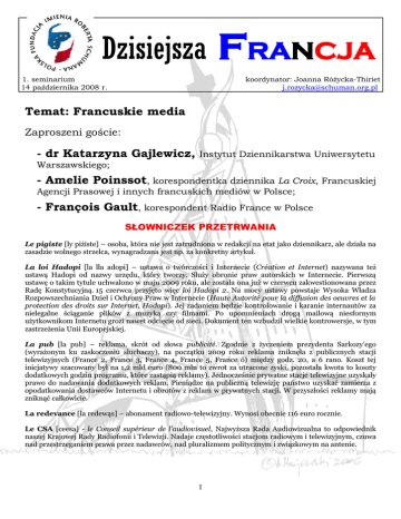 Dzisiejsza 1. seminarium 14 października 2008 r. FRANCJA koordynator: Joanna Różycka-Thiriet [email protected] Temat: Francuskie media Zaproszeni goście: - dr Katarzyna Gajlewicz, Instytut Dziennikarstwa Uniwersytetu Warszawskiego; - Amelie Poinssot, korespondentka dziennika La Croix, Francuskiej Agencji Prasowej i innych francuskich mediów w Polsce; - François Gault, korespondent Radio France w Polsce SŁOWNICZEK PRZETRWANIA Le pigiste [ly piżiste] – osoba, która nie jest zatrudniona w redakcji na etat jako dziennikarz, ale działa na zasadzie wolnego strzelca, wynagradzana jest np. za konkretny artykuł. La loi Hadopi [la lła adopi] – ustawa o twórczości i Internecie (Création et Internet) nazywana też ustawą Hadopi od nazwy urzędu, który tworzy. Służy obronie praw autorskich w Internecie. Pierwszą ustawę o takim tytule uchwalono w maju 2009 roku, ale została ona już w czerwcu zakwestionowana przez Radę Konstytucyjną. 15 czerwca przyjęto więc loi Hadopi 2. Na mocy ustawy powstaje Wysoka Władza Rozpowszechniania Dzieł i Ochrony Praw w Internecie (Haute Autorité pour la diffusion des oeuvres et la protection des droits sur Internet, Hadopi). Jej zadaniem będzie kontrolowanie i karanie internautów za nielegalne ściąganie plików z muzyką czy filmami. Po upomnieniach drogą mailową niesfornym użytkownikom Internetu grozi nawet odcięcie od sieci. Dokument ten wzbudził wielkie kontrowersje, w tym zastrzeżenia Unii Europejskiej. La pub [la pub] – reklama, skrót od słowa publicité. Zgodnie z życzeniem prezydenta Sarkozy’ego (wyrażonym ku zaskoczeniu słuchaczy), na początku 2009 roku reklama zniknęła z publicznych stacji telewizyjnych (France 2, France 3, France 4, France 5, France ô) między godz. 20, a 6 rano. Koszt tej inicjatywy szacowany był na 1,2 mld euro (800 mln to zwrot za utracone zyski, pozostała kwota to koszty dodatkowych godzin programu, które zastąpią reklamy). Jednocześnie prywatne stacje telewizyjne uzyskały prawo do nadawania dodatkowych reklam. Pieniądze na publiczną telewizję państwo uzyskać zamierza z opodatkowania dostawców Internetu i obrotów z reklam w prywatnych stacji. W przyszłości reklamy mają zniknąć całkowicie. La redevance [la redewąs] – abonament radiowo-telewizyjny. Wynosi obecnie 116 euro rocznie. Le CSA [ceesa] - le Conseil supérieur de l'audiovisuel, Najwyższa Rada Audiowizualna to odpowiednik naszej Krajowej Rady Radiofonii i Telewizji. Nadaje częstotliwości stacjom radiowym i telewizyjnym, czuwa nad przestrzeganiem prawa przez nadawców, nad pluralizmem politycznym i związkowym na antenie. 1 DOBRZE POWIEDZIANE – FRAZA DNIA (…) TV5, je n'ai jamais rien vu de plus chiant. Moi qui passe beaucoup de temps dans les hôtels, je tombe toujours sur TV5, je peux vous dire, c'est chiant. La semaine dernière, j'était à Bruxelles. Je pensais que TV5 parlerait du sommet européen, pas du tout! Rien! Je tombe sur un programme sur les castors au Canada. Et encore je n'ai rien compris parce que le présentateur parlait avec un accent canadien effroyable! (TV5, nigdy nie widziałem niczego bardziej wnerwiającego. Ja, osoba która spędza dużo czasu w hotelach, natrafiam ciągle na TV5, mogę wam powiedzieć, to wnerwiające. W ubiegłym tygodniu byłem w Brukseli. Myślałem, że TV5 będzie mówić o szczycie europejskim, wcale! Nic! Trafiam na program o bobrach w Kanadzie. I jeszcze nic nie zrozumiałem, ponieważ prezenter mówił z zatrważającym kanadyjskim akcentem!) - fragment wypowiedzi prezydenta Jacques’a Chiraca z 22 czerwca 2005 roku z dyskusji z ówczesnym premierem Dominiquiem de Villepin na temat budżetu publicznych nadawców. Wypowiedź zacytował aktualny minister rolnictwa Bruno Le Maire w swojej książce Des Hommes d’Etats opowiadającej o relacjach Chirac - de Villepin - Sarkozy. Bruno Le Maire był doradcą politycznym, a potem dyrektorem gabinetu de Villepin. TV5 jest stacją francuskojęzyczną powstającą przy współpracy kilku krajów. PORTRETY MNIEJ ZNANYCH MĘŻCZYZN I KOBIET Belgijska z pochodzenia Christine Ockrent jest partnerką życiową ministra spraw zagranicznych, a zarazem jedną z najbardziej znanych we Francji dziennikarek. Tego typu związki nie są wyjątkiem we francuskim życiu publicznym – szef Międzynarodowego Funduszu Walutowego i były minister Dominique Strauss-Kahn jest mężem dziennikarki Anne Sinclair, głośno jest też o znajomościach prezydenta Sarkozy’ego w świecie mediów. Ockrent przez wiele lat była twarzą głównego dziennika telewizyjnej francuskiej dwójki (Journal de 20 heures). Pracowała też w radiu i krótko kierowała tygodnikiem L’Express. Absolwentka prestiżowego Instytutu Nauk Politycznych w Paryżu. W kanale France 3 prowadziła przez 10 lat program na tematy europejskie France Europe Express. Od lutego 2008 roku jest dyrektorem generalnym holdingu France Monde (stacji TV5 Monde, France 24 i RFI nadających na zagranicę). JAK TO SIĘ JE, CZYLI O FRANCUSKICH ZWYCZAJACH La rentrée – kiedy wakacje zbliżają się do końca we francuskich mediach słychać bez przerwy to słowo, które oznacza powrót po (najczęściej) letnim odpoczynku. Mówi się więc o rentrée scolaire, czyli powrocie dzieci do szkoły. Swoją rentrée mają też studenci i wykładowcy (rentrée universitaire), a nawet politycy. Chociaż od słynnych upałów w 2003 roku (tzw. la canicule), w efekcie których zmarło we Francji kilkanaście tysięcy osób, francuski rząd nigdy gromadnie nie wyjeżdża na urlopy, żeby nie pozostawić wrażenia, że nikt nie interesuje się mniej lub bardziej ważnymi sprawami wagi państwowej. Nawet w pełni sezonu urlopowego w Paryżu zawsze ktoś czeka pod telefonem. INTERNET – CO W TRAWIE PISZCZY www.lefigaro, www.lemonde – dwie największe ogólnokrajowe gazety opiniotwórcze. Le Figaro bardziej prawicowy, Le Monde bardziej lewicowy. Jednak we Francji dużą poczytnością ci