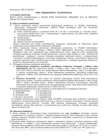 Załącznik Nr 3 do zapytania ofertowego Znak sprawy: IZP.271.06.2015 OPIS PRZEDMIOTU ZAMÓWIENIA I. Przedmiot zamówienia: Budowa boiska wielofunkcyjnego w Zespole Szkół Technicznych „Mechanik” przy ul. Obrońców Pokoju 10 w Jeleniej Górze. II. Zakres przedmiotu zamówienia: 1. Zakres zamówienia dotyczy opracowania dokumentacji projektowej, tj.: Projektu budowlanego, Specyfikacji Technicznych Wykonania i Odbioru Robót, Przedmiaru robót oraz Kosztorysu inwestorskiego na budowę: a) boiska wielofunkcyjnego o wymiarach około 20 x 45 [m], o nawierzchni ze „sztucznej trawy”, wrysowanymi liniami boisk wraz z wyposażeniem w sprzęt sportowy (do piłki nożnej, siatkówki i koszykówki oraz piłkochwyt); b) drenażu boiska; c) oświetlenia boiska; d) dojścia do boiska z kostki polbruk. Miejsce planowane pod boisko wielofunkcyjne zaznaczono orientacyjnie na załączonym planie sytuacyjnym terenu Zespołu Szkół Technicznych „Mechanik”. 2. Zakres zamówienia dotyczy opracowania dokumentacji projektowej, tj.: Projektu budowlanego, Specyfikacji Technicznej Wykonania i Odbioru Robót Budowlanych, Kosztorysu inwestorskiego, Przedmiaru robót, oraz niezbędnych prac przedprojektowych (m.in.: mapa do celów projektowych, niezbędne uzgodnienia, techniczne warunki przyłączenia i decyzje, opłaty skarbowe) i inne – potrzebne dla prawidłowego i zgodnego z prawem wykonania przedmiotu zamówienia łącznie z przygotowaniem i złożeniem, w imieniu Zamawiającego, stosownego, kompletnego wniosku o pozwolenie na budowę lub dokonanie zgłoszenia robót. Aktualną mapę do celów projektowych i niezbędne uzgodnienia Wykonawca uzyska we własnym zakresie i na swój koszt. 3. Wymagania dotyczące przedmiotu zamówienia: a) Dokumentacja projektowa, przedmiar, specyfikacja techniczna wykonania i odbioru robót budowlanych mają być opracowane zgodnie z Ustawą z dnia 7 lipca 1994 r. Prawo budowlane (Dz.U.2013.1409 j.t. z póź.zm) oraz Rozporządzenia Ministra Infrastruktury z dnia 2 września 2004 r w sprawie szczegółowego zakresu i formy dokumentacji projektowej, specyfikacji technicznych wykonania i odbioru robót budowlanych oraz programu funkcjonalno-użytkowego (Dz.U.2013.1129 j.t.) ; b) Kosztorys inwestorski - który służyć ma ustaleniu planowanych kosztów robót budowlanych, opracowany zgodnie z zasadami określonymi w Rozporządzeniu Ministra Infrastruktury z dnia 18 maja 2004 w sprawie określenia metod i podstaw sporządzania kosztorysu inwestorskiego, obliczania planowanych kosztów prac projektowych oraz planowanych kosztów robót budowlanych określonych w programie funkcjonalno-użytkowym (Dz. U.2004.130.1389). 4. Dokumentacja projektowa ma zostać wykonana w formie papierowej w następujących ilościach: a) Projekt budowlany - w 4 egzemplarzach; c) STWiORB - w 3 egzemplarzach; d) Przedmiar robót - w 2 egzemplarzach; e) Kosztorys inwestorski - w 2 egzemplarzach. do kompletu dokumentacji należy dołączyć płytę CD-R/RW zawierającą opisy techniczne i specyfikacje techniczne w sformatowanym pliku tekstowym (nazwa_pliku.doc), kosztorys inwestorski w formacie arkusza kalkulacyjnego (nazwa_pliku.xls), wszystkie pliki graficzne dokumentacji (wykonane programem pozwalającym zapisać pliki graficzne z rozszerzeniem nazwa_pliku.dwg). Ponadto wszystkie pliki należy zapisać w formacie pdf. III. Informacje dodatkowe: 1. Strony ustalają, że obowiązującą formą wynagrodzenia jest cena ryczałtowa zawierająca również wynagrodzenie za czynności związane z robotami przygotowawczymi, które Wykonawca musi wykonać własnym staraniem. Wszelkie koszty związane z uzyskaniem materiałów wyjściowych do projektowania ponosi Wykonawca. 2. Przedmiot objęty niniejszym zamówieniem, będzie w następstwie podstawą wyłonienia wykonawcy robót budowlanych, w związku z czym dokumentacja powinna zostać opracowana w sposób umożliwiający dokonanie opisu przedmiotu zamówienia na roboty budowlane zgodnie z zapisem art. 29, 30 oraz 31 ustawy z dnia 29 stycznia 2004 r. prawo zamówień publicznych (tekst jednolity Dz. U. z 2013, poz. 907 z późn. zm.). ___________________________________________________________________________________________________ Strona 1 z 2 3. Zgodnie z treścią art. 29 ustawy Prawo zamówień publicznych (tekst jednolity Dz. U. z 2013, poz. 907 z późn. zm.): ust.1. Przedmiot zamówienia opisuje się w sposób jednoznaczny i wyczerpujący, za pomocą dostatecznie dokładnych i zrozumiałych określeń, uwzględniając wszystkie wymagania i okoliczności mogące mieć wpływ na sporządzenie oferty ust.2. Przedmiotu zamówienia nie można opisywać w sposób, który mógłby utrudniać uczciwą konkurencję ust.3. Przedmiotu zamówienia nie można opisywać przez wskazanie znaków towarowych, patentów lub pochodzenia, chyba że jest to uzasadnione specyfiką przedmiotu zamówienia i zamawiający nie może opisać przedmiotu zamówienia za pomocą dostatecznie dokładnych określeń a wskazaniu takiemu towarzyszą wyrazy „lub równoważny” Mając na uwadze zapisy cytowanych wyżej aktów prawnych, dokumentacja projektowa, specyfikacje techniczne wykonania i odbioru robót budowlanych, przedmiary oraz kosztorys inwestorski nie mogą przywoływać nazw własnych, producenta i innych utrudniających uczciwą konkurencję. W przypadku określonym w ust. 3, (wyłącznie w sytuacjach uzasadnionych, kiedy nie można opisać przedmiotu za pomocą obiektywnych dostatecznie dokładnych określeń) projektant dołączy stosowne zestawienie wszystkich użytych nazw produktu, technologii i innych z dokładnym opisem wymaganych parametrów, opisujących warunki równoważności nieostro poprzez określenia np.: nie mniej, nie więcej, w przedziale „od… do…” Tabela 1. Parametry równoważności Lp. Nazwa/ symbol odwołująca się do znaku towarowego, patentu lub pochodzenia Szczegółowy opis parametrów technicznych, funkcjonalnych, użytkowych 