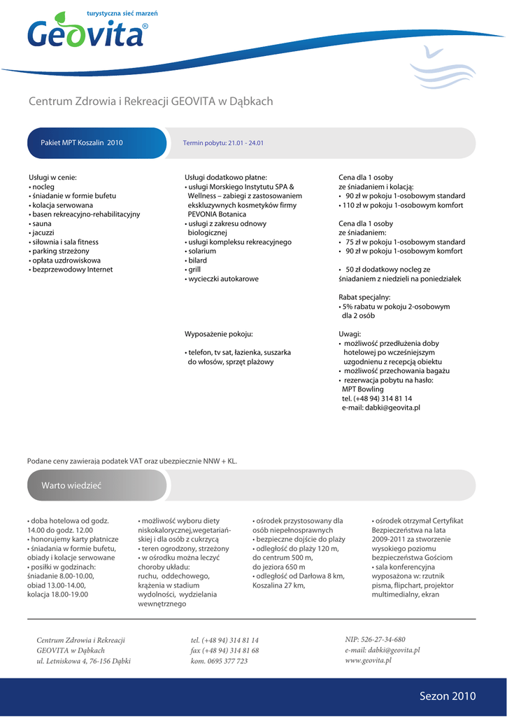 Centrum Zdrowia i Rekreacji GEOVITA w Dąbkach Pakiet MPT Koszalin 2010 Termin pobytu: 21.01 - 24.01 Usługi w cenie: • nocleg • śniadanie w formie bufetu • kolacja serwowana • basen rekreacyjno-rehabilitacyjny • sauna • jacuzzi • siłownia i sala fitness • parking strzeżony • opłata uzdrowiskowa • bezprzewodowy Internet Usługi dodatkowo płatne: • usługi Morskiego Instytutu SPA & Wellness – zabiegi z zastosowaniem ekskluzywnych kosmetyków firmy PEVONIA Botanica • usługi z zakresu odnowy biologicznej • usługi kompleksu rekreacyjnego • solarium • bilard • grill • wycieczki autokarowe Cena dla 1 osoby ze śniadaniem i kolacją: • 90 zł w pokoju 1-osobowym standard • 110 zł w pokoju 1-osobowym komfort Cena dla 1 osoby ze śniadaniem: • 75 zł w pokoju 1-osobowym standard • 90 zł w pokoju 1-osobowym komfort • 50 zł dodatkowy nocleg ze śniadaniem z niedzieli na poniedziałek Rabat specjalny: • 5% rabatu w pokoju 2-osobowym dla 2 osób Wyposażenie pokoju: • telefon, tv sat, łazienka, suszarka do włosów, sprzęt plażowy Uwagi: • możliwość przedłużenia doby hotelowej po wcześniejszym uzgodnienu z recepcją obiektu • możliwość przechowania bagażu • rezerwacja pobytu na hasło: MPT Bowling tel. (+48 94) 314 81 14 e-mail: [email protected] Podane ceny zawierają podatek VAT oraz ubezpiecznie NNW + KL. Warto wiedzieć • doba hotelowa od godz. 14.00 do godz. 12.00 • honorujemy karty płatnicze • śniadania w formie bufetu, obiady i kolacje serwowane • posiłki w godzinach: śniadanie 8.00-10.00, obiad 13.00-14.00, kolacja 18.00-19.00 Centrum Zdrowia i Rekreacji GEOVITA w Dąbkach ul. Letniskowa 4, 76-156 Dąbki • możliwość wyboru diety niskokalorycznej,wegetariańskiej i dla osób z cukrzycą • teren ogrodzony, strzeżony • w ośrodku można leczyć choroby układu: ruchu, oddechowego, krążenia w stadium wydolności, wydzielania wewnętrznego • ośrodek przystosowany dla osób niepełnosprawnych • bezpieczne dojście do plaży • odległość do plaży 120 m, do centrum 500 m, do jeziora 650 m • odległość od Darłowa 8 km, Koszalina 27 km, tel. (+48 94) 314 81 14 fax (+48 94) 314 81 68 kom. 0695 377 723 • ośrodek otrzymał Certyfikat Bezpieczeństwa na lata 2009-2011 za stworzenie wysokiego poziomu bezpieczeństwa Gościom • sala konferencyjna wyposażona w: rzutnik pisma, flipchart, projektor multimedialny, ekran NIP: 526-27-34-680 e-mail: [email protected] www.geovita.pl Sezon 2010