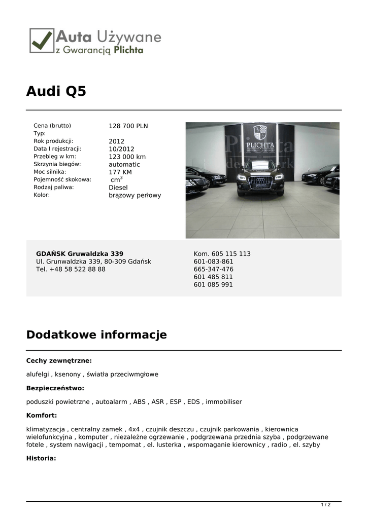 Audi Q5 Cena (brutto) Typ: Rok produkcji: Data I rejestracji: Przebieg w km: Skrzynia biegów: Moc silnika: Pojemność skokowa: Rodzaj paliwa: Kolor: 128 700 PLN 2012 10/2012 123 000 km automatic 177 KM cm3 Diesel brązowy perłowy GDAŃSK Gruwaldzka 339 Ul. Grunwaldzka 339, 80-309 Gdańsk Tel. +48 58 522 88 88 Kom. 605 115 113 601-083-861 665-347-476 601 485 811 601 085 991 Dodatkowe informacje Cechy zewnętrzne: alufelgi , ksenony , światła przeciwmgłowe Bezpieczeństwo: poduszki powietrzne , autoalarm , ABS , ASR , ESP , EDS , immobiliser Komfort: klimatyzacja , centralny zamek , 4x4 , czujnik deszczu , czujnik parkowania , kierownica wielofunkcyjna , komputer , niezależne ogrzewanie , podgrzewana przednia szyba , podgrzewane fotele , system nawigacji , tempomat , el. lusterka , wspomaganie kierownicy , radio , el. szyby Historia: 1/2 pierwszy właściciel , bezwypadkowy , serwisowany w ASO , garażowany Gwarancja Szanowni Państwo, Pragniemy Państwa poinformować, iż firma Plichta – Autoryzowany Dealer Škoda Auto prowadzi skup oraz sprzedaż samochodów używanych wszystkich marek, oferując także samochody używane z gwarancją objęte programem „Auta używane z Gwarancją Plichta”. W ramach programu „Auta Używane z Gwarancją Plichta ” każdy Klient otrzymuje atrakcyjny pakiet zniżek pozwalający zoptymalizować koszty eksploatacji samochodu: -50% na serwis klimatyzacji -50% na ustawienie zbieżności -50% na kosmetykę auta -50% na ścieżkę diagnostyczną -25% na wymiany oleju -25% na zakup opon + 5zł na sezon za hotelowanie opon -15% na części i akcesoria Oferujemy również kompleksową obsługę w zakresie finansowania i ubezpieczenia: - kredyty już od 4,99% - leasingi i kredyty bez zaświadczeń - uproszczone procedury – decyzja już od 30 min. - atrakcyjne pakiety AC/OC/NW/ASS wiodących firm ubezpieczeniowych Możliwość pozostawienia dotychczas użytkowanego auta w rozliczeniu – BEZPŁATNA WYCENA!!! Zapraszamy wszystkich Klientów na jazdę próbną wybranym autem. Numer oferty: C087 Informacja nie stanowi oferty w rozumieniu art. 66 KC. Podane dane mają charakter wyłącznie informacyjny. 2/2 Powered by TCPDF (www.tcpdf.org)