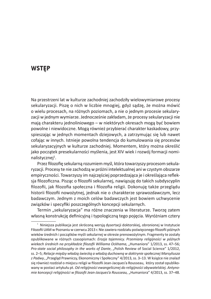 WSTĘP Na przestrzeni lat w kulturze zachodniej zachodziły wielowymiarowe procesy sekularyzacji. Piszę o nich w liczbie mnogiej, gdyż sądzę, że można mówić o wielu procesach, na różnych poziomach, a nie o jednym procesie sekularyzacji w jednym wymiarze. Jednocześnie zakładam, że procesy sekularyzacji nie mają charakteru jednoliniowego – w niektórych okresach mogą być bowiem powolne i niewidoczne. Mogą również przybierać charakter kaskadowy, przyspieszając w jednych momentach dziejowych, a zatrzymując się lub nawet cofając w innych. Istnieje powolna tendencja do kumulowania się procesów sekularyzacyjnych w kulturze zachodniej. Momentem, który można określić jako początek presekularności myślenia, jest XIV wiek i rozwój formacji nominalistycznej1. Przez filozofię sekularną rozumiem myśl, która towarzyszy procesom sekularyzacji. Procesy te nie zachodzą w próżni intelektualnej ani w czystym obszarze empiryczności. Towarzyszy im najczęściej poprzedzająca je i określająca refleksja filozoficzna. Pisząc o filozofii sekularnej, nawiązuję do takich subdyscyplin filozofii, jak filozofia społeczna i filozofia religii. Dokonuję także przeglądu historii filozofii nowożytnej, jednak nie o charakterze sprawozdawczym, lecz badawczym. Jednym z moich celów badawczych jest bowiem uchwycenie związków i specyfiki poszczególnych koncepcji sekularnych. Termin „sekularyzacja” ma różne znaczenia w literaturze. Tworzę zatem własną konstrukcję definicyjną i typologiczną tego pojęcia. Wyróżniam cztery 1 Niniejsza publikacja jest skróconą wersją dysertacji doktorskiej, obronionej w Instytucie Filozofii UAM w Poznaniu w czerwcu 2013 r. Nie zawiera rozdziału poświęconego filozofii późnych wieków średnich i początków myśli sekularnej w okresie prenowożytnym. Fragmenty te zostały opublikowane w różnych czasopismach: Erozja tajemnicy. Przemiany religijności w późnych wiekach średnich na przykładzie filozofii Williama Ockhama, „Humaniora” 1/2013, ss. 47–56; Pro-state social philosophy in the works of Dante, „Polish Review of Social Science” 1/2012, ss. 2–5; Relacje między władzą świecką a władzą duchowną w doktrynie społecznej Marsyliusza z Padwy, „Przegląd Prawniczy, Ekonomiczny i Społeczny” 4/2013, ss. 3–13. W książce nie znalazł się również rozdział o miejscu religii w filozofii Jean-Jacques’a Rousseau, który został opublikowany w postaci artykułu pt. Od religijności ewangelicznej do religijności obywatelskiej. Antynomie koncepcji religijności w filozofii Jean-Jacques’a Rousseau, „Humaniora” 4/2013, ss. 37–48. 8 WSTĘP poziomy sekularyzacji, które wyznaczają niejako „twardość” tego terminu. Można przyjąć, że wraz z każdym kolejnym poziomem sekularyzacja jest „miększa”, a więc coraz trudniejsza do uchwycenia, co nie znaczy, że jej nie ma. Pierwszy poziom stanowi sekularyzacja materialna. Jest to najbardziej pierwotne znaczenie tego terminu, związane z utratą i konfiskatą majątków przez kościoły i stan duchowny. Ta płaszczyzna sekularyzacji zajmuje najmniej miejsca w książce – jako kontekst, a nie sedno rozważań, gdyż jest to problem należący głównie do obszaru historii religii oraz historii gospodarczej. Drugim poziomem jest sekularyzacja w wymiarze instytucjonalnym, czyli publicznym. Jest to sekularyzacja, która jako kwestia problemowa była dostrzegana już w nowożytnej myśli sekularnej, przedstawionej w pierwszym rozdziale książki. Sekularyzacja instytucjonalna dotyczy wszystkich zewnętrznych i uchwytnych społecznie bytów, a więc niejako całej sfery publicznej. Jest ona także często łączona z problemem sporów między władzą świecką a poszczególnymi kościołami, co będzie jednym z analizowanych problemów. Trzecim poziomem sekularyzacji jest jej płaszczyzna indywidualna. Tak rozumiana sekularyzacja dotyczy religijności wewnętrznej, poglądów jednostek niekoniecznie wyrażanych publicznie, a także szeroko rozumianej „niewidzialnej duchowości”. Jest to poziom sekularyzacji trudniejszy do uchwycenia niż sekularyzacja instytucjonalna. Można jednak odnaleźć taką płaszczyznę problemową w różnych okresach i etapach filozofii sekularnej. Czwarty poziom sekularyzacji obejmuje obszar kulturowy, w tym przemiany treści religijnych w szeroko rozumianej kulturze – filozofii, nauce, literaturze, sztuce i innych dziedzinach kultury. Współcześnie zjawiskiem towarzyszącym sekularyzacji kulturowej jest jej postsekularny nurt, omawiany w trzecim i czwartym rozdziale książki. Przez filozofię postsekularną rozumiem myśl, która uznając, że w kulturze zachodniej zaszły realne procesy sekularyzacji, dąży do restytucji religii jako wartości w kulturze. Trudno precyzyjnie wyznaczyć początek refleksji postsekularnej, przyjmuję jednak, że pojawiła się ona w myśli następującej po Weberze, w niektórych obszarach filozofii współczesnej. Te cztery poziomy sekularyzacji mogą pojawiać się w różnych kombinacjach. Może się zdarzyć, że w odcinkowym procesie sekularyzacji wystąpi tylko jeden z tych poziomów, a pozostałe się nie pojawią. Może być też tak, że w danej filozofii obecne będą wszystkie cztery poziomy – wówczas będziemy mieć do czynienia z „mocną” sekularyzacją. W praktyce rzadko jednak zachodzi taka sytuacja. W rozdziałach dotyczących współczesności przedstawię różne spory na temat sekularyzacji, które toczą się obok filozofii postsekularnej, także w ramach socjologii religii. Główną tezą książki jest twierdzenie, że filozofia sekularna pełni wobec procesów sekularyzacji funkcję inspirującą lub rozumiejącą rzeczywistość społeczno-kulturową. Funkcja inspirująca, wyprzedzająca proces sekularyzacji, WSTĘP 9 widoczna jest zwłaszcza w filozofii nowożytnej, przed ukazaniem się pism Maxa Webera. Funkcja rozumiejąca, a więc st