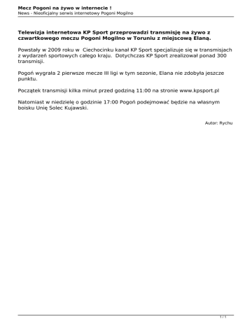 Mecz Pogoni na żywo w internecie ! News - Nieoficjalny serwis internetowy Pogoni Mogilno Telewizja internetowa KP Sport przeprowadzi transmisję na żywo z czwartkowego meczu Pogoni Mogilno w Toruniu z miejscową Elaną. Powstały w 2009 roku w Ciechocinku kanał KP Sport specjalizuje się w transmisjach z wydarzeń sportowych całego kraju. Dotychczas KP Sport zrealizował ponad 300 transmisji. Pogoń wygrała 2 pierwsze mecze III ligi w tym sezonie, Elana nie zdobyła jeszcze punktu. Początek transmisji kilka minut przed godziną 11:00 na stronie www.kpsport.pl Natomiast w niedzielę o godzinie 17:00 Pogoń podejmować będzie na własnym boisku Unię Solec Kujawski. Autor: Rychu 1/1 Powered by TCPDF (www.tcpdf.org)
