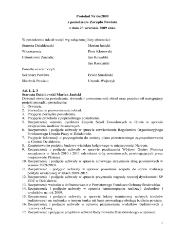 Protokół Nr 66/2009 z posiedzenia Zarządu Powiatu z dnia 23 września 2009 roku W posiedzeniu udział wzięli wg załączonej listy obecności: Starosta Działdowski Marian Janicki Wicestarosta Piotr Kłosowski Członkowie Zarządu: Jan Kowalski Jan Raczyński Ponadto uczestniczyli: Sekretarz Powiatu Erwin Smoliński Skarbnik Powiatu Urszula Wojtczyk Ad. 1, 2, 3 Starosta Działdowski Marian Janicki Dokonał otwarcia posiedzenia, stwierdził prawomocność obrad oraz przedstawił następujący projekt porządku posiedzenia: 1. Otwarcie. 2. Stwierdzenie prawomocności obrad. 3. Przyjęcie porządku posiedzenia. 4. Przyjęcie protokołu z poprzedniego posiedzenia. 5. Rozpatrzenie wniosku dyrektora Zespołu Szkół Zawodowych w Iłowie w sprawie zwiększenia środków finansowych. 6. Rozpatrzenie i podjęcie uchwały w sprawie zatwierdzenia Regulaminu Organizacyjnego Powiatowego Urzędu Pracy w Działdowie. 7. Przyjęcie informacji o przystąpieniu do zmiany planu przestrzennego zagospodarowania w Gminie Działdowo. 8. Zaopiniowanie projektu budowy wiaduktu kolejowego w miejscowości Narzym. 9. Rozpatrzenie i podjęcie uchwały w sprawie przekazania Wójtowi Gminy Płośnica zarządzania w latach 2010 i 2011 odcinkami dróg powiatowych, przebiegających przez miejscowość Płośnica. 10. Rozpatrzenie i podjęcie uchwały w sprawie zimowego utrzymania dróg powiatowych w sezonie 2009/2010. 11. Rozpatrzenie i podjęcie uchwały w sprawie powołania zespołu do spraw realizacji polityki oświatowej w latach 2009-2015. 12. Rozpatrzenie i podjęcie uchwały w sprawie przyznania nagrody rocznej dyrektorowi SP ZOZ w Działdowie. 13. Rozpatrzenie wniosku o dofinansowanie z Powiatowego Funduszu Ochrony Środowiska. 14. Rozpatrzenie i podjęcie uchwały w sprawie harmonogramu realizacji dochodów i wydatków na rok 2009. 15. Rozpatrzenie i podjęcie uchwały w sprawie lokaty terminowej wolnych środków budżetowych na rachunku w innym banku niż bank prowadzący obsługę budżetu powiatu. 16. Rozpatrzenie i podjęcie uchwały w sprawie przeniesienia wydatków budżetowych z rezerwy celowej. 17. Rozpatrzenie i przyjęcie projektów uchwał Rady Powiatu Działdowskiego w sprawie: 1 - wyrażenia opinii do projektu uchwały Sejmiku Województwa Kujawsko-Pomorskiego w sprawie likwidacji Regionalnego Zespołu Opieki Paliatywnej – Dom Sue Ryder w Bydgoszczy, - likwidacji internatu przy Zespole Szkół w Gródkach, - zmiany uchwały Nr XXII/178/09 Rady Powiatu Działdowskiego z dnia 29 czerwca 2009 roku w sprawie: zatwierdzenia realizacji projektu w latach 2009, 2010 i 2011 pt: „Edukacja zawodowa naszą przyszłością – uczyć i kształcić lepiej” w ramach Priorytetu IX „Rozwój wykształcenia i kompetencji w regionach” Działanie 9.2 „Podniesienie atrakcyjności i jakości szkolnictwa zawodowego” Programu Operacyjnego Kapitał Ludzki dofinansowanego ze środków Europejskiego Funduszu Społecznego i Budżetu Państwa, - udzielania pomocy finansowej dla Miasta Grybów, - zmiany budżetu powiatu działdowskiego na 2009 rok. 18. Sprawy bieżące. 19. Wolne wnioski. 20. Zamknięcie obrad. Wicestarosta Działdowski Piotr Kłosowski Zaproponował wprowadzić jako dodatkowy punkt 18 wykup działek pod drogę powiatową w miejscowości Niechłonin. Zarząd Powiatu jednogłośnie przyjął następujący porządek posiedzenia: 1. Otwarcie. 2. Stwierdzenie prawomocności obrad. 3. Przyjęcie porządku posiedzenia. 4. Przyjęcie protokołu z poprzedniego posiedzenia. 5. Rozpatrzenie wniosku dyrektora Zespołu Szkół Zawodowych w Iłowie w sprawie zwiększenia środków finansowych. 6. Rozpatrzenie i podjęcie uchwały w sprawie zatwierdzenia Regulaminu Organizacyjnego Powiatowego Urzędu Pracy w Działdowie. 7. Przyjęcie informacji o przystąpieniu do zmiany planu przestrzennego zagospodarowania w Gminie Działdowo. 8. Zaopiniowanie projektu budowy wiaduktu kolejowego w miejscowości Narzym. 9. Rozpatrzenie i podjęcie uchwały w sprawie przekazania Wójtowi Gminy Płośnica zarządzania w latach 2010 i 2011 odcinkami dróg powiatowych, przebiegających przez miejscowość Płośnica. 10. Rozpatrzenie i podjęcie uchwały w sprawie zimowego utrzymania dróg powiatowych w sezonie 2009/2010. 11. Rozpatrzenie i podjęcie uchwały w sprawie powołania zespołu do spraw realizacji polityki oświatowej w latach 2009-2015. 12. Rozpatrzenie i podjęcie uchwały w sprawie przyznania nagrody rocznej dyrektorowi SP ZOZ w Działdowie. 13. Rozpatrzenie wniosku o dofinansowanie z Powiatowego Funduszu Ochrony Środowiska. 14. Rozpatrzenie i podjęcie uchwały w sprawie harmonogramu realizacji dochodów i wydatków na rok 2009. 15. Rozpatrzenie i podjęcie uchwały w sprawie lokaty terminowej wolnych środków budżetowych na rachunku w innym banku niż bank prowadzący obsługę budżetu powiatu. 16. Rozpatrzenie i podjęcie uchwały w sprawie przeniesienia wydatków budżetowych z rezerwy celowej. 17. Rozpatrzenie i przyjęcie projektów uchwał Rady Powiatu Działdowskiego w sprawie: 2 - wyrażenia opinii do projektu uchwały Sejmiku Województwa Kujawsko-Pomorskiego w sprawie likwidacji Regionalnego Zespołu Opieki Paliatywnej – Dom Sue Ryder w Bydgoszczy, - likwidacji internatu przy Zespole Szkół w Gródkach, - zmiany uchwały Nr XXII/178/09 Rady Powiatu Działdowskiego z dnia 29 czerwca 2009 roku w sprawie: zatwierdzenia realizacji projektu w latach 2009, 2010 i 2011 pt: „Edukacja zawodowa naszą przyszłością – uczyć i kształcić lepiej” w ramach Priorytetu IX „Rozwój wykształcenia i kompetencji w regionach” Działanie 9.2 „Podniesienie atrakcyjności i jakości szkolnictwa zawodowego” Programu Operacyjnego Kapitał Ludzki dofinansowanego ze środków Europejskiego Funduszu Społecznego i Budżetu Państwa, - udzielania pomocy finansowej dla Miasta Grybów, - zmiany budżetu powiatu działdowskiego na 2009 rok. 18. Wykup działek pod drogę powiatową w miejscowości Niechłonin.