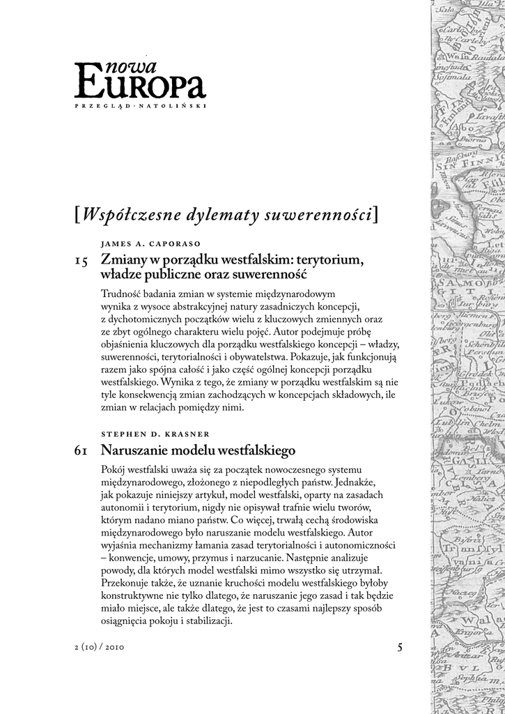 [Współczesne dylematy suwerenności] JAMES A. CAPORASO 15 Zmiany w porządku westfalskim: terytorium, władze publiczne oraz suwerenność Trudność badania zmian w systemie międzynarodowym wynika z wysoce abstrakcyjnej natury zasadniczych koncepcji, z dychotomicznych początków wielu z kluczowych zmiennych oraz ze zbyt ogólnego charakteru wielu pojęć. Autor podejmuje próbę objaśnienia kluczowych dla porządku westfalskiego koncepcji – władzy, suwerenności, terytorialności i obywatelstwa. Pokazuje, jak funkcjonują razem jako spójna całość i jako część ogólnej koncepcji porządku westfalskiego. Wynika z tego, że zmiany w porządku westfalskim są nie tyle konsekwencją zmian zachodzących w koncepcjach składowych, ile zmian w relacjach pomiędzy nimi. STEPHEN D. KRASNER 61 Naruszanie modelu westfalskiego Pokój westfalski uważa się za początek nowoczesnego systemu międzynarodowego, złożonego z niepodległych państw. Jednakże, jak pokazuje niniejszy artykuł, model westfalski, oparty na zasadach autonomii i terytorium, nigdy nie opisywał trafnie wielu tworów, którym nadano miano państw. Co więcej, trwałą cechą środowiska międzynarodowego było naruszanie modelu westfalskiego. Autor wyjaśnia mechanizmy łamania zasad terytorialności i autonomiczności – konwencje, umowy, przymus i narzucanie. Następnie analizuje powody, dla których model westfalski mimo wszystko się utrzymał. Przekonuje także, że uznanie kruchości modelu westfalskiego byłoby konstruktywne nie tylko dlatego, że naruszanie jego zasad i tak będzie miało miejsce, ale także dlatego, że jest to czasami najlepszy sposób osiągnięcia pokoju i stabilizacji. 2 (10) / 2010 5 JOHN GERARD RUGGIE 116 Wykraczając poza terytorialność: modernizm w stosunkach międzynarodowych Celem artykułu jest określenie stanu wiedzy w zakresie rozstrzygnięcia kwestii, czy nowoczesny system państwowy poddaje się postmodernistycznym formom konfiguracji przestrzeni politycznej. Praca streszcza główne wątki debaty dotyczącej postmodernizmu, która nie rozwiązuje jednak całkowicie tego problemu, gdyż praktycznie nie porusza kwestii współczesnego systemu państwowego. Ponieważ w literaturze zajmującej się współczesnym systemem państwowym brak wspólnego słownictwa na wyrażenie zmiany i ciągłości, lwia część pracy jest poświęcona preteoretycznemu zadaniu - poszukiwaniu słownictwa i wymiarów analizy, które pozwolą zadawać systematyczne pytania na temat postmodernistycznych tendencji w świecie. JACEK CZAPUTOWICZ 176 Pojęcie suwerenności Badacze utrzymują, że suwerenność jest niedefiniowalna lub że jest jednym z najbardziej kontestowanych i kontrowersyjnych pojęć. Suwerenność jest konceptem wieloznacznym, nie ma jednego, akceptowanego przez wszystkich znaczenia. Oznacza pewien stan, pytanie o naturę tego stanu oraz jego uzasadnienie w kategoriach wartości. Cechą suwerenności jest brak minimalnych niepodważalnych kryteriów, które ją definiują. Państwa zawsze nadawały suwerenności taką treść, która nie ograniczała ich swobody działania w zmieniających się warunkach historycznych. PIOTR SZLAGOWSKI 197 Kazus Kosowa a legitymizacja suwerenności jako paradygmatu stosunków międzynarodowych Od czasu interwencji wojsk NATO w Kosowie komentatorzy stosunków międzynarodowych oraz prawa międzynarodowego uznają wydarzenia dotyczące tego regionu za przypadek niezwykłej wagi. W najnowszą historię Kosowa wplecione są bowiem liczne problemy dotyczące zagadnień konstytutywnych dla współczesnych stosunków międzynarodowych i prawa międzynarodowego, m.in. znaczenia suwerenności państwowej i jej granic, możliwości użycia siły w ramach interwencji humanitarnej czy realizacji prawa do samostanowienia. W niniejszym artykule pochylimy się nad jedną z tych kwestii znaczeniem kazusu kosowskiego dla suwerenności jako paradygmatu współczesnych stosunków międzynarodowych. 6 [Polityka zagraniczna Obamy – próba bilansu] JAN TOKARSKI 225 „Zmiana” po roku, rok po „zmianie” Od zaprzysiężenia Baracka Obamy minęły prawie dwa lata. Jest to dobry moment, by spróbować w sposób możliwie syntetyczny i usystematyzowany ocenić ten okres i odpowiedzieć na kilka istotnych pytań. To, które chciałbym uczynić osią niniejszego eseju, brzmi: czy zapowiadana przez pierwszego czarnoskórego prezydenta w historii USA „zmiana” faktycznie miała miejsce, szczególnie w obszarze polityki międzynarodowej? Czy w sposób wyraźny widać już, że polityka Obamy w porównaniu z polityką Busha stanowi jakąś istotną odmianę? Na czym polega owa zmiana? Jakie są jej teoretyczne fundamenty? Aby się o tym przekonać, musimy zderzyć prowadzoną przez Obamę politykę z doktryną Busha i w ten sposób spróbować określić podstawowe różnice między nimi. 2 (10) / 2010 7 [Historia myśli europejskiej] PIOTR KOSMALA 247 Uczeń i Mistrz. Krzysztofa Skubiszewskiego i Władysława Studnickiego spotkanie w okupowanej Warszawie Zmarły niedawno prof. Krzysztof Skubiszewski w marcu 1996 roku brał udział w konwersatorium Centrum Stosunków Międzynarodowych, poświęconym stosunkom polsko-niemieckim. Otwierając je, zdecydował się oddać publiczny hołd osobie Władysława Studnickiego – postaci nieco dziś zapomnianej, a może wręcz z premedytacją pomijanej, a przecież będącej jednym z faktycznych twórców odrodzonej po czasach zaborów Polski. W ten sposób powracał do czasów okupacji niemieckiej, do pewnego mieszkania na warszawskiej Ochocie i do spotkań, które ukształtowały światopogląd oraz drogę życiową pierwszego ministra spraw zagranicznych odrodzonej raz wtóry Rzeczypospolitej. 8 [Recenzje] OLAF OSICA 257 Sierpniowe salwy AD 2008 RON ASMUS, A Little War that Shook the World. Georgia, Russia, and the Future of the West, Palgrave Macmillan 2010. JERZY UKLAŃSKI 260 Potęga istotą polityki HANS J. MORGENTHA