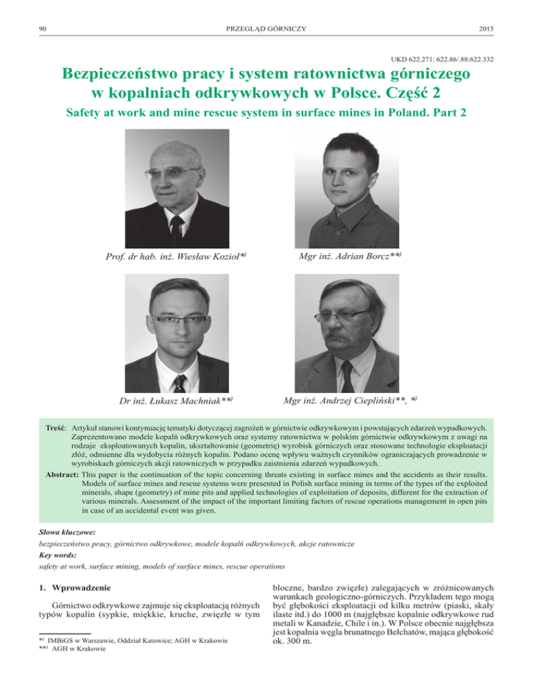 90 PRZEGLĄD GÓRNICZY 2015 UKD 622.271: 622.86/.88:622.332 Bezpieczeństwo pracy i system ratownictwa górniczego w kopalniach odkrywkowych w Polsce. Część 2 Safety at work and mine rescue system in surface mines in Poland. Part 2 Prof. dr hab. inż. Wiesław Kozioł*) Mgr inż. Adrian Borcz**) Dr inż. Łukasz Machniak**) Mgr inż. Andrzej Ciepliński**, *) Treść: Artykuł stanowi kontynuację tematyki dotyczącej zagrożeń w górnictwie odkrywkowym i powstających zdarzeń wypadkowych. Zaprezentowano modele kopalń odkrywkowych oraz systemy ratownictwa w polskim górnictwie odkrywkowym z uwagi na rodzaje eksploatowanych kopalin, ukształtowanie (geometrię) wyrobisk górniczych oraz stosowane technologie eksploatacji złóż, odmienne dla wydobycia różnych kopalin. Podano ocenę wpływu ważnych czynników ograniczających prowadzenie w wyrobiskach górniczych akcji ratowniczych w przypadku zaistnienia zdarzeń wypadkowych. Abstract: This paper is the continuation of the topic concerning threats existing in surface mines and the accidents as their results. Models of surface mines and rescue systems were presented in Polish surface mining in terms of the types of the exploited minerals, shape (geometry) of mine pits and applied technologies of exploitation of deposits, different for the extraction of various minerals. Assessment of the impact of the important limiting factors of rescue operations management in open pits in case of an accidental event was given. Słowa kluczowe: bezpieczeństwo pracy, górnictwo odkrywkowe, modele kopalń odkrywkowych, akcje ratownicze Key words: safety at work, surface mining, models of surface mines, rescue operations 1. Wprowadzenie Górnictwo odkrywkowe zajmuje się eksploatacją różnych typów kopalin (sypkie, miękkie, kruche, zwięzłe w tym *) IMBiGS w Warszawie, Oddział Katowice; AGH w Krakowie **) AGH w Krakowie bloczne, bardzo zwięzłe) zalegających w zróżnicowanych warunkach geologiczno-górniczych. Przykładem tego mogą być głębokości eksploatacji od kilku metrów (piaski, skały ilaste itd.) do 1000 m (najgłębsze kopalnie odkrywkowe rud metali w Kanadzie, Chile i in.). W Polsce obecnie najgłębsza jest kopalnia węgla brunatnego Bełchatów, mająca głębokość ok. 300 m. Nr 12 PRZEGLĄD GÓRNICZY Odkrywkowe wyrobiska górnicze z uwagi na różne ukształtowanie i wyposażenie techniczne stanowią odmienne środowiska pracy i zróżnicowane są pod kątem możliwości prowadzenia prac ratowniczych. W związku z tym zaistniałe wypadki wymagają podejmowania odpowiednio przygotowanych akcji ratunkowych, m.in. z uwzględnieniem odpowiedniej organizacji i dobieranego sprzętu. Także czynności podejmowane w akcjach ratunkowych mogą się od siebie różnić nieznacznie bądź mogą być całkowicie odmienne. Dlatego też w pracy przeprowadzono krótką charakterystykę uwarunkowań środowiskowych kopalń odkrywkowych i możliwości prowadzenia w nich prac ratowniczych. Do tego celu zaproponowano zestaw czynników i warunków, które determinują możliwość podjęcia działań ratowniczych w sytuacjach zaistnienia wypadków. Prowadzenie akcji ratunkowych związane jest z możliwością jak najszybszego dotarcia pomocy do poszkodowanego oraz z warunkami prowadzenia samej akcji. Zatem z punktu widzenia kopalń ważnyjest ich przestrzenny model i lokalizacja dróg transportowych, a także techniczne wyposażenie kopalń, szczególnie stosowane podstawowe układy technologiczne. 2. Modele funkcjonalne kopalń odkrywkowych ze szczególnym uwzględnieniem możliwości prowadzenia akcji ratunkowych Aby określić odpowiednie możliwości zastosowania systemów ratownictwa należy scharakteryzować modele kopalń w jakich możemy prowadzić akcje ratunkowe. W tym celu niezbędne jest zdefiniowanie uwarunkowań wpływających na zagrożenia i na sposób oraz szybkość prowadzenia akcji ratunkowych. Zaliczyć do nich należy: – rodzaj eksploatowanych skał (zwięzłe, bloczne, okruchowe, miękkie), – typ wyrobiska (wgłębne, stokowe, stokowo-wgłębne), – sposób urabiania złoża i nadkładu (mechaniczny, materiałem wybuchowym), – gabaryty wyrobiska eksploatacyjnego (np. głębokość eksploatacji), w tym wysokość pięter i kąt nachylenia skarp, – rodzaj stosowanego transportu technologicznego, – lokalizacja wypadku z uwagi na typ eksploatacji (ląd, basen eksploatacyjny), – rodzaj i stan nawierzchni dróg dojazdowych, pochylni itp., – odległość miejsca wypadku od miejsca przyjazdu karetki – karetka nie zawsze ma możliwość dojechać do poszkodowanego, – występowanie przeszkód terenowych (np. trasy przenośników taśmowych), jako ograniczeń bezpośredniego dojazdu karetką lub innym pojazdem do miejsca wypadku, – czynniki atmosferyczne (opady, niskie temperatury itp.), – inne. Eksploatacja odkrywkowa z racji prowadzenia prac wydobywczych na otwartej przestrzeni jest metodą bardziej bezpieczną od eksploatacji podziemnej (dużo mniej wypadków śmiertelnych i ciężkich), jest również znacznie korzystniejsza i prostsza do prowadzenia prac ratowniczych. Pomimo tego, że warunki jakie występują w kopalniach odkrywkowych niekiedy nieznacznie różnią się od siebie, to wyróżnić jednak można kilka modeli funkcjonalnych kopalń, wynikających m.in. z: – rodzaju eksploatowanych skał, – uwarunkowań eksploatacyjnych (eksploatacja lądowa, spod wody itd.), – stosowanych technologii urabiania i sposobów transportu kopaliny i nadkładu (infrastruktura techniczna), – struktur geometrycznych wyrobisk itp. 91 Uwzględnienie powyższych czynników pozwala na przyjęcie kilku typowych modeli funkcjonalnych kopalń odkrywkowych w Polsce, jak i zagranicą, dla których rozważane będą uwarunkowania prowadzenia akcji ratunkowych.W pracy przyjęto 5 podstawowych typów kopalń odkrywkowych, których kolejność podano w zależności od wstępnej oceny trudności prowadzenia akcji rat