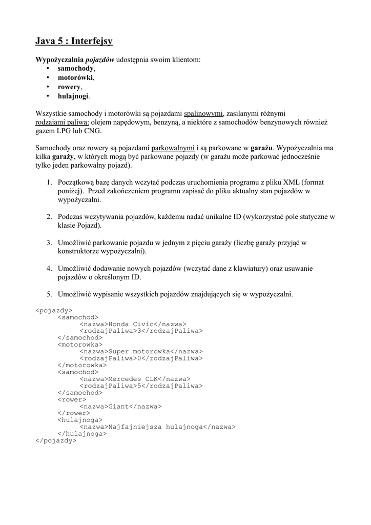 Java 5 : Interfejsy Wypożyczalnia pojazdów udostępnia swoim klientom: • samochody, • motorówki, • rowery, • hulajnogi. Wszystkie samochody i motorówki są pojazdami spalinowymi, zasilanymi różnymi rodzajami paliwa: olejem napędowym, benzyną, a niektóre z samochodów benzynowych również gazem LPG lub CNG. Samochody oraz rowery są pojazdami parkowalnymi i są parkowane w garażu. Wypożyczalnia ma kilka garaży, w których mogą być parkowane pojazdy (w garażu może parkować jednocześnie tylko jeden parkowalny pojazd). 1. Początkową bazę danych wczytać podczas uruchomienia programu z pliku XML (format poniżej). Przed zakończeniem programu zapisać do pliku aktualny stan pojazdów w wypożyczalni. 2. Podczas wczytywania pojazdów, każdemu nadać unikalne ID (wykorzystać pole statyczne w klasie Pojazd). 3. Umożliwić parkowanie pojazdu w jednym z pięciu garaży (liczbę garaży przyjąć w konstruktorze wypożyczalni). 4. Umożliwić dodawanie nowych pojazdów (wczytać dane z klawiatury) oraz usuwanie pojazdów o określonym ID. 5. Umożliwić wypisanie wszystkich pojazdów znajdujących się w wypożyczalni. <pojazdy> <samochod> <nazwa>Honda Civic</nazwa> <rodzajPaliwa>3</rodzajPaliwa> </samochod> <motorowka> <nazwa>Super motorowka</nazwa> <rodzajPaliwa>0</rodzajPaliwa> </motorowka> <samochod> <nazwa>Mercedes CLK</nazwa> <rodzajPaliwa>5</rodzajPaliwa> </samochod> <rower> <nazwa>Giant</nazwa> </rower> <hulajnoga> <nazwa>Najfajniejsza hulajnoga</nazwa> </hulajnoga> </pojazdy> Wskazówki do rozwiązania zadania: – wszystkie pogrubione słowa to klasy (pochylone – klasy abstrakcyjne), – wszystkie podkreślone słowa to interfejsy, – rodzaj paliwa należy przechować wykorzystując arytmetykę bitową, – garaż powinien posiadać informacje o tym czy jest pusty, a pojazd parkowalny powinien posiadać referencję do garażu, w którym jest zaparkowany, – interfejs Spalinowy powinien wymuszać implementację metody umożliwiającej tankowanie (określoną liczbę litrów danego typu paliwa; wartość zwracana określająca czy wybrano odpowiedni rodzaj paliwa) oraz odczyt rodzaju paliwa, – interfejs Parkowalny powinien implementację metody umożliwiającej parkowanie pojazdu w podanym garażu – wartość zwracana określająca czy udało się zaparkować auto (czy garaż był pusty) oraz wyparkowanie pojazdu.