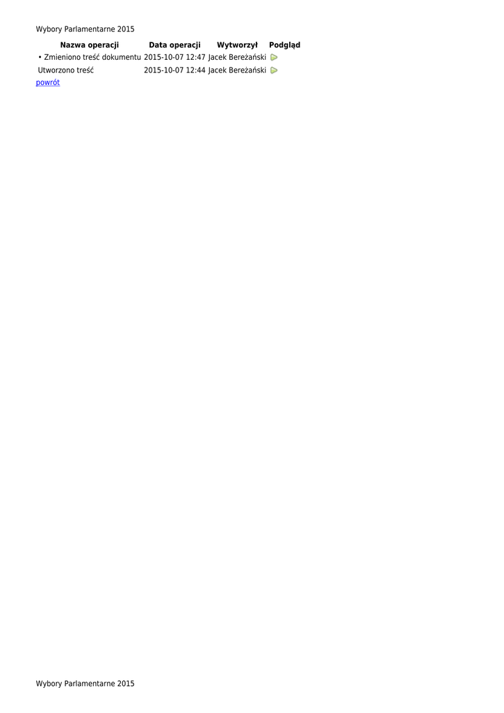 Wybory Parlamentarne 2015 Nazwa operacji Data operacji Wytworzył • Zmieniono treść dokumentu 2015-10-07 12:47 Jacek Bereżański Utworzono treść powrót Wybory Parlamentarne 2015 2015-10-07 12:44 Jacek Bereżański Podgląd