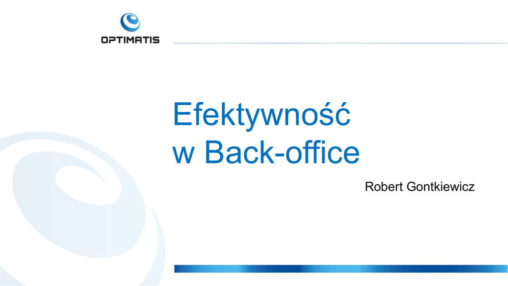 Efektywność w Back-office Robert Gontkiewicz Definicje Back-office, dział wsparcia, centrum usług wspólnych: administracja, zakupy, kadry i płace, Szkolenia, obsługa prawna, marketing i PR …. Back office to administracyjna jednostka, której wsparcie jest niezbędne do właściwego funkcjonowaniem poszczególnych gałęzi biznesu. (źródło: Wikipedia) 2 Czy uważasz, że: • użytkownicy/pracownicy nie wiedzą z kim w jakim temacie mają się kontaktować • organizacja się centralizuje i rośnie a komórki wsparciowe przestały za nim nadążać ? • mimo mnóstwa włożonej uwagi i środków organizacja nie działa efektywnie ? • komunikacja i usługi wewnętrzne mogłyby być jeszcze bardziej efektywne ? 3 Oferta OPTIMATIS – efektywność back office • Usługowy model działania - definiowanie usług, budowa relacji z klientami • Cyfryzacja procesów - wykorzystanie rozwiązań informatycznych, optymalizacja procesów • Gromadzenie i wykorzystywanie informacji - tworzenie systemów raportowania, budowa świadomości wartości informacji 4 Oferta - efektywność back-office /1/ Usługi zdefiniowanie obszarów wsparcia określenie parametrów, ustalenie priorytetów i warunków brzegowych Procesy identyfikacja zgłoszeń od użytkowników kategoryzacja zleceń wdrożenie czytelnych schematów obsługi wdrożenie systemu do obsługi zgłoszeń 5 Oferta - efektywność back-office /2/ Pracownicy zdefiniowanie zadań komunikacja wewnątrz firmy budowa bazy wiedzy transfer wiedzy Raportowanie kompletne raporty managerskie dashboard-y operacyjne analiza funkcjonowania 6 Typowy Projekt Ustalenie stanu obecnego organizacji i zaplanowanie działań (2-3 tygodnie) Kompletna usługa Szkolenia z modelu usługowego Warsztaty prezentujące narzędzia (2x2 dni) Opracowanie koncepcji funkcjonowania w tym: Katalog usług, opis procesów Role i zadania (1-4 miesięcy) Implementacja procesów, Wdrożenie i konfiguracja narzędzia Komunikacja zmiany (1-2 miesięcy) Wdrożenie rozwiązania Bieżący nadzór i wsparcie na etapie wdrożenia (3 miesiące) Wsparcie w okresie wdrożenia Budowa rozwiązania Transfer wiedzy Analiza wstępna 7 PRODUKTY • Usługi i zadania -zdefiniowane i zwymiarowane • Zakresy odpowiedzialności - za każdy rodzaj działalności • Zasady podejście do każdego użytkownika – w tym do VIPów i sytuacji awaryjnych • Procesy obsługi zgłoszeń - wdrożone dla wszystkich usług • Narzędzie do zarządzania i obsługi zgłoszeń oraz komunikacji z użytkownikiem • Raporty - Możliwość analizy i monitorowania jakości pracy 8 Korzyści z zarządzania zgłoszeniami Skrócenie czasu obsługi zgłoszeń do 50% Zadowolony użytkownik - w skali 1-10 nawet o 4 pkt Dostosowane parametry usług pod rzeczywiste potrzeby - O 40% mniej nietrafionych zgłoszeń Niższe koszty jednostkowe obsługi zgłoszenia - nawet o 30% po 6 m-cach Informacja o zgłoszeniu w dowolnym czasie i miejsca liczba „telefonów o status” spada o ponad 60% Możliwe różne formy komunikacji telefon/www/e-mail/e-mobile/sms/osobiście Standaryzacja procesów - jawność działania wobec użytkowników, powtarzalność „zapisana” w aplikacji 9 Typowa obsługa zgłoszenia osobiście telefonicznie • WnarzędziuIT • Zinformacjązwrotnądoużytkownika Diagnoza E-mail Www Formularzz Identyfikacja narzędzia Rejestracja Kategoryzacja Nadaniepriorytetu Rozwiązanieiprzywróceniedziałania Zamknięciezgłoszenia • Wzależnościodrodzajuusługi • Wzależnościodosobyzgłaszającej Systemy monitoringu 10 O MNIE • 14 lat na rynku doradztwa i szkoleń, ostatnie 4 lata jako CEO • 12 lat doświadczenia w zarządzaniu usługami IT (ITSM) • Ponad 30 zrealizowanych osobiście projektów z zakresu efektywności IT w ciągu ostatnich 10 lat • Bogate doświadczenie specjalistyczne jako członek zespołu projektowego w ponad 60 projektach informatycznych, • Współzałożyciel HDI Poland • Współorganizator i członek jury Konkursu Lider Wsparcia IT • Ekspert i trener z zakresu Governance IT, Security i Project Management 11 Dziękuję za uwagę Zapraszam do kontaktu Robert Gontkiewicz [email protected] +48 500 217 448 OPTIMATIS Sp. z o.o. ul. Kwitnącego Sadu 9 02-202 Warszawa T: + 48 22 578 55 20 F: + 48 22 578 55 39 www.optimatis.pl