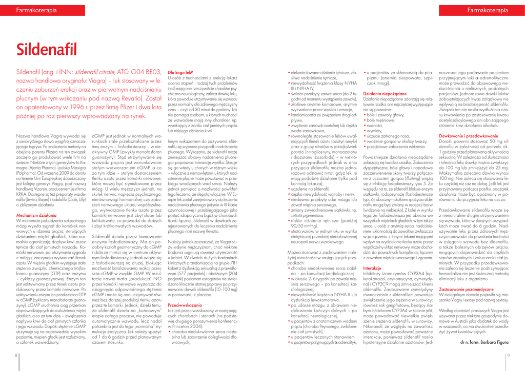 Farmakoterapia Farmakoterapia Sildenafil Sildenafil (ang. i INN: sildenafil citrate, ATC: G04 BE03, nazwa handlowa oryginału: Viagra) – lek stosowany w leczeniu zaburzeń erekcji oraz w pierwotnym nadciśnieniu płucnym (w tym wskazaniu pod nazwą Revatio). Został on opatentowany w 1996 r. przez firmę Pfizer i dwa lata później po raz pierwszy wprowadzony na rynek. Nazwa handlowa Viagra wywodzi się z sanskryckiego słowa wjaghra, oznaczającego tygrysa. Po znalezieniu metody na obejście patentu Pfizera na ten związek zaczęło go produkować wiele firm na świecie. Niektóre z tych generyków to Kamagra (Ajanta Pharma) i polska Maxigra (Polpharma). Od września 2009 do obrotu na terenie Unii Europejskiej dopuszczony jest kolejny generyk Viagry, pod nazwą handlową Vizarsin, producentem jest firma KRKA. Dostępne są też preparaty wardenafilu (Levitra, Bayer) i tadalafilu (Cialis, Lilly) o zbliżonym działaniu. Mechanizm działania W momencie pobudzenia seksualnego mózg wysyła sygnał do komórek nerwowych u rdzenia prącia, sterujących działaniem mięśni gładkich, które normalnie ograniczają dopływ krwi przez tętnice do ciał jamistych narządu. Komórki nerwowe, po otrzymaniu sygnału z mózgu, zaczynają wytwarzać tlenek azotu. W mięśniu gładkim występuje stałe stężenie związku chemicznego trójfosforanu guanozyny (GTP) oraz enzymu – cyklazy guanozynowej. Enzym ten jest uaktywniany przez tlenek azotu produkowany przez komórki nerwowe. Po uaktywnieniu enzym ten przekształca GTP w cGMP (cykliczny monofosforan guanozyny). cGMP uruchamia ciąg przemian doprowadzających do rozluźnienia mięśni gładkich, a co za tym idzie – zwiększenia napływu krwi do ciał jamistych członka i jego wzwodu. Dopóki stężenie cGMP utrzymuje się na odpowiednio wysokim poziomie, mięsień gładki jest rozluźniony, a członek wzwiedziony. 8 cGMP jest jednak w normalnych warunkach stale przekształcane przez inny enzym – fosfodiesterazę – w nieaktywny GMP (zwykły monofosforan guanozyny). Stąd utrzymywanie się wzwodu prącia jest warunkowane stałym wytwarzaniem cGMP, a co za tym idzie – stałym dostarczeniem tlenku azotu przez komórki nerwowe, które muszą być stymulowane przez mózg. U wielu mężczyzn jednak, na skutek nerwic, napięcia psychicznego, nierównowagi hormonalnej czy zaburzeń nerwowego układu współczulnego, wytwarzanie tlenku azotu przez komórki nerwowe jest zbyt słabe lub krótkotrwałe, co prowadzi do słabych i zbyt krótkotrwałych wzwodów. Sildenafil działa przez hamowanie enzymu fosfodiesterazy. Ma on podobny kształt geometryczny do cGMP i dobrze mieści się w centrum aktywnym fosfodiesterazy, jednak wiąże się z fosfodiesterazą na dłużej, blokując możliwość katalizowania reakcji przejścia cGMP w zwykłe GMP. W rezultacie nawet mała „produkcja” NO przez komórki nerwowe wystarcza do osiągnięcia odpowiedniego stężenia cGMP i może się ono utrzymywać również bez dalszej produkcji tlenku azotu przez te komórki. Jednak, dzięki temu, że sildenafil działa na „końcowym” etapie całego procesu, nie powoduje automatycznie wzwodu, lecz nadal potrzebna jest do tego „normalna” stymulacja erotyczna. Lek należy spożyć od 1 do 6 godzin przed planowanym czasem stosunku. Dla kogo lek? U osób z trudnościami z erekcją lekarz ocenia stopień i rodzaj tych problemów i jeśli mają one rzeczywiście charakter psychiczno-neurologiczny, zaleca dawkę leku, która powoduje utrzymywanie się wzwodu przez normalny dla zdrowego mężczyzny czas – czyli od 30 minut do godziny. Lek nie pomaga osobom, u których trudności ze wzwodem mają inny charakter, np. wynikający z zaniku ciał jamistych prącia lub niskiego ciśnienia krwi. Innym wskazaniem do zażywania sildenafilu są wybrane przypadki nadciśnienia płucnego. Wykazano, że sildenafil może zmniejszać objawy nadciśnienia płucnego i poprawiać tolerancję wysiłku. Stosuje się go wtedy u chorych w różnym wieku – włącznie z niemowlętami, u których nadciśnienie płucne może powstawać w przebiegu wrodzonych wad serca. Należy jednak pamiętać o możliwości powikłań tego leczenia, ze ślepotą włącznie. W Europie lek został zarejestrowany do leczenia nadciśnienia płucnego jedynie w III klasie czynnościowej i przebiegającego jako postać idiopatyczna bądź w chorobach tkanki łącznej. Sildenafil w dawkach zarejestrowanych do leczenia nadciśnienia płucnego nosi nazwę Revatio. Należy jednak zaznaczyć, że Viagra służy jedynie mężczyznom, choć niektóre badania sugerują również użyteczność u kobiet. W dwóch dużych badaniach klinicznych z randomizacją na grupie 781 kobiet z dysfunkcją seksualną z prawidłowym (577 pacjentek) i obniżonym (204 pacjentki) poziomem estrogenów nie stwierdzono klinicznie istotnej poprawy po przyjmowaniu dawek sildenafilu (10–100 mg) w porównaniu z placebo. Przeciwwskazania Lek jest przeciwwskazany w następujących chorobach i stanach (na podstawie drugiego porozumienia konferencji w Princeton 2004): •choroba niedokrwienna serca niestabilna lub zaostrzenie dolegliwości dławicowych, •niekontrolowane ciśnienie tętnicze, złośliwe nadciśnienie tętnicze, •niewydolność krążenia klasy NYHA III i NYHA IV, •świeżo przebyty zawał serca (do 2 tygodni od momentu wystąpienia zawału), •złośliwe arytmie komorowe, arytmie wyzwalane przez wysiłek i emocje, •kardiomiopatia ze zwężeniem drogi odpływu, •zwężenie zastawki aortalnej lub ciężka wada zastawkowa, •równoległe stosowanie leków uwalniających tlenek azotu (azotyn amylu) oraz z grupy nitratów w jakiejkolwiek postaci (nitrogliceryny, monoazotanu i diazotanu izosorbidu) – w niektórych przypadkach jednak w dniu przyjęcia sildenafilu można jednorazowo odstawić nitrat, gdyż leki te mają podobne działanie (tylko pod kontrolą lekarza), •uczulenie na sildenafil, •ciężka niewydolność w