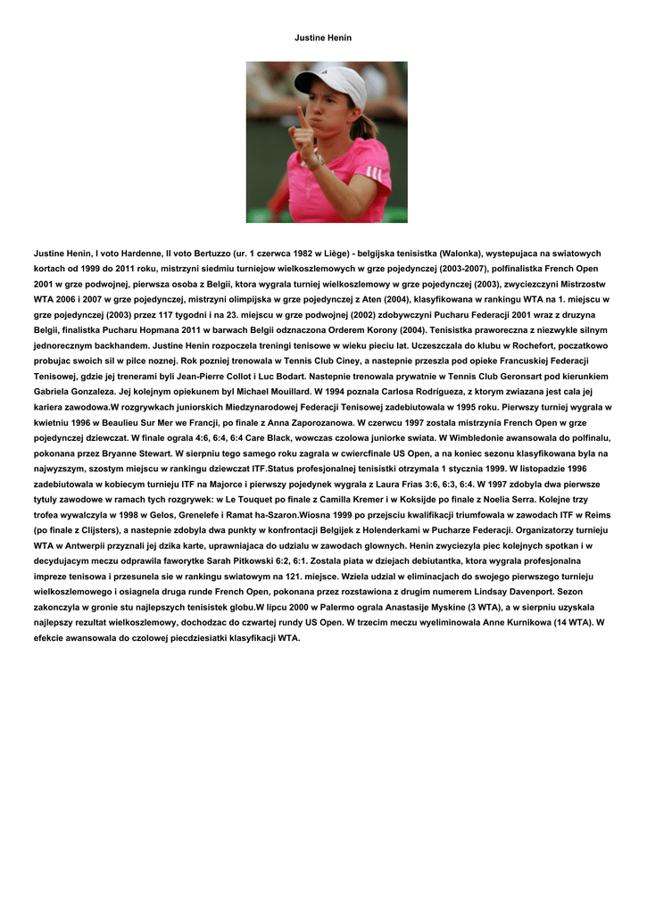 Justine Henin Justine Henin, I voto Hardenne, II voto Bertuzzo (ur. 1 czerwca 1982 w Liège) - belgijska tenisistka (Walonka), wystepujaca na swiatowych kortach od 1999 do 2011 roku, mistrzyni siedmiu turniejow wielkoszlemowych w grze pojedynczej (2003-2007), polfinalistka French Open 2001 w grze podwojnej, pierwsza osoba z Belgii, ktora wygrala turniej wielkoszlemowy w grze pojedynczej (2003), zwyciezczyni Mistrzostw WTA 2006 i 2007 w grze pojedynczej, mistrzyni olimpijska w grze pojedynczej z Aten (2004), klasyfikowana w rankingu WTA na 1. miejscu w grze pojedynczej (2003) przez 117 tygodni i na 23. miejscu w grze podwojnej (2002) zdobywczyni Pucharu Federacji 2001 wraz z druzyna Belgii, finalistka Pucharu Hopmana 2011 w barwach Belgii odznaczona Orderem Korony (2004). Tenisistka praworeczna z niezwykle silnym jednorecznym backhandem. Justine Henin rozpoczela treningi tenisowe w wieku pieciu lat. Uczeszczala do klubu w Rochefort, poczatkowo probujac swoich sil w pilce noznej. Rok pozniej trenowala w Tennis Club Ciney, a nastepnie przeszla pod opieke Francuskiej Federacji Tenisowej, gdzie jej trenerami byli Jean-Pierre Collot i Luc Bodart. Nastepnie trenowala prywatnie w Tennis Club Geronsart pod kierunkiem Gabriela Gonzaleza. Jej kolejnym opiekunem byl Michael Mouillard. W 1994 poznala Carlosa Rodrígueza, z ktorym zwiazana jest cala jej kariera zawodowa.W rozgrywkach juniorskich Miedzynarodowej Federacji Tenisowej zadebiutowala w 1995 roku. Pierwszy turniej wygrala w kwietniu 1996 w Beaulieu Sur Mer we Francji, po finale z Anna Zaporozanowa. W czerwcu 1997 zostala mistrzynia French Open w grze pojedynczej dziewczat. W finale ograla 4:6, 6:4, 6:4 Care Black, wowczas czolowa juniorke swiata. W Wimbledonie awansowala do polfinalu, pokonana przez Bryanne Stewart. W sierpniu tego samego roku zagrala w cwiercfinale US Open, a na koniec sezonu klasyfikowana byla na najwyzszym, szostym miejscu w rankingu dziewczat ITF.Status profesjonalnej tenisistki otrzymala 1 stycznia 1999. W listopadzie 1996 zadebiutowala w kobiecym turnieju ITF na Majorce i pierwszy pojedynek wygrala z Laura Frias 3:6, 6:3, 6:4. W 1997 zdobyla dwa pierwsze tytuly zawodowe w ramach tych rozgrywek: w Le Touquet po finale z Camilla Kremer i w Koksijde po finale z Noelia Serra. Kolejne trzy trofea wywalczyla w 1998 w Gelos, Grenelefe i Ramat ha-Szaron.Wiosna 1999 po przejsciu kwalifikacji triumfowala w zawodach ITF w Reims (po finale z Clijsters), a nastepnie zdobyla dwa punkty w konfrontacji Belgijek z Holenderkami w Pucharze Federacji. Organizatorzy turnieju WTA w Antwerpii przyznali jej dzika karte, uprawniajaca do udzialu w zawodach glownych. Henin zwyciezyla piec kolejnych spotkan i w decydujacym meczu odprawila faworytke Sarah Pitkowski 6:2, 6:1. Zostala piata w dziejach debiutantka, ktora wygrala profesjonalna impreze tenisowa i przesunela sie w rankingu swiatowym na 121. miejsce. Wziela udzial w eliminacjach do swojego pierwszego turnieju wielkoszlemowego i osiagnela druga runde French Open, pokonana przez rozstawiona z drugim numerem Lindsay Davenport. Sezon zakonczyla w gronie stu najlepszych tenisistek globu.W lipcu 2000 w Palermo ograla Anastasije Myskine (3 WTA), a w sierpniu uzyskala najlepszy rezultat wielkoszlemowy, dochodzac do czwartej rundy US Open. W trzecim meczu wyeliminowala Anne Kurnikowa (14 WTA). W efekcie awansowala do czolowej piecdziesiatki klasyfikacji WTA.