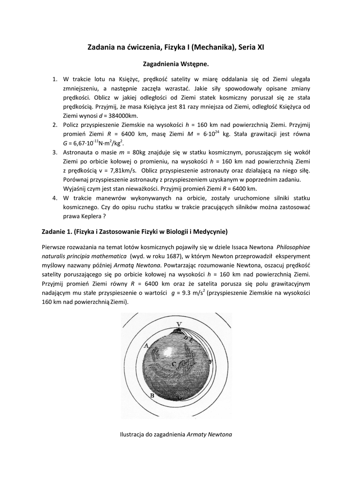 Zadania na ćwiczenia, Fizyka I (Mechanika), Seria XI Zagadnienia Wstępne. 1. W trakcie lotu na Księżyc, prędkość satelity w miarę oddalania się od Ziemi ulegała zmniejszeniu, a następnie zaczęła wzrastać. Jakie siły spowodowały opisane zmiany prędkości. Oblicz w jakiej odległości od Ziemi statek kosmiczny poruszał się ze stała prędkością. Przyjmij, że masa Księżyca jest 81 razy mniejsza od Ziemi, odległość Księżyca od Ziemi wynosi d = 384000km. 2. Policz przyspieszenie Ziemskie na wysokości h = 160 km nad powierzchnią Ziemi. Przyjmij promień Ziemi R = 6400 km, masę Ziemi M = 6·1024 kg. Stała grawitacji jest równa G = 6,67·10-11N·m2/kg2. 3. Astronauta o masie m = 80kg znajduje się w statku kosmicznym, poruszającym się wokół Ziemi po orbicie kołowej o promieniu, na wysokości h = 160 km nad powierzchnią Ziemi z prędkością v = 7,81km/s. Oblicz przyspieszenie astronauty oraz działającą na niego siłę. Porównaj przyspieszenie astronauty z przyspieszeniem uzyskanym w poprzednim zadaniu. Wyjaśnij czym jest stan nieważkości. Przyjmij promień Ziemi R = 6400 km. 4. W trakcie manewrów wykonywanych na orbicie, zostały uruchomione silniki statku kosmicznego. Czy do opisu ruchu statku w trakcie pracujących silników można zastosować prawa Keplera ? Zadanie 1. (Fizyka i Zastosowanie Fizyki w Biologii i Medycynie) Pierwsze rozważania na temat lotów kosmicznych pojawiły się w dziele Issaca Newtona Philosophiae naturalis principia mathematica (wyd. w roku 1687), w którym Newton przeprowadził eksperyment myślowy nazwany później Armatą Newtona. Powtarzając rozumowanie Newtona, oszacuj prędkość satelity poruszającego się po orbicie kołowej na wysokości h = 160 km nad powierzchnią Ziemi. Przyjmij promień Ziemi równy R = 6400 km oraz że satelita porusza się polu grawitacyjnym nadającym mu stałe przyspieszenie o wartości g = 9.3 m/s2 (przyspieszenie Ziemskie na wysokości 160 km nad powierzchnią Ziemi). Ilustracja do zagadnienia Armaty Newtona Zadanie 2. (Fizyka i Zastosowanie Fizyki w Biologii i Medycynie) A. Wyjaśnij pojęcie lot suborbitalny. B. Wyjaśnij pojęcie pierwszej prędkości kosmicznej i wyprowadź wzór na te prędkość. Oblicz pierwszą i drugą prędkość kosmiczną dla Ziemi oraz komety. C. Wyjaśnij pojęcie drugiej prędkość kosmicznej i wyprowadź wzór na te prędkość. Oblicz tę prędkość dla Ziemi oraz komety. D. Wyjaśnij pojęcie orbity geostacjonarnej i wyprowadź wzór na promień tej orbity. E. Oblicz prędkość satelity poruszającego się wokół Ziemi po orbicie kołowej na wysokości h = 160km. Masa Ziemi wynosi Mz = 6·1024kg, promień Ziemi Rz = 6400km, masa typowej komety wynosi Mk = 1015kg, zaś jej promień rk = 8km, okres obrotu Ziemi dookoła własnej osi wynosi 23h56m, stała grawitacji G=6,67·10-11m3/kg·s2. Zadanie 3. (Fizyka i Zastosowanie Fizyki w Biologii i Medycynie) Kometa porusza się wokół Słońca po orbicie eliptycznej, o dużej półosi a 10 razy większej od półosi orbity Ziemi, oblicz okres jej obiegu w latach. Zadanie 4. (Fizyka i Zastosowanie Fizyki w Biologii i Medycynie) 12 sierpnia 1877 roku został odkryty pierwszy księżyc Marsa – Deimos. Obserwacje wykazały, iż krąży on wokół macierzystej planety po orbicie eliptycznej o dużej półosi aD = 23500 km, zaś okres obiegu wynosi TD = 30 h. Kilka dni później odkryto drugi spośród księżyców Marsa – Fobosa, jednak w tym przypadku udało się wyznaczyć tylko okres jego obiegu dookoła Marsa, który wynosi TF = 7.6 h. Oblicz dużą półoś Fobosa oraz masę Marsa. Przyjmij, że stałą grawitacji G=6,67·10-11m3/kg·s2 . Zadanie 5. (Fizyka i Zastosowanie Fizyki w Biologii i Medycynie) Podczas przelotu satelity szpiegowskiego obserwowano go od zenitu do punktu wschodu na horyzoncie. Przyjmując, że satelita poruszał się po okręgu, na wysokości h = 1000 km oblicz jak długo trwał obserwowany przelot. Przyjmij, że promień Ziemi wynosi R0 = 6400km, zaś przyspieszenie ziemskie tuż przy powierzchni Ziemi wynosi g = 10m/s2. Zadanie 6. (tylko Zastosowanie Fizyki w Biologii i Medycynie) Ostatnio media donosiły o pomyślnie przeprowadzonych przez armię Stanów Zjednoczonych testach nowego rodzaju działa mogącego nadawać pociskom prędkość początkową V0 rzędu 2700 m/s (8 razy większą niż prędkość dźwięku). Działa nowego typu miałyby być wykorzystywane m.in. do zestrzeliwania pocisków wroga umieszonych na orbicie. Oblicz, jaką najmniejszą prędkość początkową należy nadać pociskowi, wystrzelonemu pod kątem α = 450 względem powierzchni Ziemi, aby doleciał on na wysokość orbity satelity krążącego na wysokości 200 km nad powierzchnią Ziemi. Masa Ziemi wynosi M= 6·1024kg, promień Ziemi R = 6400km, stała grawitacji G = 6,67·10-11N·m2/kg2. Zadanie 7. (Fizyka) Satelita, o okresie obiegu T, porusza się po orbicie eliptycznej o mimośrodzie e i dużej półosi a. Oblicz maksymalną wartość prędkości radialnej, tego satelity względem ogniska, w którym znajduje się ciało centralne. Zadanie 8. (Fizyka) Międzynarodowa Stacja Kosmiczna obiega Ziemię w przybliżeniu po orbicie kołowej o promieniu r2 = 6740 km. W kierunku stacji wysłano statek kosmiczny Progress z zaopatrzeniem. W pierwszej fazie lotu statek towarowy umieszczono na orbicie kołowej o promieniu r1 = 6580 km, którą obiega w czasie 88 minut. Jaką minimalną dodatkową prędkość należy nadać statkowi Progress, aby dotarł on do orbity stacji kosmicznej po orbicie Keplerowskiej. Ile czasu zabierze statkowi Progress osiągniecie orbity stacji kosmicznej.