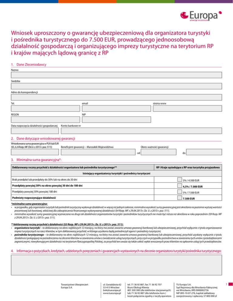 Wniosek uproszczony o gwarancję ubezpieczeniową dla organizatora turystyki i pośrednika turystycznego do 7.500 EUR, prowadzącego jednoosobową działalność gospodarczą i organizującego imprezy turystyczne na terytorium RP i krajów mających lądową granicę z RP 1. Dane Zleceniodawcy Nazwa Siedziba Adres do korespondencji Tel. email REGON NIP Data rozpoczęcia działalności gospodarczej strona www Konto bankowe nr 2. Dane dotyczące wnioskowanej gwarancji Wnioskowana suma gwarancyjna w PLN lub EUR (§5, 6, 8 Rozp. MF (Dz.U. z 2013 r. poz. 511)) Beneficjent gwarancji – Marszałek Województwa Okres ważności gwarancji od do 3. Minimalna suma gwarancyjna*: Deklarowany roczny przychód z działalności organizatora lub pośrednika turystycznego** RP i Kraje sąsiadujące z RP oraz turystyka przyjazdowa Istniejący organizatorzy turystyki i pośrednicy turystyczni Brak przedpłat lub przedpłaty do 30% lub na okres do 30 dni 3% / 4.500 EUR Przedpłaty powyżej 30% na okres powyżej 30 dni do 180 dni 4,5% / 7.000 EUR Przedpłaty powyżej 30% powyżej 180 dni 5% / 7.500 EUR Podmioty rozpoczynające działalność 7.500 EUR *minimalna suma gwarancyjna: •w przypadku, gdy organizator turystyki lub pośrednik turystyczny wykonuje działalność w więcej niż jednym zakresie, minimalna wysokość sumy gwarancyjnej jest określana na poziomie wyższej wartości procentowej lub kwotowej, właściwej dla zabezpieczenia finansowego wykonywanej działalności (§4 Rozp. MF z 29.04.2013 r. Dz. U. z 2013 r. poz. 511). •minimalna wysokość sumy gwarancyjnej wyznaczana na drugi rok działalności organizatorów turystyki i pośredników turystycznych nie może być niższa niż określona w roku poprzednim (§9 Rozp. MF z 29.04.2013 r. Dz. U. z 2013 r. poz. 511). **deklarowany roczny przychód z działalności (§3 Rozp. MF z 29.04.2013 r. Dz. U. z 2013 r. poz. 511): • organizatora turystyki – to deklarowany na okres najbliższych 12 miesięcy, na który ma zostać zawarta umowa gwarancji bankowej lub ubezpieczeniowej, przychód wyłącznie z tytułu organizowania imprez turystycznych na rzecz klientów, w tym deklarowany przychód, w którego uzyskaniu będą pośredniczyli agenci i pośrednicy turystyczni; • pośrednika turystycznego – to deklarowany na okres najbliższych 12 miesięcy, na który ma zostać zawarta umowa gwarancji bankowej lub ubezpieczeniowej, przychód uzyskany wyłącznie z tytułu działalności polegającej na pośredniczeniu na zlecenie klientów w zawieraniu umów o świadczenie usług turystycznych, przy czym w przypadku pośrednictwa w zawieraniu tych umów z przedsiębiorcami zagranicznymi, niewykonującymi działalności na terytorium Rzeczypospolitej Polskiej, za przychód ten uważa się także całość wpłat wnoszonych przez klientów na opłacenie usług tych przedsiębiorców. 4. Informacja o pożyczkach, kredytach, udzielonych poręczeniach i gwarancjach wystawionych na zlecenie organizatora turystyki/pośrednika turystycznego: Towarzystwo Ubezpieczeń Europa S.A. ul. Gwiaździsta 62 53-413 Wrocław [email protected] www.tueuropa.pl tel. 71 36 92 887, fax 71 36 92 707 Biuro Obsługi Klienta 801 500 300 (dla telefonów stacjonarnych) lub 71 36 92 887 (dla telefonów kom.) koszt połączenia zgodny z taryfą operatora TU Europa S.A. Sąd Rejonowy dla Wrocławia-Fabrycznej we Wrocławiu, KRS 0000002736 NIP 895-10-07-276, kapitał zakładowy zarejestrowany i opłacony 37 800 000 zł 1 5. Czy w okresie prowadzenia działalności cofnięto zezwolenie TAK NIE (prosimy podać podstawę cofnięcia) Czy takie postępowanie jest prowadzone w chwili obecnej TAK NIE 6. Czy do dnia złożenia niniejszego wniosku: a. dokonano wypłaty w tytułu odszkodowań w wysokości: TAK NIE b. zgłoszono roszczenia TAK na kwotę: NIE c. toczy się postępowanie w prokuraturze, sądzie, UOKiK lub innym organie administracji państwowej przeciw Zleceniodawcy w zakresie prowadzonej działalności NIE TAK (prosimy podać podstawy zarzutu) 7. Charakterystyka prowadzonej działalności/ oferty turystycznej: Czy właściciel/osoba zarządzająca pełniła w przeszłości podobne funkcje w innych podmiotach turystycznych (kiedy, na jakim stanowisku i w jakiej firmie): 8. Dotychczasowy ubezpieczyciel: Przypis składki ubezpieczeniowej w okresie ważności dotychczasowej gwarancji u dotychczasowego ubezpieczyciela: Pkt. 8 uzupełnia Zleceniodawca, który w poprzednim okresie nie miał gwarancji w TU Europa S.A. Wraz z Wnioskiem uproszczonym składamy załączniki zgodnie z poniższą listą. Jednocześnie mając świadomość konsekwencji wynikających z podania fałszywych informacji, oświadczamy, że wszystkie dane i informacje zawarte we Wniosku uproszczonym oraz załącznikach są prawdziwe i zgodne ze stanem faktycznym. Wyrażamy zgodę na przetwarzanie naszych danych do celów związanych z działalnością TU Europa S.A. Data Imiona i nazwiska, podpisy osób upoważnionych do składania oświadczeń w imieniu Zleceniodawcy, pieczęć Miejscowość Oświadczam, że posiadam zobowiązania/ nie posiadam zobowiązań* wobec Urzędu Skarbowego i Zakładu Ubezpieczeń Społecznych * zaznaczyć właściwe Wartość zobowiązań wobec US: Data wartość zobowiązań wobec ZUS: Imiona i nazwiska, podpisy osób upoważnionych do składania oświadczeń w imieniu Zleceniodawcy, pieczęć Miejscowość Załączniki: 1. Oświadczenie organizatora turystyki/ pośrednika turystycznego Do Wniosku uproszczonego należy załączyć dokumenty finansowe, potwierdzone przez Zleceniodawcę za zgodność z oryginałem: PIT-36 lub KPiR właścicieli za bieżący okres i ostatni rok kalendarzowy i – dla kontynuacji gwarancji PIT-36 lub KPiR właścicieli za bieżący okres oraz za okres ostatnich 2 lat – dla podmiotów składających wniosek po raz pierwszy Zaświadczenie o wpisie do Rejestru Organizatorów i Pośredników Turystycznych (nie dotyczy nowych organizatorów turystyki i/lub poś