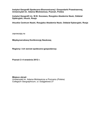 Instytut Geografii Społeczno-Ekonomicznej i Gospodarki Przestrzennej, Uniwersytet im. Adama Mickiewicza, Poznań, Polska Instytut Geografii im. W.B. Soczawa, Rosyjska Akademia Nauk, Oddział Syberyjski, Irkuck, Rosja Irkuckie Centrum Nauki, Rosyjska Akademia Nauk, Oddział Syberyjski, Rosja zapraszają na Międzynarodową Konferencję Naukową Regiony i ich wzrost społeczno-gospodarczy Poznań 2–4 września 2012 r. Miejsce obrad: Uniwersytet im. Adama Mickiewicza w Poznaniu (Polska) Collegium Geographicum, ul. Dzięgielowa 27 Komitet Naukowy: Prof. Aleksandr Ivanovich ALEKSEEV (Uniwersytet im. Łomonosowa, Moskwa, Rosja); Prof. Peter Yakovlevich BAKLANOV (Rosyjska Akademia Nauk, Władywostok, Rosja); Prof. Teresa CZYŻ (Uniwersytet im. A. Mickiewicza, Poznań, Polska); Prof. Aleksandr Georgievich DRUZHININ (Południowy Uniwersytet Federalny, Rostów nad Donem, Rosja); Prof. Andrzej LISOWSKI (Uniwersytet Warszawski, Polska); Prof. Tadeusz PALMOWSKI (Uniwersytet Gdański, Polska); Prof. Aleksandr Nikolaevich PILYASOV (Centrum Nauk Ekonomicznych nad Terenami Północnymi i Arktycznymi, Rada Badań nad Zasobami Produkcyjnymi Ministerstwa Rozwoju Gospodarczego Rosji i Rosyjskiej Akademii Nauk, Moskwa, Rosja) Prof. Viktor Maksimovich PLYUSNIN (Instytut Geografii im. W.B. Soczawa, Rosyjska Akademia Nauk, Oddział Syberyjski, Irkuck, Rosja); Prof. Waldemar RATAJCZAK (Uniwersytet im. A. Mickiewicza, Poznan, Polska); Prof. Oleg Ivanovich SHABLYI (Uniwersytet im. I. Franki, Lwów, Ukraina); Prof. Natalia Mikhailovna SYSOYEVA (Irkuckie Centrum Nauki, Rosyjska Akademia Nauk, Oddział Syberyjski, Rosja, Instytut Geografii im. W.B. Soczawa, Rosyjska Akademia Nauk, Oddział Syberyjski, Irkuck, Rosja). Komitet Organizacyjny: dr Cezary MĄDRY (Uniwersytet im. A. Mickiewicza, Poznan, Polska); dr Justyna WELTROWSKA-JĘCH (Uniwersytet im. A. Mickiewicza, Poznan, Polska); mgr Аleksandr ABAEV (Rosyjska Akademia Nauk, Oddział Syberyjski, Irkuck, Rosja); mgr Igor DETS (Rosyjska Akademia Nauk, Oddział Syberyjski, Irkuck, Rosja). Ważne terminy: Do 15 czerwca 2012 – zgłoszenie udziału w konferencji; Do 15 czerwca 2012 – termin wpłaty obniżonej opłaty konferencyjnej (170 Euro lub 730 zł); Do 15 lipca 2012 – przesłanie artykułu do publikacji; Do 15 sierpnia 2012 – ostateczny termin wniesienia opłaty konferencyjnej ( 200 Euro lub 860 zł); 2 września 2012 – początek konferencji (wycieczka); 3 i 4 września 2012 – obrady. Problemy wzrostu oraz rozwoju regionów są we współczesnych naukach ekonomicznospołecznych i geograficznych traktowane jako priorytetowe. Wynika to z pogłębiających się nierówności występujących pomiędzy jednostkami zlokalizowanymi tak w różnych częściach świata jak i wewnątrz poszczególnych państw. Dlatego poszukuje się teorii i modeli, które w precyzyjny sposób opiszą tak endogeniczne jak i egzogeniczne czynniki wzrostu oraz rozwoju różnych regionów. Istnieje w tym zakresie spory dorobek, lecz nie ma jak dotąd teorii, która ustaliłaby występujące związki pomiędzy czynnikami wzrostu i rozwoju bez nadmiernych założeń upraszczających. Z teoretycznego i empirycznego punktu widzenia szczególnie interesujące są problemy wzrostu i rozwoju regionów wcześniej należących do jednego systemu społeczno-gospodarczego, a które w konsekwencji zmian końca XX w., obecnie znajdują się w różnych organizacjach społecznogospodarczo-politycznych, np. regionów Rosji i Polski. W tym kontekście rośnie znaczenie analiz porównawczych roli innowacji oraz zarządzania procesami rozwoju społecznego w regionach. Dlatego Instytut Geografii Społeczno-Ekonomicznej i Gospodarki Przestrzennej UAM, Instytut Geografii im. W.B. Soczawa Rosyjskiej Akademii Nauk, Oddział Syberyjski w Irkucku oraz Irkuckie Centrum Nauki Rosyjskiej Akademii Nauk, Oddział Syberyjski postanowiły w dniach 2–4 września 2012 roku zorganizować w Poznaniu Konferencję naukowo-gospodarczą pt. Regiony i ich wzrost społecznoekonomiczny. Główne tematy konferencji to: (1) Metodologiczne aspekty wzrostu i rozwoju regionów; (2) Współczesne endogeniczne oraz egzogeniczne czynniki rozwoju regionów; (3) Innowacje oraz ich rozprzestrzenianie jako czynnik decydujący o pozycji konkurencyjnej regionów; (4) Zarządzanie przestrzenne a przyszłość regionów; (5) Integracja i dezintegracja w wymiarze regionalnym. Warunki uczestnictwa Konferencja skierowana jest zarówno do środowiska naukowego jak i do przedstawicieli samorządów terytorialnych zajmujących się planowaniem i zarządzaniem regionalnym. Organizatorzy przewidują możliwość uczestnictwa w konferencji: 1. z prezentacją referatu; 2. z prezentacją posteru; 3. bez prezentacji referatu lub posteru ale z publikacją. Warunkiem uczestnictwa w konferencji jest terminowe zgłoszenie rejestracyjne oraz wniesienie opłaty konferencyjnej. Języki konferencji Angielski i rosyjski. Program ramowy 2 września – wycieczka po Poznaniu; 3 września – obrady, bankiet wieczorny; 4 września – obrady, wycieczka. Zgłoszenie Kartę zgłoszeniową należy wypełnić i przesłać faksem do dnia 15 czerwca 2012 r. na numer +48-61829-61-27 lub drogą elektroniczną na adres: [email protected] (w języku angielskim lub rosyjskim) lub [email protected] (w języku angielskim). Po tym okresie do uczestników zostanie przesłany komunikat nr 2. Publikacja Nadesłane artykuły, po uzyskaniu pozytywnych recenzji, zostaną opublikowane w wydawnictwie monograficznym. Publikacja zostanie przygotowana na konferencję i przekazana jej uczestnikom. Istnieje możliwość publikacji artykułu bez uczestnictwa w konferencji. Do publikacji przyjmowane będą tylko artykuły w języku angielskim. Termin nadsyłania artykułów mija 15 lipca 2012 r. W przypadku znaczących opóźnień organizatorzy rezerwują sobie prawo publikacji po konferencji. Opłaty Opłata konferencyjna obejmuje: - udział w sesjach wykładowych oraz panelach dyskusyjn