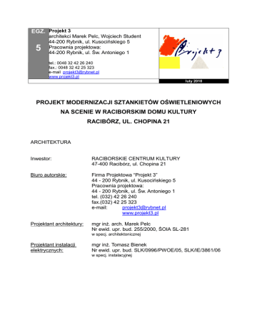 EGZ. Projekt 3 5 architekci Marek Pelc, Wojciech Student 44-200 Rybnik, ul. Kusocińskiego 5 Pracownia projektowa: 44-200 Rybnik, ul. Św. Antoniego 1 tel.: 0048 32 42 26 240 fax.: 0048 32 42 25 323 e-mail [email protected] www.projekt3.pl luty 2010 PROJEKT MODERNIZACJI SZTANKIETÓW OŚWIETLENIOWYCH NA SCENIE W RACIBORSKIM DOMU KULTURY RACIBÓRZ, UL. CHOPINA 21 ARCHITEKTURA Inwestor: RACIBORSKIE CENTRUM KULTURY 47-400 Racibórz, ul. Chopina 21 Biuro autorskie: Firma Projektowa “Projekt 3” 44 - 200 Rybnik, ul. Kusocińskiego 5 Pracownia projektowa: 44 - 200 Rybnik, ul. Św. Antoniego 1 tel. (032) 42 26 240 fax.(032) 42 25 323 e-mail: [email protected] www.projekt3.pl Projektant architektury: mgr inŜ. arch. Marek Pelc Nr ewid. upr. bud. 255/2000, ŚOIA SL-281 w specj. architektonicznej Projektant instalacji elektrycznych: mgr inŜ. Tomasz Bienek Nr ewid. upr. bud. SLK/0996/PWOE/05, SLK/IE/3861/06 w specj. instalacyjnej SPIS TREŚCI: I. SPIS RYSUNKÓW .................................................................................................. 2 II. OPIS TECHNICZNY DO PROJEKTU MODERNIZACJI SZTANKIETÓW OŚWIETLENIOWYCH NA SCENIE W RACIBORSKIM DOMU KULTURY................ 3 1. Dane ogólne .................................................................................................... 3 2. Przedmiot i zakres opracowania ...................................................................... 3 3. Lokalizacja. ...................................................................................................... 3 4. Opis w zakresie rozwiązań budowlanych......................................................... 3 5. Opis w zakresie rozwiązań instalacji elektrycznych. ........................................ 4 III. INFORMACJA DOTYCZĄCA BEZPIECZEŃSTWA I OCHRONY ZDROWIA ....... 6 1. Podstawa opracowania ....................................................................................... 6 2. Zakres robót dla zamierzenia budowlanego ........................................................ 6 3. Wykaz istniejących obiektów budowlanych ......................................................... 6 4. Elementy zagospodarowania działki lub terenu, które mogą stwarzać zagroŜenie bezpieczeństwa i zdrowia ludzi................................................................................... 6 5. Przewidywane zagroŜenia................................................................................... 6 6. ZagroŜenia występujące przy wykonywaniu robót na wysokości ........................ 6 7. ZagroŜenia występujące przy wykonywaniu robót na budowlanych przy uŜyciu maszyn i urządzeń technicznych ................................................................................ 7 8. Sposoby prowadzenia instruktaŜu pracowników przed przystąpieniem do realizacji robót szczególnie niebezpiecznych ............................................................. 7 9. Informacja o wydzieleniu i oznakowaniu terenu .................................................. 8 10. Środki techniczne oraz organizacyjne zapobiegające niebezpieczeństwom i zagroŜeniom zdrowia ................................................................................................ 8 11. Podstawa prawna opracowania ..................................................................... 10 IV. SPIS ZAŁĄCZNIKÓW ......................................................................................... 12 V. OŚWIADCZENIE PROJEKTANTÓW................................................................... 13 I. SPIS RYSUNKÓW Nr rys. 1 2 Nazwa rysunku Rzut parteru – scena – lokalizacja sztankietów pod oświetlenie sceny Przekrój – scena – lokalizacja sztankietów pod oświetlenie sceny skala 1:100 1:100 2 II. OPIS TECHNICZNY DO PROJEKTU MODERNIZACJI SZTANKIETÓW OŚWIETLENIOWYCH NA SCENIE W RACIBORSKIM DOMU KULTURY 1. Dane ogólne Niniejsze opracowanie zostało sporządzone według Rozporządzenia Ministra Infrastruktury z dnia 3 lipca 2003 roku (Dz. U. z dnia 10 lipca 2003 r.) w sprawie szczegółowego zakresu i formy projektu budowlanego wraz z późniejszymi zmianami. Inwestor: Raciborskie Centrum Kultury 47-400 Racibórz Ul. Chopina 21 Nazwa jednostki projektowej: PROJEKT 3 , architekci Marek PELC, Wojciech STUDENT ul. Kusocińskiego 5, 44-200 Rybnik Podstawy formalne opracowania: Umowa z Inwestorem 2. Przedmiot i zakres opracowania Przedmiotem opracowania jest modernizacja istniejących sztankietów oświetleniowych będących na wyposaŜeniu Domu Kultury w Raciborzu. Zakres opracowania obejmuje wymianę istniejących sztankietów na nowe wraz z konstrukcją zawiesia. 3. Lokalizacja. Budynek Domu Kultury, w którym zostaną zmodernizowane sztankiety, zlokalizowany jest w Raciborzu przy ul. Chopina 21. 4. Opis w zakresie rozwiązań budowlanych. W chwili obecnej istniejące sztankiety oświetleniowe, które znajdują się nad sceną w Domu Kultury wykonane są w formie kratownic zawieszonych na linach stalowych. Podwieszenie montowane jest na istniejącej konstrukcji stalowej. Podnoszenie i opuszczanie sztankietów odbywa się ręcznie. Elementy istniejącego sztankietu uŜywane przez kilku lat, podlegają zuŜyciu i starzeniu (szczególnie liny nośne), co moŜe prowadzić do katastrofy. W związku z tym liny naleŜy wymieniać a koła przewojowe i nośne poddawać konserwacji. Projekt przewiduję wymianę konstrukcji do zawieszania oświetlenia. Konstrukcja taka jest zbyt masywna i cięŜka dla podnoszenia ręcznego, dlatego naleŜy zastosować podnoszenie przy pomocy napędu elektrycznego. Ułatwi to znacznie pracę obsługi technicznej. Przy zamawianiu elementów sztankietów naleŜy zwrócić uwagę by parametry urządzeń (m.in. rozstawy lin) pozwalały wykorzystać istniejącą konstrukcję nośną. Modernizacja istniejących sztankietów polegać będzie na: a) wymianie lin stalowych na nowe, b) wymianie zacisków i kauszy, c) wymianie śrub rzymskich, d) przesmarowaniu kół przewo
