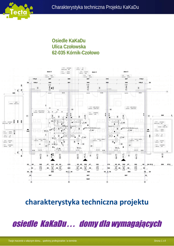 Charakterystyka techniczna Projektu KaKaDu Osiedle KaKaDu Ulica Czołowska 62-035 Kórnik-Czołowo charakterystyka techniczna projektu osiedle KaKaDu . . . domy dla wymagających Twoje marzenie o własnym domu... spełnimy profesjonalnie i w terminie. Strona 1 z 8 Charakterystyka techniczna Projektu KaKaDu Szanowni Państwo, u podstaw prac przy projektowaniu osiedla KaKaDu leżała chęć zaoferowania naszym Klientom czegoś wyjątkowego i niespotykanego. Naszym celem było spełnienie Państwa oczekiwań odnośnie jakości oferowanych przez nas produktów i usług. Nasze dotychczasowe doświadczenie zdobyte na niemieckim rynku budowlanym spowodowało, że postanowiliśmy przenieść zachodnie standardy na rynek polski. W efekcie udało nam się uzyskać doskonałe osiedle, w którym z chęcią sami chcielibyśmy zamieszkać. Niniejsza charakterystyka techniczna ma w założeniu pokazać Państwu, jak ważne jest dla nas zadowolenie naszych Klientów oraz zaprezentować wysoką jakość domów będących przedmiotem tego opracowania. Życzymy udanej lektury Mgr. Inż. Łukasz Szymański Prezes Zarządu Tecta Development Sp. z o. o. Twoje marzenie o własnym domu... spełnimy profesjonalnie i w terminie. Strona 2 z 8 Charakterystyka techniczna Projektu KaKaDu Charakterystyka techniczna budynków - wersja Standard 1. Konstrukcja budynku Posadowienie: Żelbetowa płyta fundamentowa ocieplona od strony gruntu. Współczynnik przenikania ciepła przegrody U= 0,16 W/m²K. (wymagane: U=0,45 W/m²K) Ściany nośne: Murowane z bloków wapienno-piaskowych (np. Silka) w technologii muru klejonego na zaprawę cienkowarstwową. Materiał ten dzięki dużej pojemności cieplnej jest pasywnym źródłem ciepła (akumuluje zyski ciepła). Strop: 2. Lekkie płyty strunobetonowe. Dach Konstrukcja: Prefabrykowane dźwigary drewniane. Ocieplenie: Wełna mineralna, układana między krokwiami (ca. 200 mm) plus płyty nakrokwiowe o bardzo dobrych właściwościach izolacyjnych. Współczynnik przenikania ciepła przegrody U= 0,12 W/m²K. (wymagane: U=0,25 W/m²K) Pokrycie: Płyty warstwowe z rdzeniem z materiału termoizolacyjnego, pokryte blachą cynkową. 3. Fasada Ocieplenie: Fasada ocieplona styropianem grubości 200 mm (=0,35). Współczynnik przenikania ciepła przegrody U= 0,15 W/m²K. (wymagane: U=0,30 W/m²K) Tynki zewnętrzne: Warstwa ocieplenia pokryta organicznym tynkiem zewnętrznym oraz podwójną warstwą farby fasadowej. Drzwi wejściowe: Przeciwwłamaniowe drzwi stalowe pełne. Współczynnik przenikania ciepła U=1,30 W/m²K. (wymagane: U=2,60 W/m²K) Okna: Wielokomorowe okna tworzywowe, potrójnie przeszklone o współczynniku przenikania ciepła U=1,00 W/m²K. (wymagane: U=1,80 W/m²K) Rolety: Wszystkie okna wyposażone zostaną w tworzywowe rolety zewnętrzne oraz ocieplone skrzynki rolet. Parapety: Zewnętrzne parapety aluminiowe. Twoje marzenie o własnym domu... spełnimy profesjonalnie i w terminie. Strona 3 z 8 Charakterystyka techniczna Projektu KaKaDu 4. Ściany działowe Z bloków wapienno-piaskowych (np. Silka) klejonych na zaprawie cienkowarstwowej. Jest to najbardziej zdrowy i przyjazny dla człowieka materiał. Częściowo również w technologii suchej zabudowy z płyt kartonowo-gipsowych z dodatkową izolacja akustyczną z wełny mineralnej. Konstrukcja obłożona obustronnie podwójnymi płytami GK. 5. Posadzki Jastrych: Wszystkie posadzki jako wylewki cementowe w technologi pływającego jastrychu na podkładzie z izolacji akustycznej i termicznej. Ogrzewanie: Ogrzewanie budynków realizowane poprzez niskotemperaturowe ogrzewanie podłogowe lub opcjonalnie (na życzenie klienta) niskotemperaturowe ogrzewanie grzejnikowe. W łazienkach przewidziano dodatkowo grzejniki drabinkowe sprawdzające się przede wszystkim w okresie przejściowym. 6. Schody Konstrukcja: Żebra nośne z ocynkowanych profili stalowych lub w konstrukcji żelbetowej Stopnie: Drewniane o grubości około 30 mm. Podstopnie z laminowanej płyty wiórowej. Poręcz: 7. Metalowa, na ścianie zewnętrznej. Kominek Instalacja dymowa: Pokój dzienny na przyziemiu wyposażony w komin dymowy przygotowany do instalacji kominka oraz kanał doprowadzający powietrze pod palenisko. Kominek: Kominek z zamkniętą komorą spalania jako wspomaganie ogrzewania. Wkład kominowy o wymiarach ca. 50x60x60 cm. 8. Materiały wykończeniowe Tynki wewnętrzne: Szpachla lub tynk gipsowy, narożniki wzmocnione. Parapety wewnętrzne: Z białego tworzywa sztucznego. Twoje marzenie o własnym domu... spełnimy profesjonalnie i w terminie. Strona 4 z 8 Charakterystyka techniczna Projektu KaKaDu 9. Przyłącza mediów i urządzenia techniczne Podłączenie mediów: Wszystkie domy posiadają niezależne podłączenie do publicznej sieci elektrycznej i wodociągowej. Przyłącza mediów przewidziane są w oddzielnym pomieszczeniu technicznym. Odprowadzenie ścieków zaplanowane jest do szamba znajdującego się w granicy działki. Źródło ciepła: Dwufunkcyjny wiszący kocioł gazowy o mocy około 10 kW. Opcjonalnie za dopłatą pompa ciepła powietrze/woda (COP≥ 3,5). Ogrzewanie: Do wyboru: Podłogowe lub grzejnikowe we wszystkich pomieszczeniach. Dodatkowo w łazience przewidziano grzejnik drabinkowy. Instalacje sanitarne: Woda użytkowa doprowadzona do zaplanowanych urządzeń sanitarnych i gosp. domowego w kuchni, łazience i toalecie, dodatkowe ujęcie wody w kotłowni. Wentylacja: Mechaniczna z odzyskiem ciepła, o sprawności ponad 85%. Centrala umieszczona na strychu, kanały rozprowadzone do wszystkich pomieszczeń zgodnie z projektem wentylacji. Sieć elektryczna: W każdym pomieszczeniu mieszkalnym wypust oświetlenia górnego wewnętrznego oraz 4 gniazda jednofazowe 230V. Oświetlenie klatki schodowej schodowym. Piekarnik i kuchnia sterowane włącznikiem elektryczna zasilane z oddzielnych obwodów. Sieć telekomunikacyjna: Po jednym gnieździe telekomunikacyjnym (RJ11/RJ12) w pokoju dziennym na parterze oraz w korytarzu n