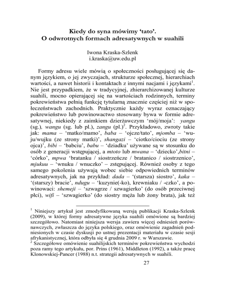 Kiedy do syna mówimy ‘tato’. O odwrotnych formach adresatywnych w suahili Iwona Kraska-Szlenk [email protected] Formy adresu wiele mówią o społeczności posługującej się danym językiem, o jej zwyczajach, strukturze społecznej, hierarchiach wartości, a nawet historii i kontaktach z innymi nacjami i językami1. Nie jest przypadkiem, że w tradycyjnej, zhierarchizowanej kulturze suahili, mocno opierającej się na wartościach rodzinnych, terminy pokrewieństwa pełnią funkcję tytularną znacznie częściej niż w społeczeństwach zachodnich. Praktycznie każdy wyraz oznaczający pokrewieństwo lub powinowactwo stosowany bywa w formie adresatywnej, niekiedy z zaimkiem dzierżawczym ‘mój/moja’: yangu (sg.), wangu (sg. lub pl.), zangu (pl.)2. Przykładowo, zwroty takie jak: mama – ‘matko/mamo’, baba – ‘ojcze/tato’, mjomba – ‘wuju/wujku (ze strony matki)’, shangazi – ‘ciotko/ciociu (ze strony ojca)’, bibi – ‘babciu’, babu – ‘dziadku’ używane są w stosunku do osób z generacji wstępującej, a mtoto lub mwana – ‘dziecko’,bitni – ‘córko’, mpwa ‘bratanku / siostrzeńcze / bratanico / siostrzenico’, mjukuu – ‘wnuku / wnuczko’ – zstępującej. Również osoby z tego samego pokolenia używają wobec siebie odpowiednich terminów adresatywnych, jak na przykład: dada – ‘(starsza) siostro’, kaka – ‘(starszy) bracie’, ndugu – ‘kuzynie(-ko), krewniaku / -czko’, a powinowaci: shemeji – ‘szwagrze / szwagierko’ (do osób przeciwnej płci), wifi – ‘szwagierko’ (do siostry męża lub żony brata), jak też 1 Niniejszy artykuł jest zmodyfikowaną wersją publikacji Kraska-Szlenk (2009), w której formy adresatywne języka suahili omówione są bardziej szczegółowo. Natomiast niniejsza wersja zawiera więcej odniesień porównawczych, zwłaszcza do języka polskiego, oraz omówienie zagadnień podniesionych w czasie dyskusji po ustnej prezentacji materiału w czasie sesji afrykanistycznej, która odbyła się 4 grudnia 2009 r. w Warszawie. 2 Szczegółowe omówienie suahilijskich terminów pokrewieństwa wychodzi poza ramy tego artykułu, por. Prins (1961), Middleton (1992), a także pracę Klonowskiej-Pancer (1988) n.t. strategii adresatywnych w suahili. 27 mke wangu – ‘moja żono’, mume wangu – ‘mój mężu’, mkwe wangu – ‘mój teściu / teściowo / zięciu / synowo’, które na ogół występują z zaimkami dzierżawczymi. Taki sposób zwracania się do krewnych i powinowatych należy w kulturze suahili do dobrego tonu; w niektórych sytuacjach może też służyć jako strategia manipulacyjna zorientowana na osiągnięcie określonej korzyści (por. Podobińska 2001, 2004). W suahili typowe jest również używanie terminów pokrewieństwa w tzw. funkcji fikcyjnej, a więc w stosunku do osób niepowiązanych rzeczywistą relacją pokrewieństwa, a będących w wieku matki/ojca, siostry/brata, babci/dziadka rozmówcy, itp. Zwracanie się do obcej osoby stosownym do jej wieku terminem pokrewieństwa świadczy o uprzejmości i pewnej serdeczności i często służy do wyrażania pozytywnych uczuć (sympatii, współczucia itp.), ale, podobnie jak w przypadku rzeczywistego pokrewieństwa, może być zachowaniem manipulacyjnym (por. Podobińska 2001, 2004, KraskaSzlenk 2009). „Fikcyjne” użycie niektórych terminów pokrewieństwa stało się na tyle częste, że stanowi wręcz normę, a więc nienacechowaną formę adresu, jak w przypadku wyrazów kaka – dosł. ‘(starszy) brat’ czy dada – ‘(starsza) siostra’ stosowanych między niespokrewnionymi, a nawet obcymi osobami w podobnym wieku, oraz mama – dosł. ‘matka’ będącego odpowiednikiem ‘pani’ w języku polskim i używanym w stosunku do dorosłej kobiety. Niniejszy artykuł poświęcony jest innemu, niż wyżej wymienione, użyciu terminów pokrewieństwa, a mianowicie jako tzw. odwrotnego czy odwróconego adresu3. Jak ilustruje to przykład tytułowy, jest to szczególny sposób zwracania się do rozmówcy za pomocą formy, która jest niejako odwrotna do tytułu, który byłby mu przynależny z racji rzeczywistej relacji, jaka łączy rozmówców. A więc kiedy ojciec mówi do syna ‘synu’, jest to zwykła tytulatura, która 3 Polski termin odwrotne (odwrócone) formy adresatywne wprowadziłam jako odpowiednik terminów funkcjonujących w innych językach: wł. allocuzione inversa, niem. umgekehrte Anrede, ang. address inversion (por. Braun 1988:12), choć zjawisko to opisywane bywa też pod innymi nazwami, np. w języku angielskim jako reverse role vocatives (Rieschild 1998) czy bi-polar terms of address (Ayoub 1964, Yassin 1977). 28 odzwierciedla faktyczne pokrewieństwo między ojcem a synem, ale kiedy ojciec zwraca się do syna, używając słowa, które w dosłownym sensie znaczy ‘ojcze’ czy ‘tato’, mamy do czynienia z formą odwrotną czy odwróconą, gdyż jest to słowo, którego zwykle syn używa w stosunku do ojca, a nie ojciec do syna. Podobnie dziadek może w pewnych okolicznościach zwrócić się do wnuka ‘dziadku’, wujek może powiedzieć do siostrzeńca ‘wujku’ itd. Jak wskazują przytoczone wyżej przykłady, odwrócone formy adresu dotyczą najczęściej tytulatury rodzinnej i tak jest we wszystkich językach, w których odnotowano to zjawisko (por. Braun 1988). Niekiedy można tę nomenklaturę nieco rozszerzyć: np. dyrektor może powiedzieć do podwładnego ‘dyrektorze’, ale zdarza się to sporadyczne i zasadniczo zjawisko to pozostaje w domenie relacji pokrewieństwa i powinowactwa. Badania porównawcze różnych języków pokazują, że można wyróżnić dwa główne typy funkcjonowania odwrotnego adresu (Braun 1988). W wariancie pierwszym, który obserwujemy m.in. w języku arabskim (m.in. Ayoub 1964, Yassin 1977, Braun 1988, Rieschild 1998), odwróceniu podlega sam termin określający relację pokrewieństwa. Zatem ojciec powie ‘tato’ do syna, a