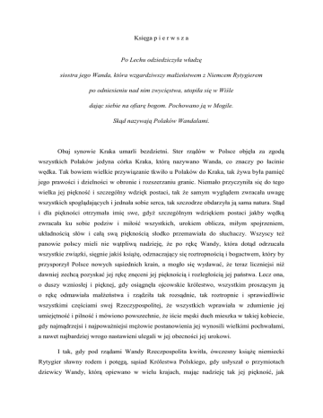 Księga p i e r w s z a Po Lechu odziedziczyła władzę siostra jego Wanda, która wzgardziwszy małżeństwem z Niemcem Rytygierem po odniesieniu nad nim zwycięstwa, utopiła się w Wiśle dając siebie na ofiarę bogom. Pochowano ją w Mogile. Skąd nazywają Polaków Wandalami. Obaj synowie Kraka umarli bezdzietni. Ster rządów w Polsce objęła za zgodą wszystkich Polaków jedyna córka Kraka, którą nazywano Wanda, co znaczy po łacinie wędka. Tak bowiem wielkie przywiązanie tkwiło u Polaków do Kraka, tak żywa była pamięć jego prawości i dzielności w obronie i rozszerzaniu granic. Niemało przyczyniła się do tego wielka jej piękność i szczególny wdzięk postaci, tak że samym wyglądem zwracała uwagę wszystkich spoglądających i jednała sobie serca, tak szczodrze obdarzyła ją sama natura. Stąd i dla piękności otrzymała imię swe, gdyż szczególnym wdziękiem postaci jakby wędką zwracała ku sobie podziw i miłość wszystkich, urokiem oblicza, miłym spojrzeniem, układnością słów i całą swą pięknością słodko przemawiała do słuchaczy. Wszyscy też panowie polscy mieli nie wątpliwą nadzieję, że po rękę Wandy, która dotąd odrzucała wszystkie związki, sięgnie jakiś książę, odznaczający się roztropnością i bogactwem, który by przysporzył Polsce nowych sąsiednich krain, a mogło się wydawać, że teraz liczniejsi niż dawniej zechcą pozyskać jej rękę znęceni jej pięknością i rozległością jej państwa. Lecz ona, o duszy wzniosłej i pięknej, gdy osiągnęła ojcowskie królestwo, wszystkim proszącym ją o rękę odmawiała małżeństwa i rządziła tak rozsądnie, tak roztropnie i sprawiedliwie wszystkimi częściami swej Rzeczypospolitej, że wszystkich wprawiała w zdumienie jej umiejętność i pilność i mówiono powszechnie, że iście męski duch mieszka w takiej kobiecie, gdy najmądrzejsi i najpoważniejsi mężowie postanowienia jej wynosili wielkimi pochwałami, a nawet najbardziej wrogo nastawieni ulegali w jej obecności jej urokowi. I tak, gdy pod rządami Wandy Rzeczpospolita kwitła, ówczesny książę niemiecki Rytygier sławny rodem i potęgą, sąsiad Królestwa Polskiego, gdy usłyszał o przymiotach dziewicy Wandy, którą opiewano w wielu krajach, mając nadzieję tak jej piękność, jak i Królestwo Polskie posiąść, wysłał posłów z prośbą o rękę Wandy pod groźbą wojny. Lecz Wanda, która całe życie ślubowała spędzić w czystości, niczyimi prośbami ni poselstwami nie dała się pozyskać i z niczym odesłała posłów. Książę niemiecki Rytygier widząc, że nie może jej skłonić ani prośbami, ani podarkami do małżeńskich związków, w poczuciu wzgardy i odmowy zebrał ogromne wojsko i wkroczył do Polski, chcąc wywalczyć orężem to, czego nie mógł uzyskać prośbą. Nie zatrwożyła się jednak królowa Polski, Wanda, chrzęstu oręża, lecz szybko rozkazała zgromadzić się wojskom polskim, stanęła przeciwko Niemcom wydając pole do bitwy. Zachwiało się nieco męstwo Rytygiera i pragnął powtórnie użyć wpierw próśb niż oręża. Wysłał zatem kilku ze starszyzny swej do dziewicy Wandy, która czekała w gotowości do boju - prosi o jej rękę, wylicza swe bogactwa, ukazuje potęgę, dorzuca groźby, nie tracąc otuchy, że potrafi jakoś pozyskać serce kobiety prośbami lub też złamać groźbą. "Przyszliśmy - mówią - do ciebie, królowo Wando, jako posłowie w imieniu naszego księcia Rytygiera i prosimy cię o zgodę na małżeństwo z nim, będziesz miała męża młodego, słynnego i potężnego, który złoży ci naj wspanialsze upominki, jeśli nie odmówisz mu ręki, a w przeciwnym razie skłoni cię do tego orężem". Ona zaś, zaiste kobieta serca stałego i mężnego, tak odpowiedziała posłom: "Czyż do tego stopnia wydaję się waszemu księciu kobietą niską i niegodną małżeństwa, że śmie żądać, abym królestwa mego sławą i potęgą wzgardziła i zapomniała o krzywdach, które królestwu memu wyrządził i teraz czyni najeżdżając je, a zechciała poddać się jemu wraz z mym królestwem i ubliżyła jego godności? Odpowiedzcie waszemu księciu, że nienawistne jest mi jego i jakiekolwiek inne małżeństwo i że bardziej mi przystoi zwać się panią niż małżonką panującego. Wojnę mi wypowiedział, niechże wojnę gotuje, lecz jakże to sromotne dla księcia i męża porzuciwszy Marsa i Wenerę wchodzić w układy i poniechawszy oręża rozprawiać o małżeństwie". Gdy dała taką odpowiedź, rozkazała trąbić do boju i wojskom swoim stawać w szyku, by zwycięskim orężem upokorzyć wrogie i dumne poselstwo. Skoro jednak co znaczniejsi rycerze niemieccy uważnie się przyjrzeli obliczu królowej polskiej Wandy, chcąc się przekonać czy zgodne są z prawdą pogłoski o jej szczególnej piękności, nagle serca wszystkich, tak tych, którzy ją widzieli, jak wszystkich innych, którzy od opowiadających tylko słyszeli o niej, zmiękły i jakby roztopiły się, po czym jednomyślnie i głośno oświadczyli się przeciwko dalszemu prowadzeniu zaczętej w sprawie niesłusznej wojny z siłami przeważającymi, a przywiodła ich do tego nie bojaźń przed bitwą, lecz przed niegodziwością i że nie chcą dla sprawy złej i nieprawej narażać się na oczywiste niebezpieczeństwa. Opuścili pole walki i do obozu wrócili i ani napominaniem, ani namową nie dali się skłonić do podjęcia porzuconego oręża. Przeto książę niemiecki Rytygier w wielkim wzburzeniu umysłu i zwątpieniu, gdy wypadki pokrzyżowały jego nadzieje i plany, nie chcąc wracać z niesławą do domu i także, by nie wystawiać się na szyderstwo sąsiadów, którzy by mu zarzucali, że samym wejrzeniem niewiasty uległ pokonany, postanowił raczej pozbawić się życia, a zgromadziwszy rycerzy rzekł: "Ponieważ zdradziliście mnie, stało się to dla mnie gorsze niż śmierć i ja, który wojnę podjąłem, jestem