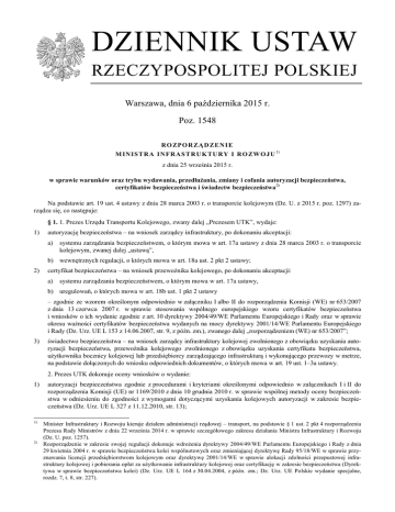 DZIENNIK USTAW RZECZYPOSPOLITEJ POLSKIEJ Warszawa, dnia 6 października 2015 r. Poz. 1548 RO ZPO R ZĄ D ZE N I E M INI S TR A INF RA S T R UK TU RY I RO ZW O J U 1) z dnia 25 września 2015 r. w sprawie warunków oraz trybu wydawania, przedłużania, zmiany i cofania autoryzacji bezpieczeństwa, certyfikatów bezpieczeństwa i świadectw bezpieczeństwa2) Na podstawie art. 19 ust. 4 ustawy z dnia 28 marca 2003 r. o transporcie kolejowym (Dz. U. z 2015 r. poz. 1297) zarządza się, co następuje: § 1. 1. Prezes Urzędu Transportu Kolejowego, zwany dalej „Prezesem UTK”, wydaje: 1) autoryzację bezpieczeństwa – na wniosek zarządcy infrastruktury, po dokonaniu akceptacji: a) systemu zarządzania bezpieczeństwem, o którym mowa w art. 17a ustawy z dnia 28 marca 2003 r. o transporcie kolejowym, zwanej dalej „ustawą”, b) wewnętrznych regulacji, o których mowa w art. 18a ust. 2 pkt 2 ustawy; 2) certyfikat bezpieczeństwa – na wniosek przewoźnika kolejowego, po dokonaniu akceptacji: a) systemu zarządzania bezpieczeństwem, o którym mowa w art. 17a ustawy, b) uregulowań, o których mowa w art. 18b ust. 1 pkt 2 ustawy – zgodnie ze wzorem określonym odpowiednio w załączniku I albo II do rozporządzenia Komisji (WE) nr 653/2007 z dnia 13 czerwca 2007 r. w sprawie stosowania wspólnego europejskiego wzoru certyfikatów bezpieczeństwa i wniosków o ich wydanie zgodnie z art. 10 dyrektywy 2004/49/WE Parlamentu Europejskiego i Rady oraz w sprawie okresu ważności certyfikatów bezpieczeństwa wydanych na mocy dyrektywy 2001/14/WE Parlamentu Europejskiego i Rady (Dz. Urz. UE L 153 z 14.06.2007, str. 9, z późn. zm.), zwanego dalej „rozporządzeniem (WE) nr 653/2007”; 3) świadectwo bezpieczeństwa – na wniosek zarządcy infrastruktury kolejowej zwolnionego z obowiązku uzyskania autoryzacji bezpieczeństwa, przewoźnika kolejowego zwolnionego z obowiązku uzyskania certyfikatu bezpieczeństwa, użytkownika bocznicy kolejowej lub przedsiębiorcy zarządzającego infrastrukturą i wykonującego przewozy w metrze, na podstawie dołączonych do wniosku odpowiednich dokumentów, o których mowa w art. 19 ust. 1–3a ustawy. 2. Prezes UTK dokonuje oceny wniosków o wydanie: 1) 1) 2) autoryzacji bezpieczeństwa zgodnie z procedurami i kryteriami określonymi odpowiednio w załącznikach I i II do rozporządzenia Komisji (UE) nr 1169/2010 z dnia 10 grudnia 2010 r. w sprawie wspólnej metody oceny bezpieczeństwa w odniesieniu do zgodności z wymogami dotyczącymi uzyskania kolejowych autoryzacji w zakresie bezpieczeństwa (Dz. Urz. UE L 327 z 11.12.2010, str. 13); Minister Infrastruktury i Rozwoju kieruje działem administracji rządowej – transport, na podstawie § 1 ust. 2 pkt 4 rozporządzenia Prezesa Rady Ministrów z dnia 22 września 2014 r. w sprawie szczegółowego zakresu działania Ministra Infrastruktury i Rozwoju (Dz. U. poz. 1257). Rozporządzenie w zakresie swojej regulacji dokonuje wdrożenia dyrektywy 2004/49/WE Parlamentu Europejskiego i Rady z dnia 29 kwietnia 2004 r. w sprawie bezpieczeństwa kolei wspólnotowych oraz zmieniającej dyrektywę Rady 95/18/WE w sprawie przyznawania licencji przedsiębiorstwom kolejowym oraz dyrektywę 2001/14/WE w sprawie alokacji zdolności przepustowej infrastruktury kolejowej i pobierania opłat za użytkowanie infrastruktury kolejowej oraz certyfikację w zakresie bezpieczeństwa (Dyrektywa w sprawie bezpieczeństwa kolei) (Dz. Urz. UE L 164 z 30.04.2004, z późn. zm.; Dz. Urz. UE Polskie wydanie specjalne, rozdz. 7, t. 8, str. 227). Dziennik Ustaw –2– Poz. 1548 2) certyfikatu bezpieczeństwa zgodnie z procedurami i kryteriami określonymi odpowiednio w załącznikach I–III do rozporządzenia Komisji (UE) nr 1158/2010 z dnia 9 grudnia 2010 r. w sprawie wspólnej metody oceny bezpieczeństwa w odniesieniu do zgodności z wymogami dotyczącymi uzyskania kolejowych certyfikatów bezpieczeństwa (Dz. Urz. UE L 326 z 10.12.2010, str. 11); 3) świadectwa bezpieczeństwa poprzez sprawdzenie kompletności i spójności dołączonych do wniosku odpowiednich dokumentów, o których mowa w art. 19 ust. 1–3a ustawy, oraz sprawdzenie zgodności tych dokumentów z przepisami dotyczącymi bezpieczeństwa w transporcie kolejowym. § 2. Świadectwa bezpieczeństwa wydaje się na okres 5 lat i przedłuża co 5 lat na wniosek podmiotów, o których mowa w § 1 ust. 1 pkt 3. § 3. Przedłużenia autoryzacji bezpieczeństwa, certyfikatów bezpieczeństwa i świadectw bezpieczeństwa dokonuje Prezes UTK na wniosek złożony przez właściwy podmiot, o którym mowa w § 1 ust. 1, w terminie nie późniejszym niż 3 miesiące przed upływem okresu ważności tych dokumentów. § 4. Prezes UTK zmienia certyfikat bezpieczeństwa w całości lub w części na wniosek przewoźnika kolejowego w przypadku dokonania zmian, o których mowa w art. 18b ust. 5 ustawy. § 5. Przewoźnik kolejowy składa wniosek o wydanie, przedłużenie lub zmianę certyfikatu bezpieczeństwa zgodnie ze wzorem określonym w załączniku III do rozporządzenia (WE) nr 653/2007. § 6. Wydanie, przedłużenie, zmiana i cofnięcie autoryzacji bezpieczeństwa, certyfikatu bezpieczeństwa i świadectwa bezpieczeństwa powinno być wpisane do prowadzonych przez Prezesa UTK rejestrów tych dokumentów. § 7. W toku rozpatrywania wniosków o wydanie, przedłużenie i zmianę autoryzacji bezpieczeństwa, certyfikatu bezpieczeństwa i świadectw bezpieczeństwa, Prezes UTK może żądać informacji i dokumentów uzupełniających, które zarządca infrastruktury, przewoźnik kolejowy, użytkownik bocznicy kolejowej i przedsiębiorca zarządzający infrastrukturą i wykonujący przewozy w metrze obowiązany jest złożyć niezwłocznie. § 8. Warunkiem wydania, przedłużenia i zmiany autoryzacji bezpieczeństwa, certyfikatów bezpieczeństwa i świadectw bezpieczeństwa jest wniesienie z tego tytułu opłaty, której wysokość określają przepisy wydane na podstawie art. 1