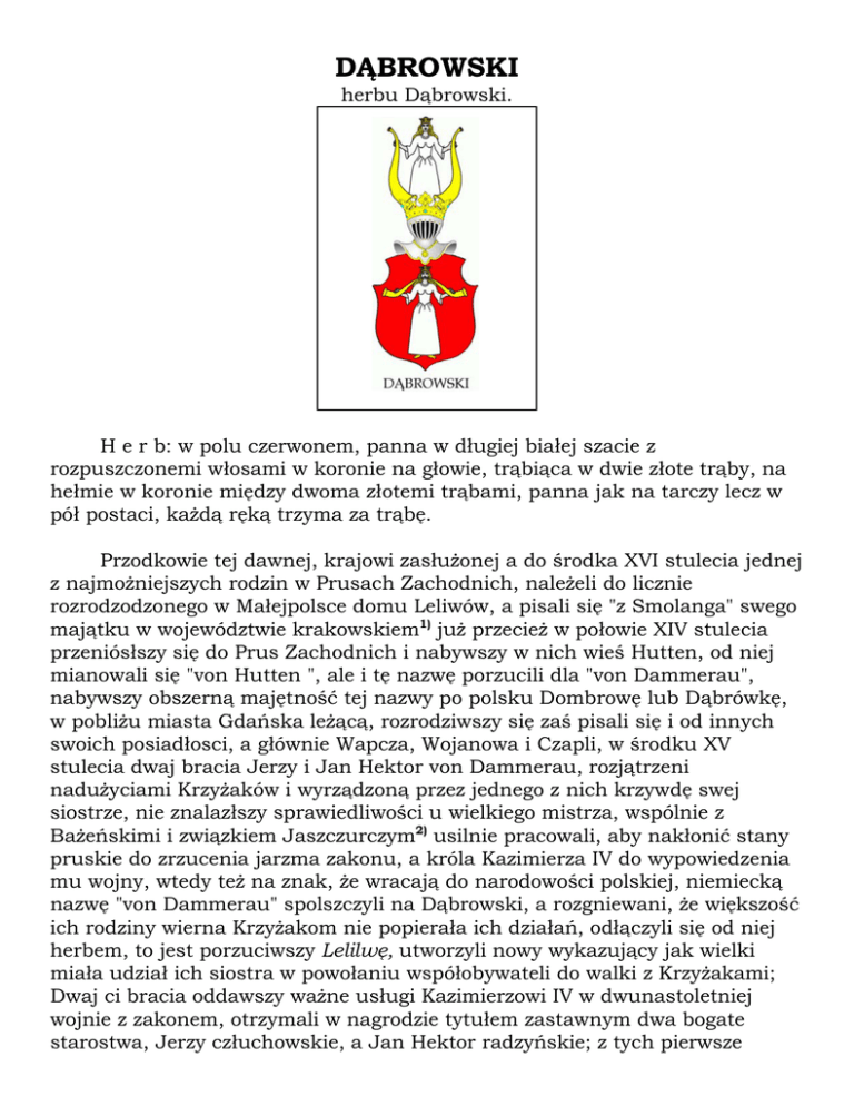 DĄBROWSKI herbu Dąbrowski. H e r b: w polu czerwonem, panna w długiej białej szacie z rozpuszczonemi włosami w koronie na głowie, trąbiąca w dwie złote trąby, na hełmie w koronie między dwoma złotemi trąbami, panna jak na tarczy lecz w pół postaci, każdą ręką trzyma za trąbę. Przodkowie tej dawnej, krajowi zasłużonej a do środka XVI stulecia jednej z najmożniejszych rodzin w Prusach Zachodnich, należeli do licznie rozrodzodzonego w Małejpolsce domu Leliwów, a pisali się "z Smolanga" swego majątku w województwie krakowskiem1) już przecież w połowie XIV stulecia przeniósłszy się do Prus Zachodnich i nabywszy w nich wieś Hutten, od niej mianowali się "von Hutten ", ale i tę nazwę porzucili dla "von Dammerau", nabywszy obszerną majętność tej nazwy po polsku Dombrowę lub Dąbrówkę, w pobliżu miasta Gdańska leżącą, rozrodziwszy się zaś pisali się i od innych swoich posiadłosci, a głównie Wapcza, Wojanowa i Czapli, w środku XV stulecia dwaj bracia Jerzy i Jan Hektor von Dammerau, rozjątrzeni nadużyciami Krzyżaków i wyrządzoną przez jednego z nich krzywdę swej siostrze, nie znalazłszy sprawiedliwości u wielkiego mistrza, wspólnie z Bażeńskimi i związkiem Jaszczurczym2) usilnie pracowali, aby nakłonić stany pruskie do zrzucenia jarzma zakonu, a króla Kazimierza IV do wypowiedzenia mu wojny, wtedy też na znak, że wracają do narodowości polskiej, niemiecką nazwę "von Dammerau" spolszczyli na Dąbrowski, a rozgniewani, że większość ich rodziny wierna Krzyżakom nie popierała ich działań, odłączyli się od niej herbem, to jest porzuciwszy Lelilwę, utworzyli nowy wykazujący jak wielki miała udział ich siostra w powołaniu współobywateli do walki z Krzyżakami; Dwaj ci bracia oddawszy ważne usługi Kazimierzowi IV w dwunastoletniej wojnie z zakonem, otrzymali w nagrodzie tytułem zastawnym dwa bogate starostwa, Jerzy człuchowskie, a Jan Hektor radzyńskie; z tych pierwsze wyszło z rąk ich rodziny po kądzieli już po latach kilkunastu, lecz drugie blisko przez lat dwieście utrzymało się w domu, że zaś Krzyżacy w czasie wojny zniszczyli do szczętu ich wieś Hutten, odbudowawszy ją po zawartym pokoju, nazwali Smolangiem na pamiątkę swej gniazdowej małopolskiej tego nazwiska. Z wspomnionych braci Jerzy starosta i komendant załogi w Człuchowie umarł jak się zdaje bezpotomnie, a Jan-Hektor z dworzanina króla Kazimierza IV, kasztelan chełmiński i starosta radzyński 1468; w bitwie pod Chojnicami 1454 roku tak był cięzko raniony, że uważany za zabitego już miał być od swych sług pogrzebiony, gdy jeden z nich dojrzawszy w nim resztki życia, przeniósł do pobliskiej chaty wieśniaczej i troskliwą opieką przywrócił w krótkim czasie do zdrowia, tak że Hektor już w następnym roku, mógł wystąpić do walki z Krzyżakami i chlubnie odznaczył się w bitwach pod Nowem i Tczewem. Z jego dwóch synów: 1) Mikołaj w 1476 kasztelan, a w 1481 wojewoda chełmiński, miał syna Krzysztofa kasztelana gdańskiego 1490 r. nazywanego Wojanowskim od swego dziedzictwa Wojanowa. 2) Jan dziedzic na Dammerau i Smolangu (Hutten) zostawił trzech synów: Bartłomieja, który służąc w wojsku węgierskim poległ w bitwie z Turkami pod Mochaczem, Mikołaja, ten odznaczywszy się w bitwie z Moskwą pod Orszą 1514, poległ w wyprawie księcia Konstyna Ostrogskiego na Siewierszczyznę i Jana wojewodę chełmińskiego 1504, pana na Dammerau Hutten starostwie radzyńskiem Wapczu i t. d. gorliwego obrońcę przywilejów swojej prowincji i dla żywszego okazania opozycji przeciwko roszczeniom polskim biorącego dawną nazwę von Dammerau i herb Leliwę, z żony von Rösselin Luzyańskiej, zostawił córkę Morteską kasztelanowę gdańską i dwóch synów; z tych: 1) Hugo, kasztelan gdański dziedzic na Smolangu i Wojanowie, równie jak jego ojciec żarliwy obrońca odrębności prowincjonalnej pruskiej, zostawił kilku synów: z tych Jan dziedzic na Czaplach pisał się od tej majętności, a jego potomkowie wzięli nazwisko z razu Czaplski a następnie Czapski i przydomek "z Smolanga” a w czasach ostatnich "von Hutten"; Hugo zaś, drugi syn kasztelana Hugona, chorąży chełmiński dziedzic na Wojanowie zmarły 1588, z żony Katarzyny Działyńskiej wojewodzianki chełmińskiej, zostawił sześciu synów, których potomkowie zgaśli w XVII stuleciu pisali się od swego dziedzictwa Wojanowskiemi a tak samo jak potomkowie Jana, Czapscy; zarzuciwszy herb Dąbrowskich, brali właściwą swemu domowi Leliwę. Jan starszy syn wojewody chełmińskiego Jana (p. w.) starosta radzyński w sprzeczności z innemi członkami swojej rodziny zwolennik instytucji polskich, spokrewniony przez żonę z Działyńskimi, popierał ich działania, dążące do spolszczenia Prus Zachodnich i zniesienia ich prowincjonalnej odrębności, stale się też pisał Dąbrowskim i brał herb tej nazwy, a za jego przykładem poszli i jego potomkowie; z dwóch żon Elżbiety Działyńskiej wojewodzianki chełmińskiej i N. Głuchowskiej bogatej dziedziczki za którą odziedziczył w posagu majątki Peterswalde, Solęcin i Zukow (Szukau), zostawił córkę Elżbietę Konopacką kasztelanowę chełmińską, i pięciu synów, z tych czterech zostawiło liczne potomstwo, a to ich rozrodzenie zaszkodziło znaczeniu rodziny, tem więcej, ze w dwóch wojnach szwedzkich 1526 - 1629 i 1655 - 1660 wiele ucierpiała, a bogate starostwo radzyńskie wyszło po kądzieli z jej posiadania. Z pięciu synów Jana, Feliks komandor maltański, wojownik przeciw Turkom, umarł 1621 r., a Jan sędzia chełmiński zostawił trzech synów, Jana, Stanisława i Felicjana; z tych Jan, towarzysz husarski w chorągwi Stefana Czarnieckiego, niepospolitej dzielności i odwagi, zrobił votum, że albo straci życie lub weźmie do niewoli albo trupem położy króla szwedzkiego Karola Gustawa; jakoż w bitwie pod Pragą przedarłszy się przez szeregi nieprzyjacie