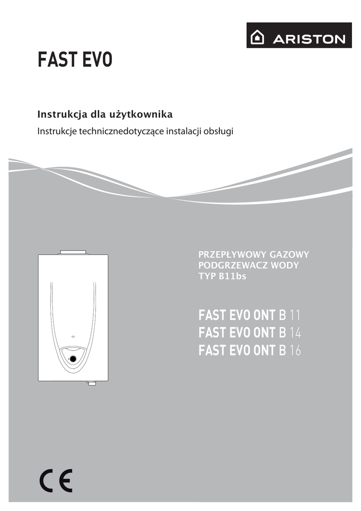 FAST EVO ,QVWUXNFMDGODXŮ\WNRZQLND Instrukcje technicznedotyczące instalacji obsługi 35=(3à<:2:<*$=2:< 32'*5=(:$&=:2'< 7<3%EV FAST EVO ONT B 11 FAST EVO ONT B 14 FAST EVO ONT B 16 instrukcja obsługi Ostrzeżenia ................................................................. 3 Oznakowanie CE ......................................................... 3 Normy bezpieczeństwa ............................................... 4 Panel sterowania ......................................................... 5 Instalacja baterii........................................................... 5 Wymiana baterii ........................................................... 5 Procedura zapalania palnika ....................................... 5 Regulacja temperatury wody ....................................... 6 Procedura wyłączania ................................................. 6 Warunki zatrzymania urządzenia ................................ 6 Zabezpieczenie przed zamarzaniem ........................... 7 Zmiana rodzaju gazu ................................................... 7 Okresowa obsługa i konserwacja ................................ 7 Szanowni Państwo. Pragniemy podziękować za wybór podczas zakupów podgrzewacza naszej produkcji. Jesteśmy pewni, że dostarczyliśmy Państwu produkt o istotnych walorach technicznych. Niniejsza instrukcja obsługi została opracowana specjalnie po to, aby przekazać Państwu ważne wskazówki i sugestie dotyczące zainstalowania, właściwego użytkowania, a także okresowej obsługi i konserwacji podgrzewacza, co pozwoli w pełni docenić jego zalety. Książeczkę tę należy starannie przechowywać, aby mogła zawsze służyć jako źródło informacji niezbędnych do korzystania z naszego urządzenia. Nasz Serwis Obsługi Technicznej właściwy dla strefy Państwa zamieszkania pozostaje do całkowitej dyspozycji w razie pojawienia się najmniejszego problemu związanego z nowo nabytym podgrzewaczem. Z wyrazami szacunku UWAGA! Woda o temperaturze powyżej 50 C może spowodować poważne oparzenia. Zawsze sprawdź temperaturę wody przed rozpoczęciem korzystania z urządzenia. WAŻNE! Jeśli urządzenie pracuje podgrzewając wodę o znacznej twardości ( > 200 mg/l) konieczne jest zastosowanie zmiękczania wody w celu ograniczenia zjawiska osadzania się kamienia kotłowego w wymienniku ciepła. Gwarancja nie obejmuje uszkodzeń związanych z tym zjawiskiem. Urządzenie to nie jest przystosowane do obsługi przez osoby (w tym dzieci) o ograniczonych możliwościach fizycznych, zmysłowych bądź umysłowych lub przez osoby nie posiadające odpowiedniego doświadczenia i wiedzy, chyba, że znajdują się one pod kontrolą osób odpowiedzialnych za ich bezpieczeństwo i zostały przez te osoby przeszkolone w kwestiach dotyczących obsługi urządzenia. Dzieci powinny znajdować się pod kontrolą, aby można było mieć pewność, że nie bawią się one urządzeniem. UWAGA! Urządzenie może być włączone dopiero po całkowitym napełnieniu wodą. instrukcja obsługi Niniejsza książeczka stanowią istotną, a zarazem nieodłączną część produktu. Użytkownik powinien starannie przechowywać obydwie wraz z podgrzewaczem, któremu powinny towarzyszyć nawet w przypadku przekazania go innemu właścicielowi lub użytkownikowi i/lub w sytuacji zainstalowania podgrzewacza w innym miejscu przy innej instalacji. Należy uważnie zapoznać się z instrukcjami i uwagami zawartymi zarówno w tej książeczce, jak i w Instrukcjach technicznych instalowania, okresowej obsługi i konserwacji, gdyż dostarczają one ważnych wskazówek dotyczących bezpieczeństwa w czasie instalowania, użytkowania i obsługi urządzenia. W przypadku definitywnego wyłączenia podgrzewacza z pracy należy odpowiednie prace powierzyć personelowi o odpowiednich kwalifikacjach. W celu wyczyszczenia zewnętrznych elementów należy wyłączyć podgrzewacz ustawiając wyłącznik zewnętrzny instalacji elektrycznej na pozycję “WYŁĄCZ”. Nie używać ani nie przechowywać w pomieszczeniu, w którym jest zainstalowany podgrzewacz żadnych substancji łatwopalnych. Opisywane urządzenie służy do wytwarzania ciepłej wody do użytku domowego. Powinno być podłączone do sieci rozprowadzającej ciepłą wodę użytkową o takich parametrach, które odpowiadałyby jego mocy, osiągom i możliwościom technicznym. Zabronione jest wykorzystywanie tego urządzenia do celów niezgodnych z tym, co zostało opisane w tej książeczce. Konstruktor nie ponosi żadnej odpowiedzialności za powstałe ewentualnie szkody, wynikające z niewłaściwego, błędnego i nieracjonalnego użytkowania, a także takie, które byłyby wynikiem zignorowania instrukcji i wskazówek zawartych w tej książeczce. Technik instalator powinien mieć uprawnienia do instalowania urządzeń grzewczych zgodnie z normami i obowiązującymi aktualnie przepisami, a na zakończenie prac wystawić klientowi dokument deklaracji zgodności. Zainstalowanie, obsługa i jakakolwiek interwencja techniczna w trakcie użytkowania powinny być wykonywane przy zachowaniu aktualnie obowiązujących norm i w oparciu o instrukcje dostarczone przez konstruktora urządzenia. W przypadku uszkodzenia i/lub niewłaściwego działania należy wyłączyć urządzenie, zamknąć zawór doprowadzający gaz i nie starać się naprawiać samemu, ale zwrócić się do personelu o odpowiednich kwalifikacjach. Ewentualne naprawy powinny być dokonywane przez osoby wykwalifikowane wyłącznie przy użyciu oryginalnych części zamiennych. Niezastosowanie się do powyższego zalecenia może wpłynąć na bezpieczeństwo pracy, jak również zwalnia konstruktora urządzenia od jakiejkolwiek odpowiedzialności. W przypadku prac lub konserwacji elementów znajdujących się w pobliżu kanałów lub innych fragmentów ciągu odprowadzania spalin należy wyłączyć podgrzewacz, a po zakończeniu wspomnianych prac zlecić sprawdzenie skuteczno