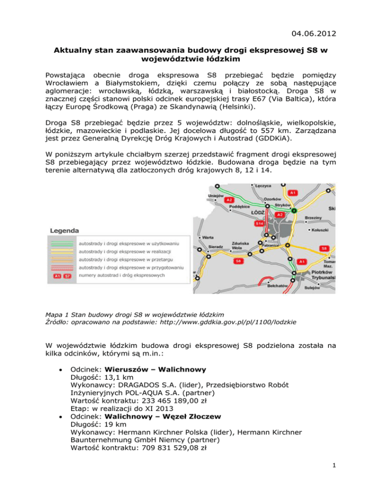 04.06.2012 Aktualny stan zaawansowania budowy drogi ekspresowej S8 w województwie łódzkim Powstająca obecnie droga ekspresowa S8 przebiegać będzie pomiędzy Wrocławiem a Białymstokiem, dzięki czemu połączy ze sobą następujące aglomeracje: wrocławską, łódzką, warszawską i białostocką. Droga S8 w znacznej części stanowi polski odcinek europejskiej trasy E67 (Via Baltica), która łączy Europę Środkową (Praga) ze Skandynawią (Helsinki). Droga S8 przebiegać będzie przez 5 województw: dolnośląskie, wielkopolskie, łódzkie, mazowieckie i podlaskie. Jej docelowa długość to 557 km. Zarządzana jest przez Generalną Dyrekcję Dróg Krajowych i Autostrad (GDDKiA). W poniższym artykule chciałbym szerzej przedstawić fragment drogi ekspresowej S8 przebiegający przez województwo łódzkie. Budowana droga będzie na tym terenie alternatywą dla zatłoczonych dróg krajowych 8, 12 i 14. Mapa 1 Stan budowy drogi S8 w województwie łódzkim Źródło: opracowano na podstawie: http://www.gddkia.gov.pl/pl/1100/lodzkie W województwie łódzkim budowa drogi ekspresowej S8 podzielona została na kilka odcinków, którymi są m.in.: Odcinek: Wieruszów – Walichnowy Długość: 13,1 km Wykonawcy: DRAGADOS S.A. (lider), Przedsiębiorstwo Robót Inżynieryjnych POL-AQUA S.A. (partner) Wartość kontraktu: 233 465 189,00 zł Etap: w realizacji do XI 2013 Odcinek: Walichnowy – Węzeł Złoczew Długość: 19 km Wykonawcy: Hermann Kirchner Polska (lider), Hermann Kirchner Baunternehmung GmbH Niemcy (partner) Wartość kontraktu: 709 831 529,08 zł 1 Odcinek: Łącznik drogi krajowej nr 12 do drogi ekspresowej S8 Długość: 6 km Wykonawcy: Przedsiębiorstwo Robót Drogowych i Mostowych z Sieradza (lider), Przedsiębiorstwo Budowy Dróg i Mostów Sp. z o.o. z Mińska Maz. (partner), Przedsiębiorstwo Robót Mostowych - "Mosty - Łódź" S.A. (partner) Wartość kontraktu: 83 931 087,58 zł Etap: w realizacji do IV 2014 Dzięki niemu centrum Sieradza zostanie w znacznym stopniu odciążone od ruchu tranzytowego z kierunku zachodniego - od strony Kalisza i Poznania. W odróżnieniu do pozostałych odcinków S8, ten sześciokilometrowy fragment będzie drogą jednojezdniową. Na południe od Sieradza, w miejscu skrzyżowania z DK14 zaplanowano rondo. Odcinek: Złoczew – Węzeł Sieradz Południe Długość: 19,6 km Wykonawcy: Strabag Sp. z o.o. z Pruszkowa (lider), Heilit+Woerner Budowlana Sp. z o.o. z Wrocławia (partner) Wartość kontraktu: 683 088 404,88 zł Etap: w realizacji do IV 2014 Odcinek: Sieradz Południe - Łask Długość: 33,6 km Wykonawcy: Przedsiębiorstwo Robót Inżynieryjnych POL - AQUA S.A. z Piaseczna (lider), Dragados S.A. Hiszpania (partner) Wartość kontraktu: 1 388 807 374,68 zł Etap: w realizacji do IV 2014 Zdjęcie 1. Wycinka drzew w okolicach Łasku pod budowę S8 (29.01.2012) Fot. Małgorzata Okniańska 2 Odcinek: Węzeł Łask – Węzeł Róża Długość: 9,1 km Wykonawcy: Przedsiębiorstwo Robót Inżynieryjnych POL - AQUA S.A. z Piaseczna (lider), Dragados S.A. Hiszpania (partner) Wartość kontraktu: 549 575 323,00 zł Etap: w realizacji do 2014 Odcinek: Róża – Węzeł Łódź Południe (A1) Długość: 19,4 km Wykonawca: Budimex Wartość kontraktu: 847 770 075,45zł Etap: w realizacji do 2014 Na wyżej wymienionych odcinkach trwają już prace budowlane, a tempo ich wykonywania wydaje się być duże. Poniżej przedstawiono kilka fotografii przedstawiających tereny budowy drogi ekspresowej S8 w województwie łódzkim. Zdjęcie 2. Prace przy budowie węzła na skrzyżowaniu S8 z DK1 (19.05.2012) Fot. Karina Hassa 3 Zdjęcie 3. Jedna z baz przedsiębiorstwa budującego S8 (24.05.2012) Fot. Hubert Antczak Zdjęcie 3. Tablica informacyjna na terenie budowy jednego z odcinków S8 (24.05.2012) Fot. Hubert Antczak 4 Z roku na rok na naszych drogach przybywa pojazdów, a w związku z tym pojawia się potrzeba rozbudowywania infrastruktury drogowej, co z pewnością jest sporym wyzwaniem dla naszego państwa. Dzisiaj już najprawdopodobniej nikomu nie trzeba nadmiernie uzasadniać konieczności budowy drogi ekspresowej S8 w takim kształcie, jaki realizowany jest obecnie. Śmiało można stwierdzić, że będzie to droga o znaczeniu strategicznym nie tylko dla aglomeracji łódzkiej, warszawskiej i wrocławskiej lecz także dla całego kraju. W chwili obecnej całe społeczeństwo odczuwa skutki natężenia ruchu na istniejących drogach krajowych, w szczególności na DK8, DK12 i DK14. Otwarcie kolejnych odcinków drogi ekspresowej S8 z pewnością znacząco poprawi tą niekorzystną sytuację. Kończąc nie pozostaje mi nic innego, jak jedynie wyrazić nadzieję na terminowe ukończenie prac budowlanych na powstających obecnie odcinkach S8. Michał Woźniak Uni-Logistics Team 5
