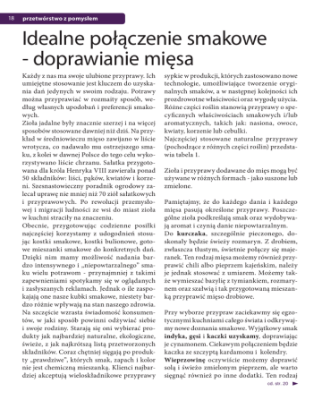 18 przetwórstwo z pomysłem Idealne połączenie smakowe - doprawianie mięsa Każdy z nas ma swoje ulubione przyprawy. Ich umiejętne stosowanie jest kluczem do uzyskania dań jedynych w swoim rodzaju. Potrawy można przyprawiać w rozmaity sposób, według własnych upodobań i preferencji smakowych. Zioła jadalne były znacznie szerzej i na więcej sposobów stosowane dawniej niż dziś. Na przykład w średniowieczu mięso zawijano w liście wrotycza, co nadawało mu ostrzejszego smaku, z kolei w dawnej Polsce do tego celu wykorzystywano liście chrzanu. Sałatka przygotowana dla króla Henryka VIII zawierała ponad 50 składników: liści, pąków, kwiatów i korzeni. Szesnastowieczny poradnik ogrodowy zalecał uprawę nie mniej niż 70 ziół sałatkowych i przyprawowych. Po rewolucji przemysłowej i migracji ludności ze wsi do miast zioła w kuchni straciły na znaczeniu. Obecnie, przygotowując codzienne posiłki najczęściej korzystamy z udogodnień stosując kostki smakowe, kostki bulionowe, gotowe mieszanki smakowe do konkretnych dań. Dzięki nim mamy możliwość nadania bardzo intensywnego i „niepowtarzalnego” smaku wielu potrawom - przynajmniej z takimi zapewnieniami spotykamy się w oglądanych i zasłyszanych reklamach. Jednak o ile zaspokajają one nasze kubki smakowe, niestety bardzo różnie wpływają na stan naszego zdrowia. Na szczęście wzrasta świadomość konsumentów, w jaki sposób powinni odżywiać siebie i swoje rodziny. Starają się oni wybierać produkty jak najbardziej naturalne, ekologiczne, świeże, z jak najkrótszą listą przetworzonych składników. Coraz chętniej sięgają po produkty „prawdziwe”, których smak, zapach i kolor nie jest chemiczną mieszanką. Klienci najbardziej akceptują wieloskładnikowe przyprawy sypkie w produkcji, których zastosowano nowe technologie, umożliwiające tworzenie oryginalnych smaków, a w następnej kolejności ich prozdrowotne właściwości oraz wygodę użycia. Różne części roślin stanowią przyprawy o specyficznych właściwościach smakowych i/lub aromatycznych, takich jak: nasiona, owoce, kwiaty, korzenie lub cebulki. Najczęściej stosowane naturalne przyprawy (pochodzące z różnych części roślin) przedstawia tabela 1. Zioła i przyprawy dodawane do mięs mogą być używane w różnych formach - jako suszone lub zmielone. Pamiętajmy, że do każdego dania i każdego mięsa pasują określone przyprawy. Poszczególne zioła podkreślają smak oraz wydobywają aromat i czynią danie niepowtarzalnym. Do kurczaka, szczególnie pieczonego, doskonały będzie świeży rozmaryn. Z drobiem, zwłaszcza tłustym, świetnie połączy się majeranek. Ten rodzaj mięsa możemy również przyprawić chili albo pieprzem kajeńskim, należy je jednak stosować z umiarem. Możemy także wymieszać bazylię z tymiankiem, rozmarynem oraz szałwią i tak przygotowaną mieszanką przyprawić mięso drobiowe. Przy wyborze przypraw zaciekawmy się egzotycznymi kuchniami całego świata i odkrywajmy nowe doznania smakowe. Wyjątkowy smak indyka, gęsi i kaczki uzyskamy, doprawiając je cynamonem. Ciekawym połączeniem będzie kaczka ze szczyptą kardamonu i kolendry. Wieprzowinę oczywiście możemy doprawić solą i świeżo zmielonym pieprzem, ale warto sięgnąć również po inne dodatki. Ten rodzaj cd. str. 20 wyposażenie przemysłu mięsnego 19 20 przetwórstwo z pomysłem mięsa doskonale komponuje się z majerankiem, tymiankiem, rozmarynem, kminkiem, miętą i cząbrem. Ponadto wieprzowinę przed smażeniem czy pieczeniem możemy natrzeć czosnkiem (najlepiej świeżymi ząbkami przeciśniętymi przez praskę). Do przyrządzania nieco bardziej tłustych partii, np. karkówki doskonale nadają się: goździki, sól, pieprz i cukier. Sprawdzi się także marynata z czerwonego wina, cebuli, ziela angielskiego, listka laurowego, pieprzu i soli. Natomiast z wieprzowym farszem doskonale połączy się szałwia. Nie zapominajmy również o świeżych ziołach prowansalskich. Zazwyczaj w skład mieszanki ziół prowansalskich wchodzą: tymianek, rozmaryn, oregano, cząber, estragon i majeranek, Tabela 1. Popularne zioła i przyprawy stosowane w przemyśle mięsnym Nasiona i owoce Pieprz Kminek Chili Anyż Papryka Gałka muszkatołowa Gorczyca Jałowiec Ziele angielskie Kwiaty i części kwiatów Goździki Szafran Kapary Nagietek Korzenie i części korzenia Imbir Kurkuma Chrzan Kora Cynamon Cebule Czosnek Cebula Liście Cząber Bazylia Tymianek Szałwia Melisa Natka pietruszki Szczypiorek Mięta Oregano Koper Rozmaryn Lubczyk Majeranek Inne przyprawy Sól kuchenna Musztarda cd. str. 22 wyposażenie przemysłu mięsnego 21 22 przetwórstwo z pomysłem a czasami dodatkowo: liść laurowy, koper, trybula lub mięta. Do przyprawienia wołowiny warto użyć pieprzu czarnego, natki pietruszki, a także chili, jeśli lubimy dania na ostro. Do tego typu mięsa pasuje również czosnek, oregano, jałowiec, majeranek i rozmaryn. Ważnymi przyprawami, które nadadzą wołowinie niepowtarzalnego smaku są również: anyż, kmin rzymski, goździki oraz laski cynamonu. Pamiętajmy jednak, że aby wołowina była smaczna należy posolić ją dopiero po pieczeniu. Baranina to mięso dość wymagające w przyrządzaniu. Przy tym wyrazistym, ciężkim mięsie, niezastąpiony będzie estragon. To zioło o intensywnym smaku i zapachu należy stosować w wersji suszonej lub świeżej. Majeranek, z którego wykorzystuje się głównie liście i kwiatostany, w postaci świeżej lub suszonej podkreśli naturalną woń mięsa. Czosnek świetnie nada się do baraniny, gdyż nie kłóci się z jej naturalną wonią, a wręcz podnosi smak i aromat potraw z tego mięsa. Baranina jest jednym z niewielu mięs, którym bardzo służy szałwia. Zioło to, ma balsamiczny zapach i nieco pikantny smak, dlatego należy go stosować z rozwagą i umiarem. Baraninę, jagnięcinę, tłuste pieczenie i dania z mięsa mielonego dobrze jest