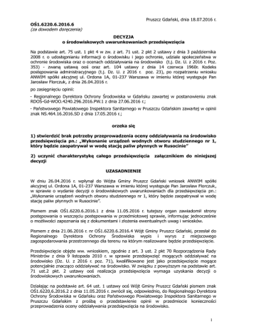 Pruszcz Gdański, dnia 18.07.2016 r. OŚ1.6220.6.2016.6 (za dowodem doręczenia) DECYZJA o środowiskowych uwarunkowaniach przedsięwzięcia Na podstawie art. 75 ust. 1 pkt 4 w zw. z art. 71 ust. 2 pkt 2 ustawy z dnia 3 października 2008 r. o udostępnianiu informacji o środowisku i jego ochronie, udziale społeczeństwa w ochronie środowiska oraz o ocenach oddziaływania na środowisko (t.j. Dz. U. z 2016 r. Poz. 353) - zwaną ustawą ooś oraz art. 104 ustawy z dnia 14 czerwca 1960r. Kodeks postępowania administracyjnego (t.j. Dz. U. z 2016 r. poz. 23), po rozpatrzeniu wniosku ANWIM spółki akcyjnej ul. Ordona 1A, 01-237 Warszawa w imieniu której występuje Pan Jarosław Florczuk, z dnia 26.04.2016 r. po zasięgnięciu opinii: - Regionalnego Dyrektora Ochrony Środowiska w Gdańsku zawartej w postanowieniu znak RDOŚ-Gd-WOO.4240.296.2016.PW.1 z dnia 27.06.2016 r.; - Państwowego Powiatowego Inspektora Sanitarnego w Pruszczu Gdańskim zawartej w opinii znak NS.464.16.2016.SD z dnia 17.05.2016 r.; orzeka się 1) stwierdzić brak potrzeby przeprowadzenia oceny oddziaływania na środowisko przedsięwzięcia pn.: „Wykonanie urządzeń wodnych otworu studziennego nr 1, który będzie zaopatrywał w wodę stację paliw płynnych w Rusocinie” 2) uczynić charakterystykę całego przedsięwzięcia decyzji załącznikiem do niniejszej UZASADNIENIE W dniu 26.04.2016 r. wpłynął do Wójta Gminy Pruszcz Gdański wniosek ANWIM spółki akcyjnej ul. Ordona 1A, 01-237 Warszawa w imieniu której występuje Pan Jarosław Florczuk, w sprawie o wydanie decyzji o środowiskowych uwarunkowaniach dla przedsięwzięcia pn.: „Wykonanie urządzeń wodnych otworu studziennego nr 1, który będzie zaopatrywał w wodę stację paliw płynnych w Rusocinie”. Pismem znak OŚ1.6220.6.2016.1 z dnia 11.05.2016 r. tutejszy organ zawiadomił strony postępowania o wszczęciu postępowania w przedmiotowej sprawie, informując jednocześnie o możliwości zapoznania się z dokumentami i złożenia ewentualnych uwag i wniosków. Pismem z dnia 21.06.2016 r. nr OŚ1.6220.6.2016.4 Wójt Gminy Pruszcz Gdański, przesłał do Regionalnego Dyrektora Ochrony Środowiska wypis i wyrys z miejscowego zagospodarowania przestrzennego dla terenu na którym realizowane będzie przedsięwzięcie. Przedsięwzięcie objęte ww. wnioskiem, zgodnie z art. 3 ust. 2 pkt 70 Rozporządzenia Rady Ministrów z dnia 9 listopada 2010 r. w sprawie przedsięwzięć mogących oddziaływać na środowisko (Dz. U. z 2016 r. poz. 71), kwalifikowane jest jako przedsięwzięcie mogące potencjalnie znacząco oddziaływać na środowisko. W związku z powyższym na podstawie art. 71 ust.2 pkt. 2 ustawy ooś realizacja przedsięwzięcia wymaga uzyskania decyzji o środowiskowych uwarunkowaniach. Działając na podstawie art. 64 ust. 1 ustawy ooś Wójt Gminy Pruszcz Gdański pismem znak OŚ1.6220.6.2016.2 z dnia 11.05.2016 r. zwrócił się, odpowiednio, do Regionalnego Dyrektora Ochrony Środowiska w Gdańsku oraz Państwowego Powiatowego Inspektora Sanitarnego w Pruszczu Gdańskim z prośbą o przedstawienie opinii w przedmiocie konieczności przeprowadzenia oceny oddziaływania przedsięwzięcia na środowisko. 1 Państwowy Powiatowy Inspektor Sanitarny w Pruszczu Gdańskim (opinia znak NS.464.16.2016.SD z dnia 17.05.2016 r.) oraz Regionalny Dyrektor Ochrony Środowiska Gdańsku (postanowienie znak RDOŚ-Gd-WOO.4240.296.2016.PW.1 z dnia 27.06.2016 r.) wyrazili opinię o braku konieczności przeprowadzenia oceny oddziaływania na środowisko planowanego przedsięwzięcia. W toku postępowania tut. organ ustalił i zważył co następuje: Stosownie do brzmienia art. 75 ust.1 pkt 4 ustawy ooś organem właściwym do rozpoznania sprawy jest Wójt Gminy Pruszcz Gdański. Zgodnie z treścią art. 71 ust. 2 pkt 2 ustawy ooś, uzyskanie decyzji o środowiskowych uwarunkowaniach jest wymagane dla przedsięwzięć mogących potencjalnie znacząco oddziaływać na środowisko. Wydanie decyzji o środowiskowych uwarunkowaniach następuje przed uzyskaniem decyzji, o jakich mowa w art. 72 ust. 1 ustawy ooś. W myśl art. 59 ust. 1 pkt 2 ustawy ooś realizacja planowanego przedsięwzięcia mogącego potencjalnie znacząco oddziaływać na środowisko może wymagać przeprowadzenia oceny oddziaływania przedsięwzięcia na środowisko. Postępowanie to zgodne z art. 61 ust. 2 wyżej cytowanej Ustawy przeprowadza organ właściwy do wydania decyzji o środowiskowych uwarunkowaniach. Spośród uwarunkowań określonych w art. 63 ust. 1 ustawy ooś w odniesieniu do wnioskowanego przedsięwzięcia nie znajdują zastosowania, ze względu na cechy i status obszaru, na którym planowana jest realizacja przedsięwzięcia, uwarunkowania określone w pkt. 2a, 2b, 2d, 2f, 2g, 2h, 2i, 2j. Uwzględniając pozostałe uwarunkowania, wskazane poniżej, Wójt Gminy Pruszcz Gdański ustalił i zważył co następuje, biorąc pod uwagę: 1) rodzaj i charakterystykę przedsięwzięcia, z uwzględnieniem: a) skali przedsięwzięcia i wielkości zajmowanego terenu oraz ich wzajemnych proporcji: Planowane przedsięwzięcie polega na wykonaniu urządzeń do poboru wody dla otworu studziennego nr 1 na działce nr 998 w miejscowości Rusocin. W ramach inwestycji przewiduje wykonanie otworu studziennego do głębokości 90 m. Zapotrzebowanie na wodę na przedmiotowym ujęciu wyniesie 36 m 3/h do celów przeciwpożarowych, zaś dla potrzeb sanitarnych klientów stacji zapotrzebowanie wyniesie 1,8 m 3/h. Urządzenia wodne będą zajmować powierzchnię ok. 10,0 m2. Stanowi to ok. 0,35 % powierzchni całej nieruchomości. b) powiązań z innymi przedsięwzięciami, w szczególności kumulowania się oddziaływań przedsięwzięć znajdujących się na obszarze, na który będzie oddziaływać przedsięwzięcie: Ze względu na charakter przedsięwzięcia nie dostrzega się powiązań z innymi przedsięwzięciami, a zarazem nie ma możliwości kumulowania się oddziaływań przedsięwzię