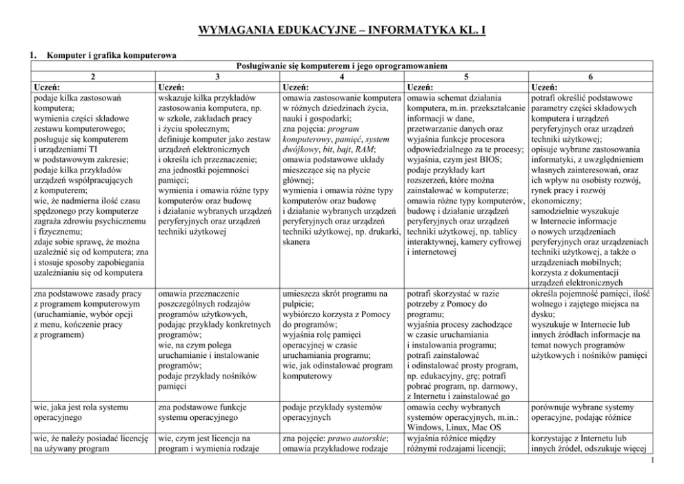 WYMAGANIA EDUKACYJNE – INFORMATYKA KL. I 1. Komputer i grafika komputerowa 2 Uczeń: podaje kilka zastosowań komputera; wymienia części składowe zestawu komputerowego; posługuje się komputerem i urządzeniami TI w podstawowym zakresie; podaje kilka przykładów urządzeń współpracujących z komputerem; wie, że nadmierna ilość czasu spędzonego przy komputerze zagraża zdrowiu psychicznemu i fizycznemu; zdaje sobie sprawę, że można uzależnić się od komputera; zna i stosuje sposoby zapobiegania uzależnianiu się od komputera Posługiwanie się komputerem i jego oprogramowaniem 4 5 Uczeń: Uczeń: Uczeń: wskazuje kilka przykładów omawia zastosowanie komputera omawia schemat działania zastosowania komputera, np. w różnych dziedzinach życia, komputera, m.in. przekształcanie w szkole, zakładach pracy nauki i gospodarki; informacji w dane, i życiu społecznym; zna pojęcia: program przetwarzanie danych oraz definiuje komputer jako zestaw komputerowy, pamięć, system wyjaśnia funkcje procesora urządzeń elektronicznych dwójkowy, bit, bajt, RAM; odpowiedzialnego za te procesy; i określa ich przeznaczenie; omawia podstawowe układy wyjaśnia, czym jest BIOS; zna jednostki pojemności mieszczące się na płycie podaje przykłady kart pamięci; głównej; rozszerzeń, które można wymienia i omawia różne typy wymienia i omawia różne typy zainstalować w komputerze; komputerów oraz budowę komputerów oraz budowę omawia różne typy komputerów, i działanie wybranych urządzeń i działanie wybranych urządzeń budowę i działanie urządzeń peryferyjnych oraz urządzeń peryferyjnych oraz urządzeń peryferyjnych oraz urządzeń techniki użytkowej techniki użytkowej, np. drukarki, techniki użytkowej, np. tablicy skanera interaktywnej, kamery cyfrowej i internetowej 3 zna podstawowe zasady pracy z programem komputerowym (uruchamianie, wybór opcji z menu, kończenie pracy z programem) omawia przeznaczenie poszczególnych rodzajów programów użytkowych, podając przykłady konkretnych programów; wie, na czym polega uruchamianie i instalowanie programów; podaje przykłady nośników pamięci umieszcza skrót programu na pulpicie; wybiórczo korzysta z Pomocy do programów; wyjaśnia rolę pamięci operacyjnej w czasie uruchamiania programu; wie, jak odinstalować program komputerowy wie, jaka jest rola systemu operacyjnego zna podstawowe funkcje systemu operacyjnego podaje przykłady systemów operacyjnych wie, że należy posiadać licencję na używany program wie, czym jest licencja na program i wymienia rodzaje zna pojęcie: prawo autorskie; omawia przykładowe rodzaje potrafi skorzystać w razie potrzeby z Pomocy do programu; wyjaśnia procesy zachodzące w czasie uruchamiania i instalowania programu; potrafi zainstalować i odinstalować prosty program, np. edukacyjny, grę; potrafi pobrać program, np. darmowy, z Internetu i zainstalować go omawia cechy wybranych systemów operacyjnych, m.in.: Windows, Linux, Mac OS wyjaśnia różnice między różnymi rodzajami licencji; 6 Uczeń: potrafi określić podstawowe parametry części składowych komputera i urządzeń peryferyjnych oraz urządzeń techniki użytkowej; opisuje wybrane zastosowania informatyki, z uwzględnieniem własnych zainteresowań, oraz ich wpływ na osobisty rozwój, rynek pracy i rozwój ekonomiczny; samodzielnie wyszukuje w Internecie informacje o nowych urządzeniach peryferyjnych oraz urządzeniach techniki użytkowej, a także o urządzeniach mobilnych; korzysta z dokumentacji urządzeń elektronicznych określa pojemność pamięci, ilość wolnego i zajętego miejsca na dysku; wyszukuje w Internecie lub innych źródłach informacje na temat nowych programów użytkowych i nośników pamięci porównuje wybrane systemy operacyjne, podając różnice korzystając z Internetu lub innych źródeł, odszukuje więcej 1 komputerowy; wie, na czym polega piractwo komputerowe i jakie grożą sankcje za nielegalne uzyskanie programu komputerowego w celu osiągnięcia korzyści majątkowych licencji; wymienia przykłady przestępczości komputerowej darmowych licencji; rozumie zasady licencji na omawia przejawy przestępczości używany program komputerowej Opracowywanie za pomocą komputera obrazów (rysunków, zdjęć) 3 4 5 Uczeń: Uczeń: Uczeń: Uczeń: przy użyciu wybranego edytora zna i omawia zasady tworzenia zna podstawowe formaty plików przekształca formaty plików grafiki tworzy prosty rysunek, dokumentu komputerowego na graficznych; graficznych; używając podstawowych przykładzie tworzenia rysunku posługuje się narzędziami umieszcza napisy na obrazie, narzędzi graficznych; w programie graficznym; malarskimi trzech wybranych porównując możliwości dwóch potrafi zapisać dokument rozumie, dlaczego należy programów graficznych do wybranych programów komputerowy w pliku zapisać dokument na wybranym tworzenia kompozycji z figur; graficznych; w określonym miejscu (dysku, nośniku pamięci masowej; wykonuje operacje na obrazie tworzy rozbudowane animacje folderze); odczytuje rysunek przy użyciu wybranego edytora i jego fragmentach, komputerowe; zapisany w pliku, wprowadza grafiki tworzy rysunki, stosując m.in.: zaznacza, kopiuje i wkleja zmienia kolory i inne efekty na zmiany i zapisuje ponownie plik operacje na obrazie i jego fragmenty rysunku i zdjęcia, zdjęciu, stosując wybrane fragmentach, przekształca stosując wybrane programy programy graficzne; obrazy; umieszcza napisy graficzne; wykonuje fotomontaż, na obrazie; wie, czym są warstwy obrazu; korzystając z możliwości pracy tworzy proste animacje tworzy obraz z wykorzystaniem na warstwach obrazu; komputerowe pracy na warstwach; tworzy animacje, korzystając korzysta z różnych narzędzi z możliwości pracy na selekcji; warstwach i z przekształceń tworzy animacje komputerowe; fragmentów obrazu; drukuje rysunek drukuje obraz, ustalając samodzielnie wybrane parametry wydruku Porządkow