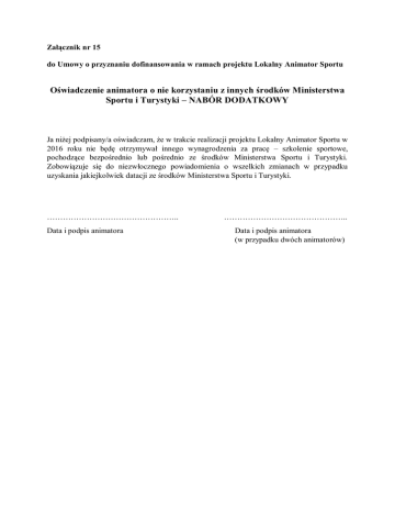Załącznik nr 15 do Umowy o przyznaniu dofinansowania w ramach projektu Lokalny Animator Sportu Oświadczenie animatora o nie korzystaniu z innych środków Ministerstwa Sportu i Turystyki – NABÓR DODATKOWY Ja niżej podpisany/a oświadczam, że w trakcie realizacji projektu Lokalny Animator Sportu w 2016 roku nie będę otrzymywał innego wynagrodzenia za pracę – szkolenie sportowe, pochodzące bezpośrednio lub pośrednio ze środków Ministerstwa Sportu i Turystyki. Zobowiązuje się do niezwłocznego powiadomienia o wszelkich zmianach w przypadku uzyskania jakiejkolwiek datacji ze środków Ministerstwa Sportu i Turystyki. ………………………………………….. Data i podpis animatora ……………………………………….. Data i podpis animatora (w przypadku dwóch animatorów)