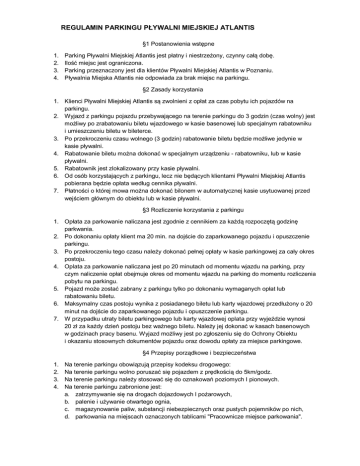 REGULAMIN PARKINGU PŁYWALNI MIEJSKIEJ ATLANTIS §1 Postanowienia wstępne 1. 2. 3. 4. Parking Pływalni Miejskiej Atlantis jest płatny i niestrzeżony, czynny całą dobę. Ilość miejsc jest ograniczona. Parking przeznaczony jest dla klientów Pływalni Miejskiej Atlantis w Poznaniu. Pływalnia Miejska Atlantis nie odpowiada za brak miejsc na parkingu. §2 Zasady korzystania 1. Klienci Pływalni Miejskiej Atlantis są zwolnieni z opłat za czas pobytu ich pojazdów na parkingu. 2. Wyjazd z parkingu pojazdu przebywającego na terenie parkingu do 3 godzin (czas wolny) jest możliwy po zrabatowaniu biletu wjazdowego w kasie basenowej lub specjalnym rabatowniku i umieszczeniu biletu w bileterce. 3. Po przekroczeniu czasu wolnego (3 godzin) rabatowanie biletu będzie możliwe jedynie w kasie pływalni. 4. Rabatowanie biletu można dokonać w specjalnym urządzeniu - rabatowniku, lub w kasie pływalni. 5. Rabatownik jest zlokalizowany przy kasie pływalni. 6. Od osób korzystających z parkingu, lecz nie będących klientami Pływalni Miejskiej Atlantis pobierana będzie opłata według cennika pływalni. 7. Płatności o której mowa można dokonać bilonem w automatycznej kasie usytuowanej przed wejściem głównym do obiektu lub w kasie pływalni. §3 Rozliczenie korzystania z parkingu 1. Opłata za parkowanie naliczana jest zgodnie z cennikiem za każdą rozpoczętą godzinę parkwania. 2. Po dokonaniu opłaty klient ma 20 min. na dojście do zaparkowanego pojazdu i opuszczenie parkingu. 3. Po przekroczeniu tego czasu należy dokonać pełnej opłaty w kasie parkingowej za cały okres postoju. 4. Oplata za parkowanie naliczana jest po 20 minutach od momentu wjazdu na parking, przy czym naliczenie opłat obejmuje okres od momentu wjazdu na parking do momentu rozliczenia pobytu na parkingu. 5. Pojazd może zostać zabrany z parkingu tylko po dokonaniu wymaganych opłat lub rabatowaniu biletu. 6. Maksymalny czas postoju wynika z posiadanego biletu lub karty wjazdowej przedłużony o 20 minut na dojście do zaparkowanego pojazdu i opuszczenie parkingu. 7. W przypadku utraty biletu parkingowego lub karty wjazdowej oplata przy wyjeździe wynosi 20 zł za każdy dzień postoju bez ważnego biletu. Należy jej dokonać w kasach basenowych w godzinach pracy basenu. Wyjazd możliwy jest po zgłoszeniu się do Ochrony Obiektu i okazaniu stosownych dokumentów pojazdu oraz dowodu opłaty za miejsce parkingowe. §4 Przepisy porządkowe i bezpieczeństwa 1. 2. 3. 4. Na terenie parkingu obowiązują przepisy kodeksu drogowego: Na terenie parkingu wolno poruszać się pojazdem z prędkością do 5km/godz. Na terenie parkingu należy stosować się do oznakowań poziomych I pionowych. Na terenie parkingu zabronione jest: a. zatrzymywanie się na drogach dojazdowych l pożarowych, b. palenie i używanie otwartego ognia, c. magazynowanie paliw, substancji niebezpiecznych oraz pustych pojemników po nich, d. parkowania na miejscach oznaczonych tablicami "Pracownicze miejsce parkowania".
