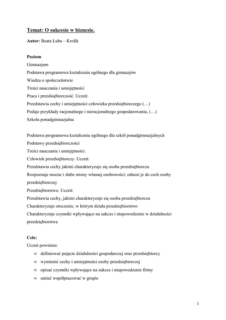 Temat: O sukcesie w biznesie. Autor: Beata Łuba – Krolik Poziom Gimnazjum Podstawa programowa kształcenia ogólnego dla gimnazjów Wiedza o społeczeństwie Treści nauczania i umiejętności Praca i przedsiębiorczość. Uczeń: Przedstawia cechy i umiejętności człowieka przedsiębiorczego (…) Podaje przykłady racjonalnego i nieracjonalnego gospodarowania, (…) Szkoła ponadgimnazjalna Podstawa programowa kształcenia ogólnego dla szkół ponadgimnazjalnych Podstawy przedsiębiorczości Treści nauczania i umiejętności: Człowiek przedsiębiorczy. Uczeń: Przedstawia cechy jakimi charakteryzuje się osoba przedsiębiorcza Rozpoznaje mocne i słabe strony własnej osobowości; odnosi je do cech osoby przedsiębiorczej Przedsiębiorstwo. Uczeń: Przedstawia cechy, jakimi charakteryzuje się osoba przedsiębiorcza Charakteryzuje otoczenie, w którym działa przedsiębiorstwo Charakteryzuje czynniki wpływające na sukces i niepowodzenie w działalności przedsiębiorstwa Cele: Uczeń powinien: • definiować pojęcie działalności gospodarczej oraz przedsiębiorcy • wymienić cechy i umiejętności osoby przedsiębiorczej • opisać czynniki wpływające na sukces i niepowodzenie firmy • umieć współpracować w grupie 1 Metody: • praca z tekstem • praca w grupach • elementy burzy mózgów • dyskusja • miniwykład • piramida priorytetów Pojęcia kluczowe: • działalność gospodarcza • przedsiębiorca • przedsiębiorczość • czynniki wytwórcze Materiały: Materiał pomocniczy nr 1- Komiks – Oszczędzania / inwestowanie, „Mikołaj”, autor: Michał Ogiński, nagroda w kategorii i nagroda Antoniego Rodowicza w konkursie FOR Materiał pomocniczy nr 2 – Schemat piramidy priorytetów Materiał pomocniczy nr 3 – a) Schemat „Cechy dobrego przedsiębiorcy” b) Tabela „Wady i zalety własnej firmy” Materiał pomocniczy nr 4 – Materiał FOR „Oszczędzanie i inwestowanie” Przebieg zajęć: 1. Przedstaw uczniom temat i cele lekcji. Rozdaj komiks M. Ogińskiego, poproś o przeczytanie. Porozmawiaj z uczniami, o tym:: - Kto jest bohaterem komiksu? Czym się zajmuje? Jaką prowadzi działalność? - Jakie pomysły na biznes zostały opisane w komiksie? - Jak oceniacie pomysły bohatera komiksu na własną firmę? 2 - Dlaczego bohater komiksu zdecydował się na prowadzenie właśnie takiej działalności? Jaki był jego cel? 2. Przedstaw uczniom obowiązującą w polskim prawie definicję działalności gospodarczej. Zgodnie z ustawą o swobodzie działalności gospodarczej (Dz.U. 2004 Nr 173 poz.1807) jest to zarobkowa działalność wytwórcza, handlowa, budowlana, usługowa oraz poszukiwanie, rozpoznawania i wydobywanie kopalin ze złóŜ, a takŜe działalność zawodowa, wykonywana w sposób zorganizowany i ciągły Jej celem jest osiągnięcie dochodu (zysku), a więc nadwyŜki przychodów nad kosztami. Przedsiębiorcą w rozumieniu ustawy jest osoba fizyczna, osoba prawna i jednostka organizacyjna nie będąca osobą prawną, której odrębna ustawa przyznaje zdolność prawną – wykonująca we własnym imieniu działalność gospodarczą. Odwołując się do przedstawionej definicji zapytaj – czy bohatera komiksu moŜna nazwać przedsiębiorcą? 3. Zwróć uwagę uczniów, Ŝe w ekonomii przedsiębiorcą jest osoba (lub grupa osób), która podejmuje decyzje i ryzyko wykorzystania czynników wytwórczych czyli zasobów potrzebnych do wytworzenia nowej wartości (produktu lub usługi). Ekonomiści dzielą czynniki wytwórcze na pracę i kapitał. Wielkość dostępnych nakładów pracy określa nie tylko liczba osób zdolnych do pracy, ale takŜe posiadane przez nich kwalifikacje zawodowe i umiejętności, które wpływają na efektywność wykonywanej pracy. Kapitał to z kolei maszyny, urządzenia i nieruchomości angaŜowane w procesie produkcji. O wielkości produktu, który moŜna wytworzyć przy wykorzystaniu dostępnej wielkości pracy i kapitału decyduje takŜe technologia produkcji, czyli efektywność z jaką poszczególne czynniki wytwórcze są wykorzystywane przez przedsiębiorcę. DuŜa rolę w technologii produkcji odgrywa umiejętność organizacji pracy, czyli przedsiębiorczość osoby zarządzającej przedsiębiorstwem. 4. Ponownie odwołaj się do historii opisanej w komiksie i zapytaj, co było potrzebne św. Mikołajowi do uruchomienia działalności? W jaki sposób zdobył potrzebne mu środki? Porozmawiaj z uczniami na temat znaczenia przedsiębiorczości. Zwróć uwagę, Ŝe nie trzeba być przedsiębiorcą, aby być przedsiębiorczym. Poproś uczniów o podanie przykładów osób, które uwaŜają za przedsiębiorcze, a które nie mają własnych firm. 3 5. Powiedz, Ŝe decyzja o załoŜeniu własnej firmy jest powaŜnym wyzwaniem, wymagającym analizy wielu czynników wpływających na sukces/niepowodzenie firmy. Stosując metodę burzy mózgów poproś uczniów, aby podali czynniki, które ich zdaniem mają wpływ na sukces/niepowodzenie firmy. Poproś jedną osobę o zapisywanie wszystkich pomysłów na tablicy. Na tym etapie wypowiedzi uczniów nie powinny być oceniane i selekcjonowane. Następnie podziel uczniów na 4 grupy, kaŜdej rozdaj kartki samoprzylepne oraz plakat z narysowaną piramidą priorytetów (materiał pomocniczy nr 2). Poproś, aby kaŜda grupa z zapisanych na tablicy czynników wpływających na sukces firmy wybrała 10, ich zdaniem, najwaŜniejszych. Następnie pracując metodą piramidy priorytetów zapisane na kartkach w formie równowaŜników zdań hasła uczniowie powinni nakleić w odpowiednie miejsce piramidy, szeregując je wg. stopnia waŜności, istotności. Przy czym 1 oznacza czynnik najwaŜniejszy, 10 – najmniej istotny. Podkreśl, Ŝe stworzona przez grupę piramida powinna uwzględniać zdanie wszystkich członków zespołu. Po zakończeniu pracy poproś przedstawicieli grup o prezentację swoich piramid. MoŜesz poprosić uczniów o stworzenie wspólnego ran