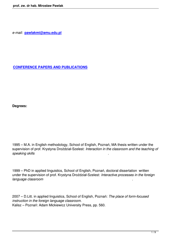 prof. zw. dr hab. Mirosław Pawlak e-mail: [email protected] CONFERENCE PAPERS AND PUBLICATIONS Degrees: 1995 – M.A. in English methodology, School of English, Poznań, MA thesis written under the supervision of prof. Krystyna Droździał-Szelest: Interaction in the classroom and the teaching of speaking skills . 1999 – PhD in applied linguistics, School of English, Poznań, doctoral dissertation written under the supervision of prof. Krystyna Droździał-Szelest: Interactive processes in the foreign language classroom . 2007 – D.Litt. in applied linguistics, School of English, Poznań: The place of form-focused instruction in the foreign language classroom. Kalisz – Poznań: Adam Mickiewicz University Press, pp. 560. 1/9 prof. zw. dr hab. Mirosław Pawlak 2013 – Full Professor (the title of professor) in the field of humanities. Research interests: - interactive processes in the foreign language classroom - form-focused instruction - corrective feedback in the foreign language classroom - learner autonomy - individual differences in language learning - communication strategies - learning strategies - pronunciation learning strategies - grammar learning strategies - teaching foreign language pronunciation 2/9 prof. zw. dr hab. Mirosław Pawlak - task-based language learning and teaching - learning and teaching speaking in a foreign language - measurement of explicit and implicit knowledge - language testing - language policies of the Council of Europe - European Language Portfolio Teaching experience: - foreign language pedagogy - issues in language acquisition and use - new technologies in foreign language learning and teaching - selected issues in applied linguistics - intercultural communication 3/9 prof. zw. dr hab. Mirosław Pawlak - BA seminar - MA seminar - supplementary seminar - proseminar - practical English Honors: - Prize of the Principal of Tadeusz Kościuszko High School in Turek in 1997, 1999 and 2001. - Prize of the Rector of Adam Mickiewicz University in 2006, 2007, 2009 and 2013. - Prize of the Rector of State School of Higher Professional Education in Konin in 2001, 2002, 2005, 2006, 2007, 2008, 2009 and 2010. - Prize of the Minister of Higher Education for Administrative Achievements in 2012. 4/9 prof. zw. dr hab. Mirosław Pawlak Professional organizations: - Modern Language Association of Poland – Secretary General - Polish Association for the Study of English (PASE) – PASE Board Member - International Association of Teachers of English as a Foreign Language (IATEFL) - International Association of Teachers of English as a Foreign Language in Poland (IATEFL Poland) - European Society for the Study of English (ESSE) - Teachers of English to Speakers of Other Languages (TESOL) - American Association of Applied Linguistics (AAAL) - British Association for Applied Linguistics (BAAL) - European Second Language Association (EUROSLA) - American Council on the Teaching of Foreign Languages (ACTFL) - Polish Society for Applied Linguistics - Cracow Association for Popularizing Knowledge About Language Communication “Tertium” 5/9 prof. zw. dr hab. Mirosław Pawlak Organizer of conferences and congresses: - Autonomia ucznia w nauczaniu języków obcych [Learner autonomy in teaching foreign languages], Konin, May 12-14, 2003, Konin. Head of the Organizing Committee. - Europejski system opisu kształcenia językowego i Europejskie portfolio językowe a polski system edukacji [The Common European Framework for Languages and the European Language Portfolio in the Polish educational system], Łódź, September 26-28, 2007. Head of the Organizing Committee. - Autonomia ucznia w nauczaniu języków obcych – co osiągnęliśmy i dokąd zmierzamy [Learner autonomy in teaching foreign languages – achievements and challenges], Konin, May 9-11, 2007, Konin. Head of the Organizing Committee. - International IATEFL Research SIG Conference: Exploring English language learning and teaching , Konin, October 5-6, 2007. Hea d of the Organizing Committee. - Konferencja Polskiego Towarzystwa Neofilologicznego: Nauczyciel języków obcych dziś i jutro [Annual Conference of the Modern Language Association of Poland: The foreign language teacher: The present and the future], Kalisz, September 8-10, 2008. Head of the Organizing Committee. - Mówienie w języku obcym – sukcesy i porażki uczenia się i nauczania [Speaking in a foreign language: Successes and failures of teaching and learning], Konin, May 18-20, 2009. 6/9 prof. zw. dr hab. Mirosław Pawlak Head of the Organizing Committee. - Autonomia ucznia w nauczaniu języków obcych – uczeń a nauczyciel [Learner autonomy in teaching foreign languages – the learner and the teacher], Konin, May 10-12, 2010, Konin. Head of the Organizing Committee. - 19 th Conference of the Polish Association for the Study of English: Crossing frontiers, staking out new territories : Kalisz, April 19-21, 2010. Head of the Organizing Committee. - Konferencja Polskiego Towarzystwa Neofilologicznego: Dyskurs edukacyjny w klasie językowej [Annual Conference of the Modern Language Association of Poland: Educational discourse in the foreign language classroom], Kalisz, September 12-14, 2011. Head of the Organizing Committee. - Mówienie w języku obcym – sukcesy i porażki uczenia się i nauczania [Speaking in a foreign language: Effective learning, teaching and assessment], Konin, May 16-18, 2011. Head of the Organizing Committee. - International Conference organized in collaboration with the IATEFL Research SIG: Class room-oriented research: Achievements and challenges. Kalisz, October 14-16, 2011. Head of the Organizing Committee. - Autonomia ucznia w nauczaniu języków obcych – techniki, strategie, narzędzia [Learner autonomy in teaching foreign languages: Techniques, strategies, resources], Konin, May 8-10, 2012. Head of the Organizing Committee. - 22 nd EUROSLA Conference: Expanding discipline boundaries, Poznań, September 5-8, 2012.