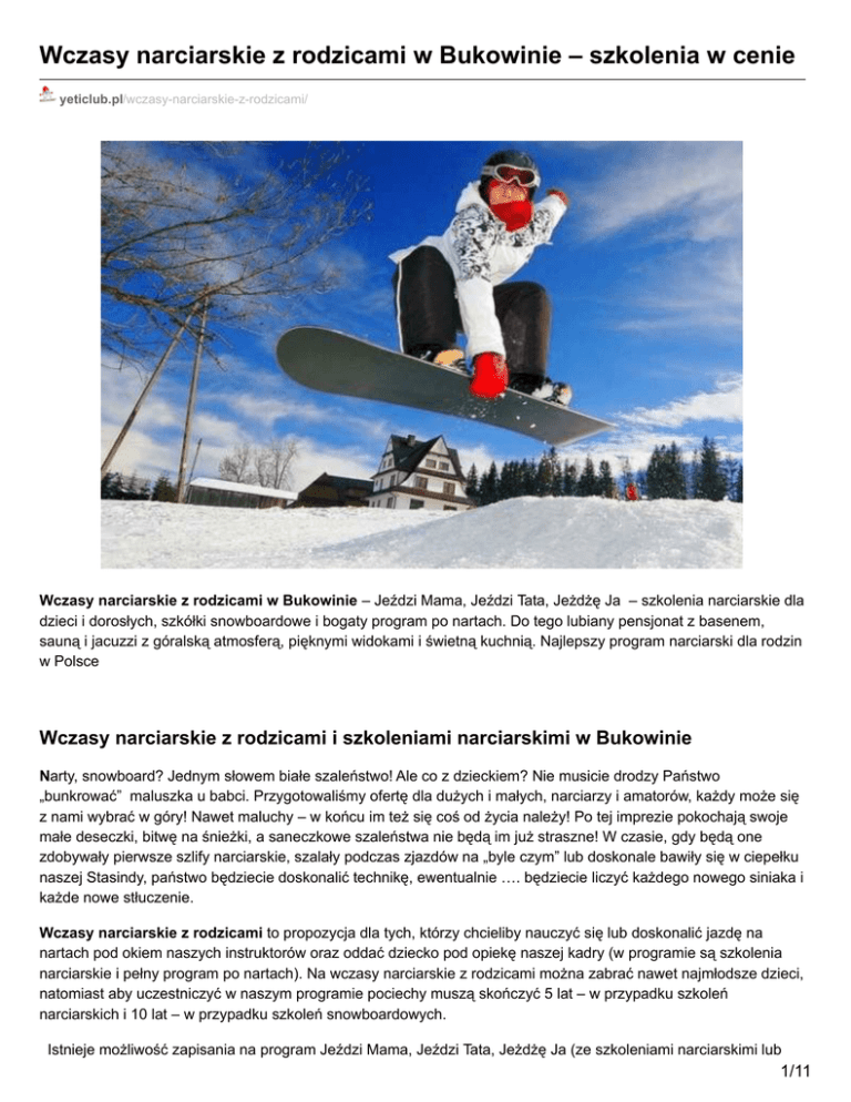 Wczasy narciarskie z rodzicami w Bukowinie – szkolenia w cenie yeticlub.pl/wczasy-narciarskie-z-rodzicami/ Wczasy narciarskie z rodzicami w Bukowinie – Jeździ Mama, Jeździ Tata, Jeżdżę Ja – szkolenia narciarskie dla dzieci i dorosłych, szkółki snowboardowe i bogaty program po nartach. Do tego lubiany pensjonat z basenem, sauną i jacuzzi z góralską atmosferą, pięknymi widokami i świetną kuchnią. Najlepszy program narciarski dla rodzin w Polsce Wczasy narciarskie z rodzicami i szkoleniami narciarskimi w Bukowinie Narty, snowboard? Jednym słowem białe szaleństwo! Ale co z dzieckiem? Nie musicie drodzy Państwo „bunkrować” maluszka u babci. Przygotowaliśmy ofertę dla dużych i małych, narciarzy i amatorów, każdy może się z nami wybrać w góry! Nawet maluchy – w końcu im też się coś od życia należy! Po tej imprezie pokochają swoje małe deseczki, bitwę na śnieżki, a saneczkowe szaleństwa nie będą im już straszne! W czasie, gdy będą one zdobywały pierwsze szlify narciarskie, szalały podczas zjazdów na „byle czym” lub doskonale bawiły się w ciepełku naszej Stasindy, państwo będziecie doskonalić technikę, ewentualnie …. będziecie liczyć każdego nowego siniaka i każde nowe stłuczenie. Wczasy narciarskie z rodzicami to propozycja dla tych, którzy chcieliby nauczyć się lub doskonalić jazdę na nartach pod okiem naszych instruktorów oraz oddać dziecko pod opiekę naszej kadry (w programie są szkolenia narciarskie i pełny program po nartach). Na wczasy narciarskie z rodzicami można zabrać nawet najmłodsze dzieci, natomiast aby uczestniczyć w naszym programie pociechy muszą skończyć 5 lat – w przypadku szkoleń narciarskich i 10 lat – w przypadku szkoleń snowboardowych. Istnieje możliwość zapisania na program Jeździ Mama, Jeździ Tata, Jeżdżę Ja (ze szkoleniami narciarskimi lub 1/11 snowboardowymi) tylko dziecka lub dzieci, a rodziców, opiekunów, dziadka lub babcię na program wczasów – bez szkoleń. Dorośli będą mogli wówczas w ciągu dnia jeździć na nartach samodzielnie lub po prostu odpoczywać podczas gdy dzieci będą korzystały z pełnego programu szkoleń i zajęć po nartach pod opieką naszych instruktorów – W hotelu góralski pensjonat z basenem, jacuzzi i sauną (dodatkowo płatne) doskonała atmosfera i domowa kuchnia najbliższe stoki ok 500 m od ośrodka W programie szkolenia narciarskie i snowboardowe dla dzieci i dorosłych – W CENIE ! bogaty program po nartach ognisko z kiełbaskami, dyskoteki, karaoke … Gdzie mieszkamy i jeździmy na nartach B UKOWINA TATRZAŃSKA cieszy się opinią jednego z najpiękniejszych ośrodków turystycznych w Polsce. Tto doskonałe miejsce dla wszystkich tych, którzy marzą o zimowym wypoczynku w atmosferze górskiego miasteczka z mnóstwem kameralnych knajpek, regionalnych restauracji, tras spacerowych, świetnymi stokami, a jednocześnie z dala od wielkomiejskiego zgiełku. Dla tych z Państwa, którzy zapragną kolorowych świateł dyskotek i wesołego tłumu oddalone o kilka kilometrów Zakopane. Bukowina to raj dla narciarzy i snowboardzistów. Trasy narciarskie są różnorodne, a ich stopień trudności odpowiada zarówno starym wyjadaczom, jak i tym, którzy mają mniejsze umiejętności. Położenie Bukowiny 1000 m n.p.m to niezaprzeczalny atut: w sytuacji załamania pogody, na tej wysokości jej skutki są zdecydowanie mniejsze niż gdzie indziej. Daje to niewątpliwy komfort wypoczynku oraz co bardzo ważne, stabilne warunki na stokach. O ogromnej popularności bukowiańskich basenów termalnych nikogo nie trzeba przekonywać! To doskonała zabawa dla dużych i małych oraz relaks dla każdego! I jak tu nie kochać Bukowiny ? Narty w Bukowinie – zakwaterowanie GÓRSKI OŚRODEK WYPOCZYNKOWY W BUKOWINIE TATRZAŃSKIEJ Z BASENEM, SAUNĄ I JACUZZI Najwspanialsze miejsce na zimowy wypoczynek! Basen, sauna, jacuzzi*, wygodne, świetnie wyposażone pokoje, domowe posiłki, ciepło z kominka, sale zabaw dla dzieci, sale dyskotekowe, kominkowe, miła obsługa i dużo śniegu za oknem. Któż nie chciałby choć kilku dni spędzić w komfortowym pensjonacie, w cudownej okolicy? My od lat czujemy się tutaj jak w domu i zapewniamy, że atmosfera tego miejsca udziela się wszystkim. Ośrodek położony jest w przepięknej, niepowtarzalnej scenerii Tatrzańskiego Parku Narodowego z widokiem na Giewont. To tutaj, jak nigdzie indziej prowadzi się rozmowy do białego rana, to tutaj herbata z miodem smakuje doskonale, a przy wesoło trzaskającym ogniu w kominku każdy wieczór upływa w mig, to tutaj popołudniami rozkoszujemy się bąbelkami jacuzzi i wzmacniamy mięśnie na basenie! Pokochacie to miejsce za jego urok, widok za oknem oraz za podhalańską ciepłą i przyjazną atmosferę. W OŚRODKU DYSPONUJEMY: 2/11 pokojami 2 – 6 osobowymi z pełnym węzłem sanitarnym (wc, prysznic, umywalka) i TV, świetlicą, stylową jadalnią z domową kuchnią, restauracją, basenem, sauną i jacuzzi, salami gier i zabaw: piłkarzyki, automaty, cymbergaj, stołem do bilarda, stołem do ping – ponga, salą konferencyjną, salami kominkowymi, mini barem, ogrodzonym parkingiem, ogrzewaną narciarnią, drewnianym domkiem z grillem i miejscem na ognisko, ekspresami – kawa i herbata gratis – 24 h. Wszystko ładne, nowe i zakopiańskie Wczasy narciarskie z rodzicami – JEŹDZI MAMA, JEŹDZI TATA, JEŻDŻĘ JA – program Obóz / Wczasy narciarskie z rodzicami w Bukowinie w pensjonacie z basenem, sauną i jacuzzi przeznaczone są dla rodziców jadących razem dziećmi i obejmują szkolenia narciarskie i snowboardowe oraz opieką nad dziećmi Dla naszych najmłodszych 5-8-letnich milusińskich przygotowaliśmy najmniejsze deseczki i najbardziej kolorowe kaski. Czekają na nich profesjonalni i wyrozumiali instruktorzy. Dołożymy wszelkich starań, aby zaszczepić w nich ducha prawdziwego narciarza, jednak w trosce o zachowanie jak najlepszych zi