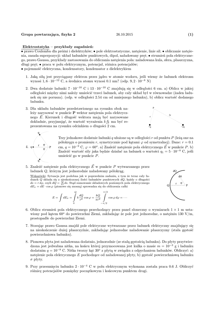 Grupa powtarzająca, fizyka 2 26.10.2015 (1) Elektrostatyka – przykłady zagadnień: • prawo Coulomba dla próżni i dielektryków; • pole elektrostatyczne, natężenie, linie sił; • obliczanie natężenia, zasada superpozycji: układ ładunków punktowych, dipol, naładowany pręt; • strumień pola elektrycznego, prawo Gaussa, przykłady zastosowania do obliczania natężenia pola: naładowana kula, sfera, płaszczyzna, długi pręt; • praca w polu elektrycznym, potencjał, różnica potencjałów; • pojemność elektryczna, kondensatory, kondensator z dielektrykiem 1. Jaką siłą jest przyciągany elektron przez jądro w atomie wodoru, jeśli wiemy że ładunek elektronu wynosi 1, 6 · 10−12 C, a średnica atomu wynosi 0.1 nm? (odp. 9, 2 · 10−8 N) 2. Dwa dodatnie ładunki 7 · 10−10 C i 13 · 10−10 C znajdują się w odległości 6 cm. a) Oblicz w jakiej odległości między nimi należy umieścić trzeci ładunek, aby cały układ był w równowadze (żaden ładunek się nie porusza). (odp. w odległości 2.54 cm od mniejszego ładunku), b) oblicz wartość dodanego ładunku. 3. Dla układu ładunków przedstawionego na rysunku obok należy narysować w punkcie P wektor natężenia pola elektrycz~ Kierunek i długość wektora mają być narysowane nego E. dokładnie, przyjmująć, że wartość wyrażenia k rq2 ma być reprezentowana na rysunku odcinkiem o długości 2 cm. P r 2r +q −2q q 4. q r ϕ ϕ Trzy jednakowe dodatnie ładunki q ułożone są w odległości r od punktu P (leżą one na półokręgu o promieniu r, symetrycznie pod kątami ϕ od symetralnej). Dane: r = 0.1 ~ w punkcie P . b) cm, q = 10−9 C, ϕ = 60o . a) Znaleźć natężenie pola elektrycznego E Znaleźć wartość siły jaka będzie działać na ładunek o wartości q1 = 5 · 10−8 C, jeśli umieścić go w punkcie P . P q ~ w punkcie P wytwarzanego przez 5. Znaleźć natężenie pola elektrycznego E ładunek Q, którym jest jednorodnie naładowany półokrąg. Wskazówki: Sytuacja jest podobna jak w poprzednim zadaniu, z tym że teraz cały ładunek Q składa się z nieskończonej ilości ładunków punktowych dQ, każdy o długości Q ds = r dϕ, czyli dQ = πr ds. Stąd sumowanie składowych poziomych pola elektrycznego dEx = dE · cos ϕ (pionowe się znoszą) sprowadza się do obliczenia całki E= Z dEx = ZQ 0 kQ dQ k 2 cos ϕ = r πr 2 Zπ/2 dQ dϕ Q r ϕ P cos ϕ dϕ = · · · −π/2 6. Oblicz strumień pola elektrycznego przechodzący przez panel słoneczny o wymiarach 1 × 1 m ustawiony pod kątem 60o do powierzchni Ziemi, zakładając że pole jest jednorodne, o natężniu 130 V/m, prostopadłe do powierzchni Ziemi. 7. Stosując prawo Gaussa znajdź pole elektryczne wytwarzane przez ładunek elektryczny znajdujący się na nieskończenie dużej płaszczyźnie, zakładając jednorodne naładowanie płaszczyzny (stała gęstość powierzchniowa ładunku). 8. Pionowa płyta jest naładowana dodatnio, jednorodnie (ze stałą gęstością ładunku). Do płyty przytwierdzona jest jedwabna nitka, na końcu której przymocowana jest kulka o masie m = 10−3 g i ładunku dodatnim q = 10−8 C. Nitka tworzy kąt 30o z płytą w związku z odpychaniem ładunków. Obliczyć: a) natężenie pola elektrycznego E pochodzące od naładowanej płyty, b) gęstość powierzchniową ładunku σ płyty. 9. Przy przesunięciu ładunku 2 · 10−4 C w polu elektrycznym wykonana została praca 0.6 J. Obliczyć różnicę potencjałów pomiędzy początkowym i końcowym punktem drogi.