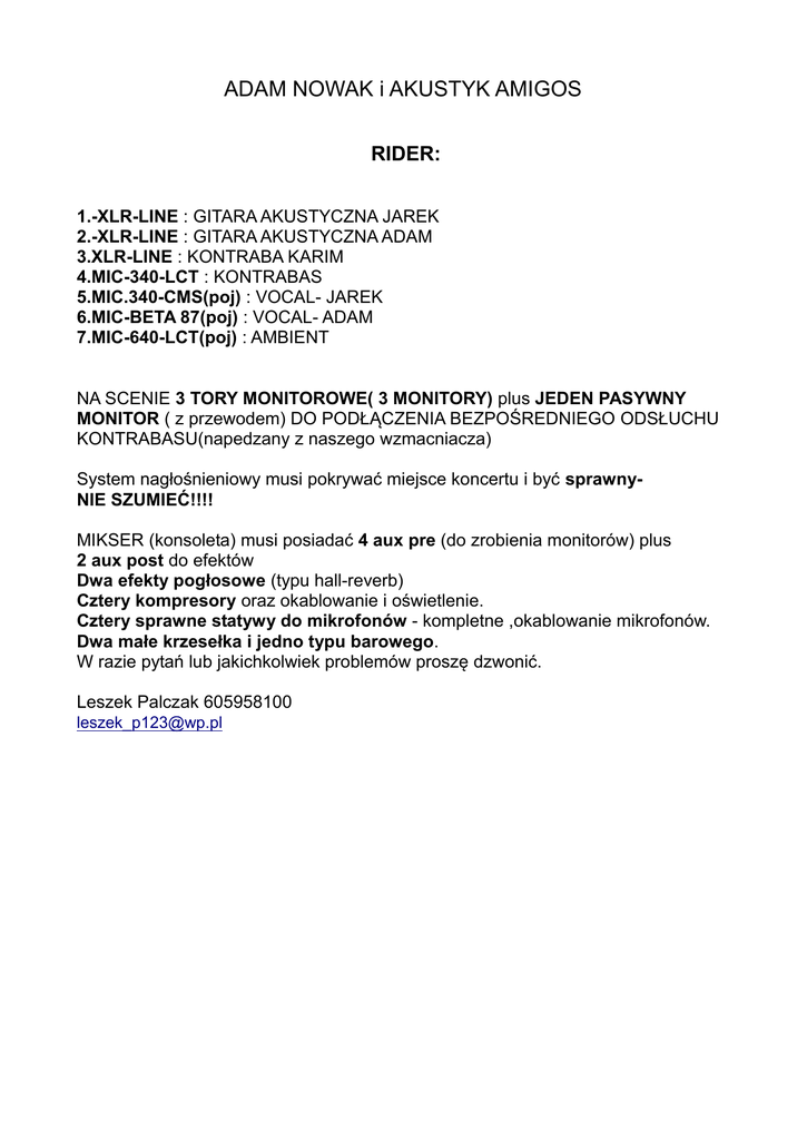 ADAM NOWAK i AKUSTYK AMIGOS RIDER: 1.-XLR-LINE : GITARA AKUSTYCZNA JAREK 2.-XLR-LINE : GITARA AKUSTYCZNA ADAM 3.XLR-LINE : KONTRABA KARIM 4.MIC-340-LCT : KONTRABAS 5.MIC.340-CMS(poj) : VOCAL- JAREK 6.MIC-BETA 87(poj) : VOCAL- ADAM 7.MIC-640-LCT(poj) : AMBIENT NA SCENIE 3 TORY MONITOROWE( 3 MONITORY) plus JEDEN PASYWNY MONITOR ( z przewodem) DO PODŁĄCZENIA BEZPOŚREDNIEGO ODSŁUCHU KONTRABASU(napedzany z naszego wzmacniacza) System nagłośnieniowy musi pokrywać miejsce koncertu i być sprawnyNIE SZUMIEĆ!!!! MIKSER (konsoleta) musi posiadać 4 aux pre (do zrobienia monitorów) plus 2 aux post do efektów Dwa efekty pogłosowe (typu hall-reverb) Cztery kompresory oraz okablowanie i oświetlenie. Cztery sprawne statywy do mikrofonów - kompletne ,okablowanie mikrofonów. Dwa małe krzesełka i jedno typu barowego. W razie pytań lub jakichkolwiek problemów proszę dzwonić. Leszek Palczak 605958100 [email protected]