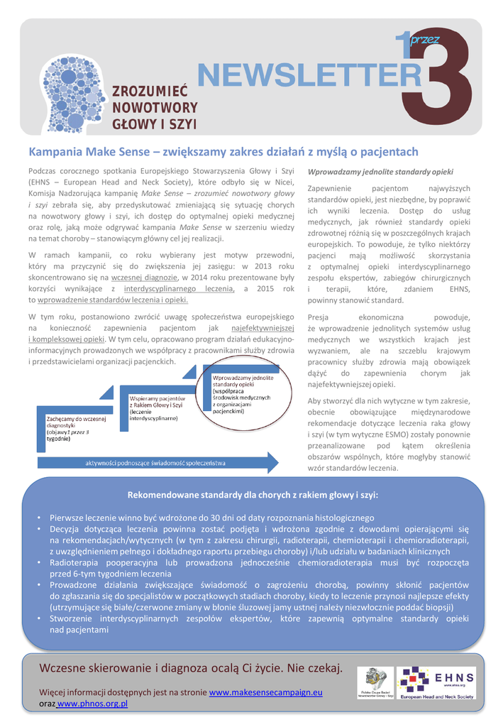 Kampania Make Sense – zwiększamy zakres działań z myślą o pacjentach Podczas corocznego spotkania Europejskiego Stowarzyszenia Głowy i Szyi (EHNS – European Head and Neck Society), które odbyło się w Nicei, Komisja Nadzorująca kampanię Make Sense – zrozumieć nowotwory głowy i szyi zebrała się, aby przedyskutować zmieniającą się sytuację chorych na nowotwory głowy i szyi, ich dostęp do optymalnej opieki medycznej oraz rolę, jaką może odgrywać kampania Make Sense w szerzeniu wiedzy na temat choroby – stanowiącym główny cel jej realizacji. W ramach kampanii, co roku wybierany jest motyw przewodni, który ma przyczynić się do zwiększenia jej zasięgu: w 2013 roku skoncentrowano się na wczesnej diagnozie, w 2014 roku prezentowane były korzyści wynikające z interdyscyplinarnego leczenia, a 2015 rok to wprowadzenie standardów leczenia i opieki. W tym roku, postanowiono zwrócić uwagę społeczeństwa europejskiego na konieczność zapewnienia pacjentom jak najefektywniejszej i kompleksowej opieki. W tym celu, opracowano program działań edukacyjnoinformacyjnych prowadzonych we współpracy z pracownikami służby zdrowia i przedstawicielami organizacji pacjenckich. Wprowadzamy jednolite standardy opieki Zapewnienie pacjentom najwyższych standardów opieki, jest niezbędne, by poprawić ich wyniki leczenia. Dostęp do usług medycznych, jak również standardy opieki zdrowotnej różnią się w poszczególnych krajach europejskich. To powoduje, że tylko niektórzy pacjenci mają możliwość skorzystania z optymalnej opieki interdyscyplinarnego zespołu ekspertów, zabiegów chirurgicznych i terapii, które, zdaniem EHNS, powinny stanowić standard. Presja ekonomiczna powoduje, że wprowadzenie jednolitych systemów usług medycznych we wszystkich krajach jest wyzwaniem, ale na szczeblu krajowym pracownicy służby zdrowia mają obowiązek dążyć do zapewnienia chorym jak najefektywniejszej opieki. Aby stworzyć dla nich wytyczne w tym zakresie, obecnie obowiązujące międzynarodowe rekomendacje dotyczące leczenia raka głowy i szyi (w tym wytyczne ESMO) zostały ponownie przeanalizowane pod kątem określenia obszarów wspólnych, które mogłyby stanowić wzór standardów leczenia. Rekomendowane standardy dla chorych z rakiem głowy i szyi: • Pierwsze leczenie winno być wdrożone do 30 dni od daty rozpoznania histologicznego • Decyzja dotycząca leczenia powinna zostać podjęta i wdrożona zgodnie z dowodami opierającymi się na rekomendacjach/wytycznych (w tym z zakresu chirurgii, radioterapii, chemioterapii i chemioradioterapii, z uwzględnieniem pełnego i dokładnego raportu przebiegu choroby) i/lub udziału w badaniach klinicznych • Radioterapia pooperacyjna lub prowadzona jednocześnie chemioradioterapia musi być rozpoczęta przed 6-tym tygodniem leczenia • Prowadzone działania zwiększające świadomość o zagrożeniu chorobą, powinny skłonić pacjentów do zgłaszania się do specjalistów w początkowych stadiach choroby, kiedy to leczenie przynosi najlepsze efekty (utrzymujące się białe/czerwone zmiany w błonie śluzowej jamy ustnej należy niezwłocznie poddać biopsji) • Stworzenie interdyscyplinarnych zespołów ekspertów, które zapewnią optymalne standardy opieki nad pacjentami Wczesne skierowanie i diagnoza ocalą Ci życie. Nie czekaj. Więcej informacji dostępnych jest na stronie www.makesensecampaign.eu oraz www.phnos.org.pl Organizacje pacjenckie – wspólnym głosem na rzecz chorych organizacje pacjenckie W 2015 roku do współpracy w ramach Kampanii Make Sense – Zrozumieć nowotwory głowy i szyi zaprosimy organizacje pacjenckie, aby pogłębić ich wiedzę na temat wsparcia, jakiego potrzebują osoby cierpiące z powodu raka głowy i szyi. Pięć z nich stworzyło międzynarodową koalicję grup pacjenckich, która obecnie zrzesza już 10 organizacji. Ich celem jest stworzenie sieci, która umożliwi wymianę wiedzy dotyczącej informacji klinicznych/ postępu w zakresie opieki medycznej, optymalnego leczenia i emocjonalnego wsparcia dla pacjentów. PACJENT Na początku czerwca 2015 r. w Berlinie odbyło się spotkanie ich przedstawicieli, którzy opracowali program działań umożliwiający powołanie Koalicji Pacjentów Kampanii Make Sense. Przewidujemy, że w kolejnych latach trwania kampanii, wspomniana koalicja stanie się kluczowym doradcą w obszarach, które mają największe znaczenie dla pacjentów w kontekście zapewnienia efektywnej terapii. Zaangażuj się! Działania wspierające dążenia do zapewnienia chorym efektywnej opieki medycznej będą również prowadzone w ramach tegorocznego III Europejskiego Tygodnia Profilaktyki Nowotworów Głowy i Szyi, który odbędzie się w dniach 21-25 września. Dodatkowe informacje nt. Tygodnia Profilaktyki oraz szczegóły dotyczące sposobu, w jaki możesz wesprzeć kampanię, są dostępne na stronie internetowej: www.makesensecampaign.eu oraz www.phnos.org.pl 1. 2. 3. 4. 5. 6. 7. 8. 9. 10. Członkowie Koalicji Pacjentów: Belgia: Antwerpse Vereniging voor Gelaryngectomeerden Chorwacja: Croatian Club of Laryngectomes Europa: European Cancer Patient Coalition Francja: Union des Associations Françaises des Laryngectomises et Mutiles de la Voix Holandia: NSvG Polska: Stowarzyszenie Osób z Nowotworami Głowy i Szyi Portugalia: Associação dos Amigos dos Doentes com Cancro Oral Rosja: Help Patient.ru Turcja: Dance with Cancer Association Włochy: FIALPO Wczesne skierowanie i diagnoza ocalą Ci życie. Nie czekaj. Więcej informacji dostępnych jest na stronie www.makesensecampaign.eu oraz www.phnos.org.pl