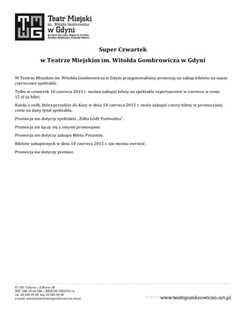 Super Czwartek w Teatrze Miejskim im. Witolda Gombrowicza w Gdyni W Teatrze Miejskim im. Witolda Gombrowicza w Gdyni przygotowaliśmy promocję na zakup biletów na nasze czerwcowe spektakle. Tylko w czwartek 18 czerwca 2015 r. można zakupić bilety na spektakle repertuarowe w czerwcu w cenie 15 zł za bilet. Każda z osób, która przyjdzie do Kasy w dniu 18 czerwca 2015 r. może zakupić cztery bilety w promocyjnej cenie na dany tytuł spektaklu. Promocja nie dotyczy spektaklu „Żółta Łódź Podwodna”. Promocja nie łączy się z innymi promocjami. Promocja nie dotyczy zakupu Biletu Prezentu. Biletów zakupionych w dniu 18 czerwca 2015 r. nie można zwrócić. Promocja nie dotyczy premier.