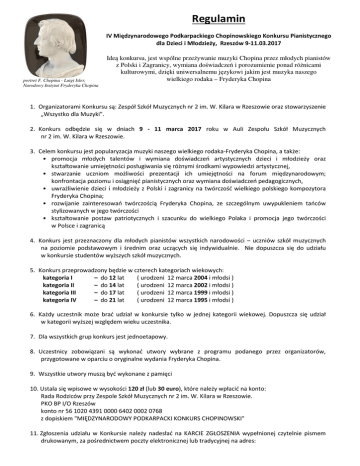 Regulamin IV Międzynarodowego Podkarpackiego Chopinowskiego Konkursu Pianistycznego dla Dzieci i Młodzieży, Rzeszów 9-11.03.2017 portret F. Chopina - Luigi Isler, Narodowy Instytut Fryderyka Chopina Ideą konkursu, jest wspólne przeżywanie muzyki Chopina przez młodych pianistów z Polski i Zagranicy, wymiana doświadczeń i porozumienie ponad różnicami kulturowymi, dzięki uniwersalnemu językowi jakim jest muzyka naszego wielkiego rodaka – Fryderyka Chopina 1. Organizatorami Konkursu są: Zespół Szkół Muzycznych nr 2 im. W. Kilara w Rzeszowie oraz stowarzyszenie „Wszystko dla Muzyki”. 2. Konkurs odbędzie się w dniach 9 - 11 marca 2017 roku w Auli Zespołu Szkół Muzycznych nr 2 im. W. Kilara w Rzeszowie. 3. Celem konkursu jest popularyzacja muzyki naszego wielkiego rodaka-Fryderyka Chopina, a także: • promocja młodych talentów i wymiana doświadczeń artystycznych dzieci i młodzieży oraz kształtowanie umiejętności posługiwania się różnymi środkami wypowiedzi artystycznej, • stwarzanie uczniom możliwości prezentacji ich umiejętności na forum międzynarodowym; konfrontacja poziomu i osiągnięć pianistycznych oraz wymiana doświadczeń pedagogicznych, • uwrażliwienie dzieci i młodzieży z Polski i zagranicy na twórczość wielkiego polskiego kompozytora Fryderyka Chopina; • rozwijanie zainteresowań twórczością Fryderyka Chopina, ze szczególnym uwypukleniem tańców stylizowanych w jego twórczości • kształtowanie postaw patriotycznych i szacunku do wielkiego Polaka i promocja jego twórczości w Polsce i zagranicą 4. Konkurs jest przeznaczony dla młodych pianistów wszystkich narodowości – uczniów szkół muzycznych na poziomie podstawowym i średnim oraz uczących się indywidualnie. Nie dopuszcza się do udziału w konkursie studentów wyższych szkół muzycznych. 5. Konkurs przeprowadzony będzie w czterech kategoriach wiekowych: kategoria I – do 12 lat ( urodzeni 12 marca 2004 i młodsi ) kategoria II – do 14 lat ( urodzeni 12 marca 2002 i młodsi ) kategoria III – do 17 lat ( urodzeni 12 marca 1999 i młodsi ) kategoria IV – do 21 lat ( urodzeni 12 marca 1995 i młodsi ) 6. Każdy uczestnik może brać udział w konkursie tylko w jednej kategorii wiekowej. Dopuszcza się udział w kategorii wyższej względem wieku uczestnika. 7. Dla wszystkich grup konkurs jest jednoetapowy. 8. Uczestnicy zobowiązani są wykonać utwory wybrane z programu podanego przez organizatorów, przygotowane w oparciu o oryginalne wydania Fryderyka Chopina. 9. Wszystkie utwory muszą być wykonane z pamięci 10. Ustala się wpisowe w wysokości 120 zł (lub 30 euro), które należy wpłacić na konto: Rada Rodziców przy Zespole Szkół Muzycznych nr 2 im. W. Kilara w Rzeszowie. PKO BP I/O Rzeszów konto nr 56 1020 4391 0000 6402 0002 0768 z dopiskiem "MIĘDZYNARODOWY PODKARPACKI KONKURS CHOPINOWSKI" 11. Zgłoszenia udziału w Konkursie należy nadesłać na KARCIE ZGŁOSZENIA wypełnionej czytelnie pismem drukowanym, za pośrednictwem poczty elektronicznej lub tradycyjnej na adres: Zespół Szkół Muzycznych nr 2 im. W. Kilara ul. J. III Sobieskiego 15 35-002 Rzeszów Do KARTY ZGŁOSZENIA należy dołączyć kserokopię potwierdzenia wpłaty wpisowego. 12. Ostateczny termin nadsyłania zgłoszeń to 15 stycznia 2017 r. Przesłanie zgłoszenia po terminie uniemożliwi umieszczenie nazwisk uczestników w programie konkursu. 13. W przypadku rezygnacji z udziału w konkursie opłata wpisowa nie podlega zwrotowi. 14. W skład Jury Konkursu wejdą wybitni pianiści i pedagodzy a przewodniczącym Jury będzie prof. Andrzej Jasiński z AM w Katowicach 15. Werdykt Jury jest ostateczny, nieodwołalny i niezaskarżalny. 16. Prezentacje utworów Jury ocenia w skali od 1 do 25 punktów. 17. Laureatem może zostać uczestnik, który otrzyma minimum 21 punktów. 18. O podziale nagród i wyróżnień, decyduje wyłącznie Jury. 19. Po ogłoszeniu wyników konkursu zostanie zorganizowane spotkanie uczestników konkursu z Jurorami, podczas którego Jurorzy będą mogli podzielić się swoimi refleksjami dotyczącymi występów konkursowych oraz udzielić indywidualnych konsultacji. 20. Wszelkie koszty związane z udziałem w konkursie tj. podróż, noclegi oraz wyżywienie pokrywają uczestnicy. Uczestnicy konkursu we własnym zakresie rezerwują miejsca noclegowe. 21. Koszty przelewu wpisowego, pokrywają uczestnicy bądź instytucje delegujące. 22. O przyjęciu zgłoszenia decyduje data stempla pocztowego. 23. Każdy uczestnik otrzyma program przesłuchań. Przesłanie zgłoszenia po terminie uniemożliwi umieszczenie nazwiska ucznia w programie. 24. Dla laureatów trzech pierwszych miejsc w każdej grupie przewidziane są atrakcyjne nagrody 25. Zgłoszenie uczestnictwa oznacza akceptację wszystkich warunków zawartych w regulaminie Konkursu, bez możliwości odwołania. 26. Wszystkie przesłuchania konkursowe będą przeprowadzane publicznie i włącznie z koncertem laureatów mogą być bez jakiejkolwiek odpłatności, za zgodą Komitetu Organizacyjnego, transmitowane przez radio, telewizję oraz rejestrowane, nagrywane, filmowane, fotografowane, a następnie rozpowszechniane przez upoważnione instytucje. 27. Laureaci są zobowiązani do wzięcia udziału w uroczystym koncercie na zakończenie Konkursu. Program koncertu laureatów ustala Jury. 28. Kolejność uczestników zostanie ustalona po zamknięciu listy zgłoszeń. Szczegółowe informacje dotyczące listy uczestników oraz godzinowego planu przesłuchań i prób będą zamieszczone na stronie internetowej konkursu www.pianocompetition.rzeszow.pl . Dodatkowych informacji udziela sekretariat szkoły. Telefon / fax: (17) 748 29 96; e-mail: [email protected] Serdecznie zapraszamy do udziału w konkursie, któremu przyświecają zasady szlachetnej rywalizacji, kultu wiedzy i umiejętności oraz pragnienie umacniania poczucia patriotyzmu w młodym pokoleniu Polaków i propagowania muzyki pol